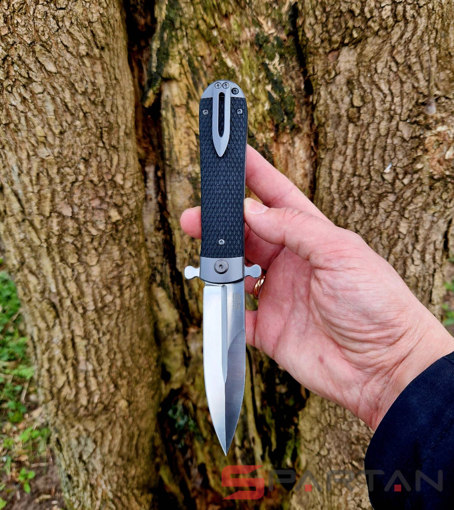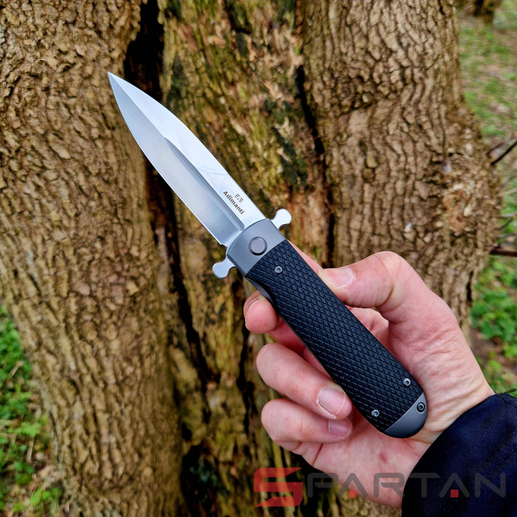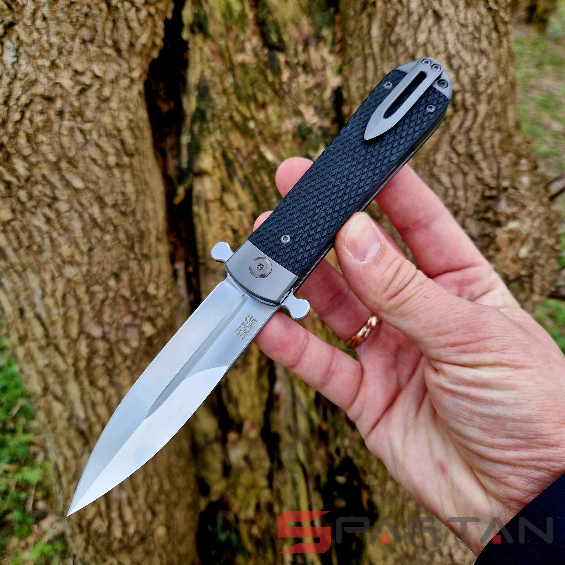 Стильный, брутальный и очень харизматичный складной нож с клинком выполненным в форме кинжала. Пара "плавников" не только выполняет роль надёжной гарды для безопасности ваших пальцев при силовом резе, но и также является одновременно флиппером и вейвером. То есть нож можно мгновенно открыть буквально одним нажатием указательного пальца на один плавник. Либо доставая из кармана также мгновенно и резко открыть клинок зацепом второго плавника за карман штанов. Благодаря наличию подшипников Adimanti Samson открывается очень быстро, с сочным щелчком. Массивная рукоять из стальной рамы прикрыта плашками из G10 с имитацией классической оружейной насечки. В навершии рукояти спрятан потайной штифт для темляка. Нож выполнен как посвящение легендарным охотничьим ножам Егора Самсонова (тульский мастер в 70-х годах XIX века, поставщик ножей Императорского общества охоты).