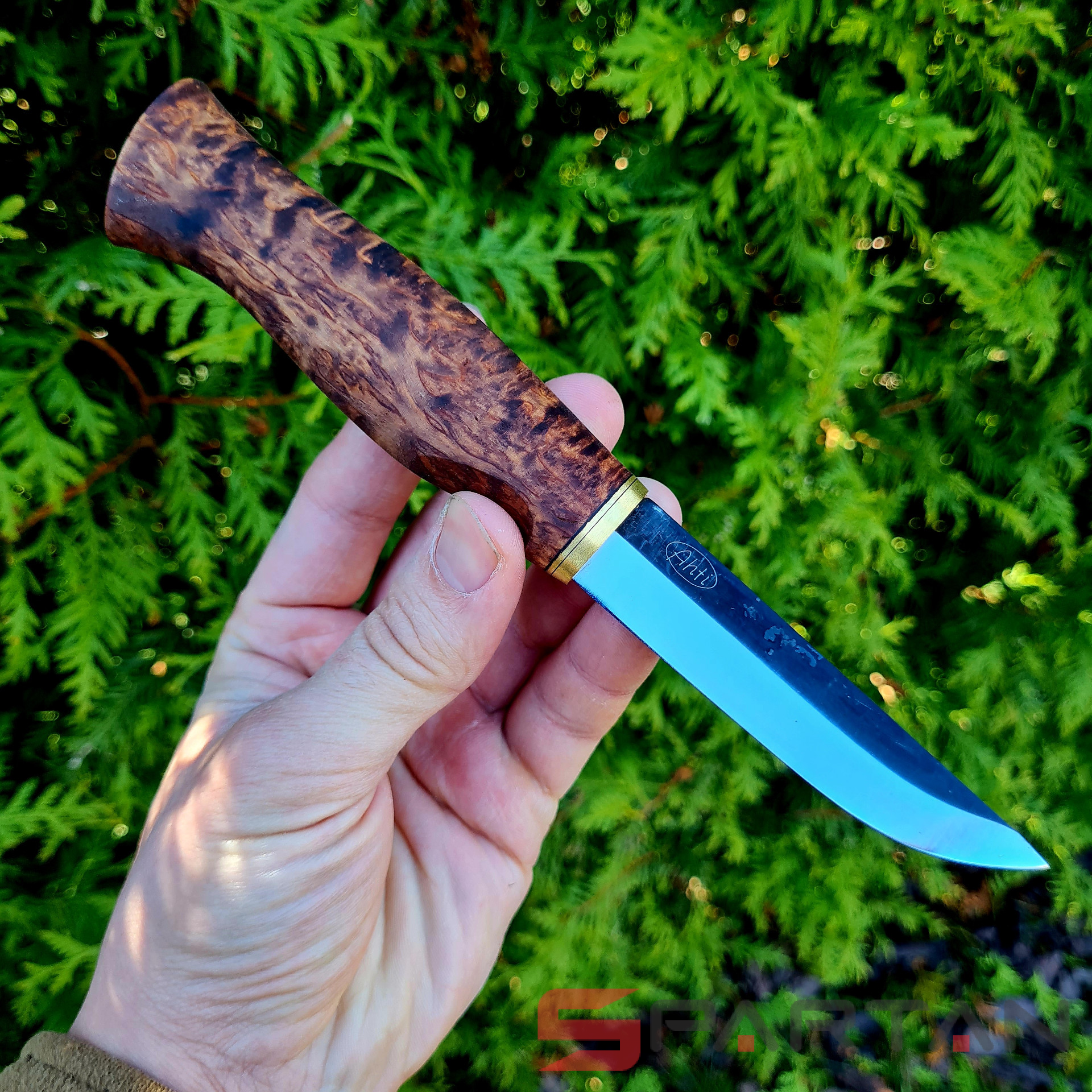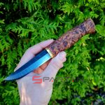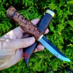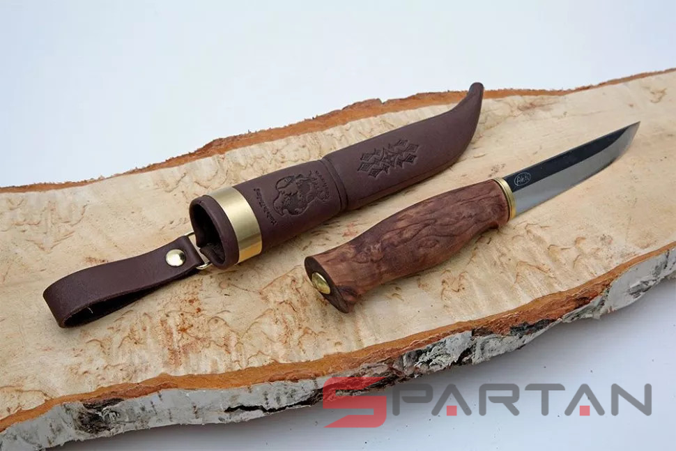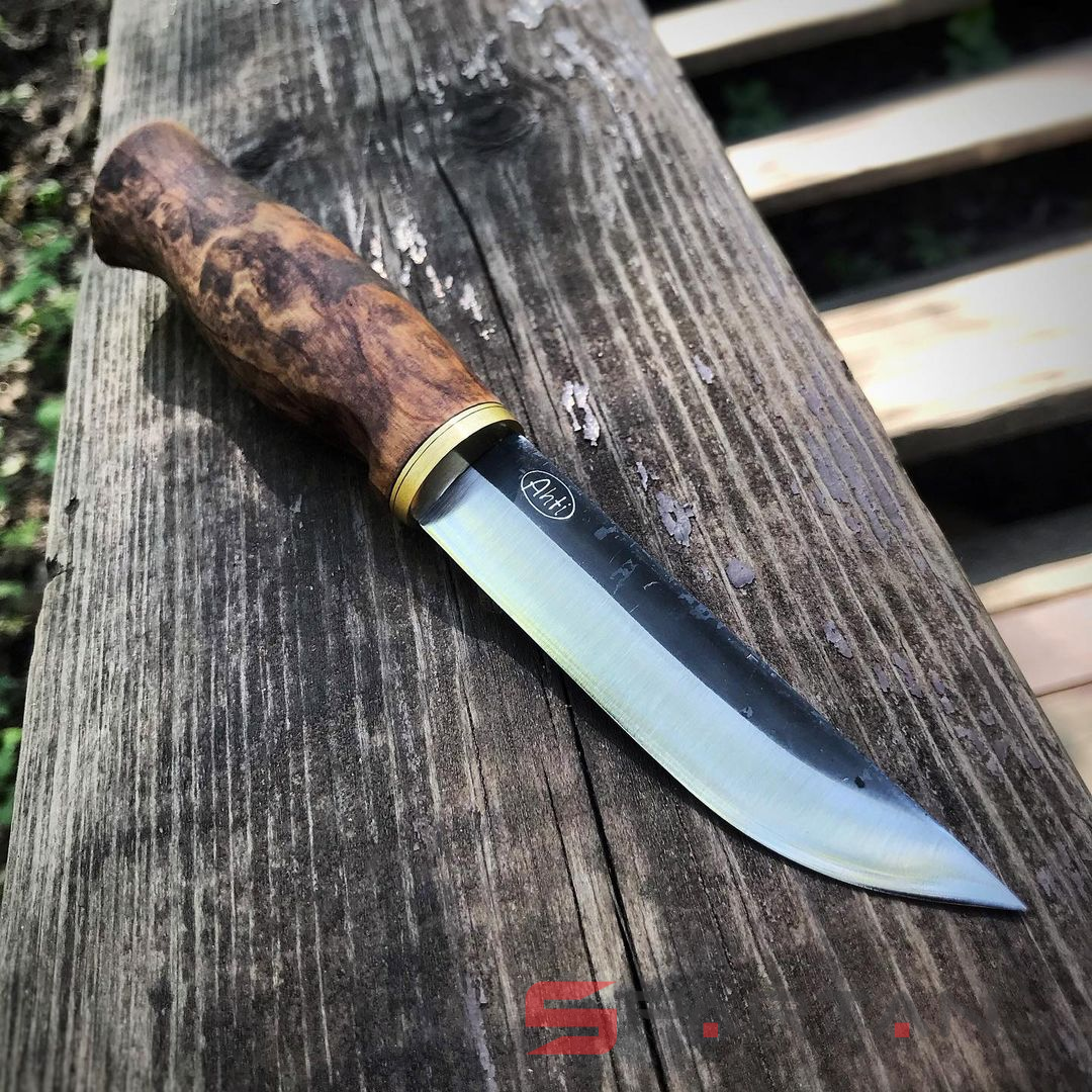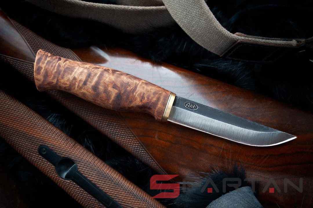 Удобный рабочий нож, с острым как бритва клинком с чёрным обухом. Ухватистая рукоятка из карельской берёзы, позволяет надёжно и безопасно работать ножом как голыми руками, так и в перчатках. Нож прекрасно центрируется в ладони и не стремится к непроизвольному провороту в руке. Финка Ahti Vaara выполнена с соблюдением традиций производства финских ножей. Ahti Vaara пригоден как скиннер для снятия шкур и как основной нож для леса. Клинок согласно традиции выполнен из тёмной углеродистой стали. На голомени клинка, как и положено, сохранена окалина и нанесена гравировка Ahti. Спуски клинка отполированы.