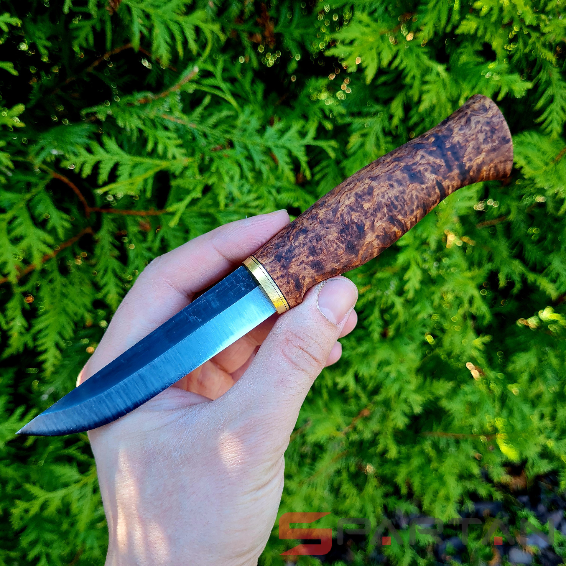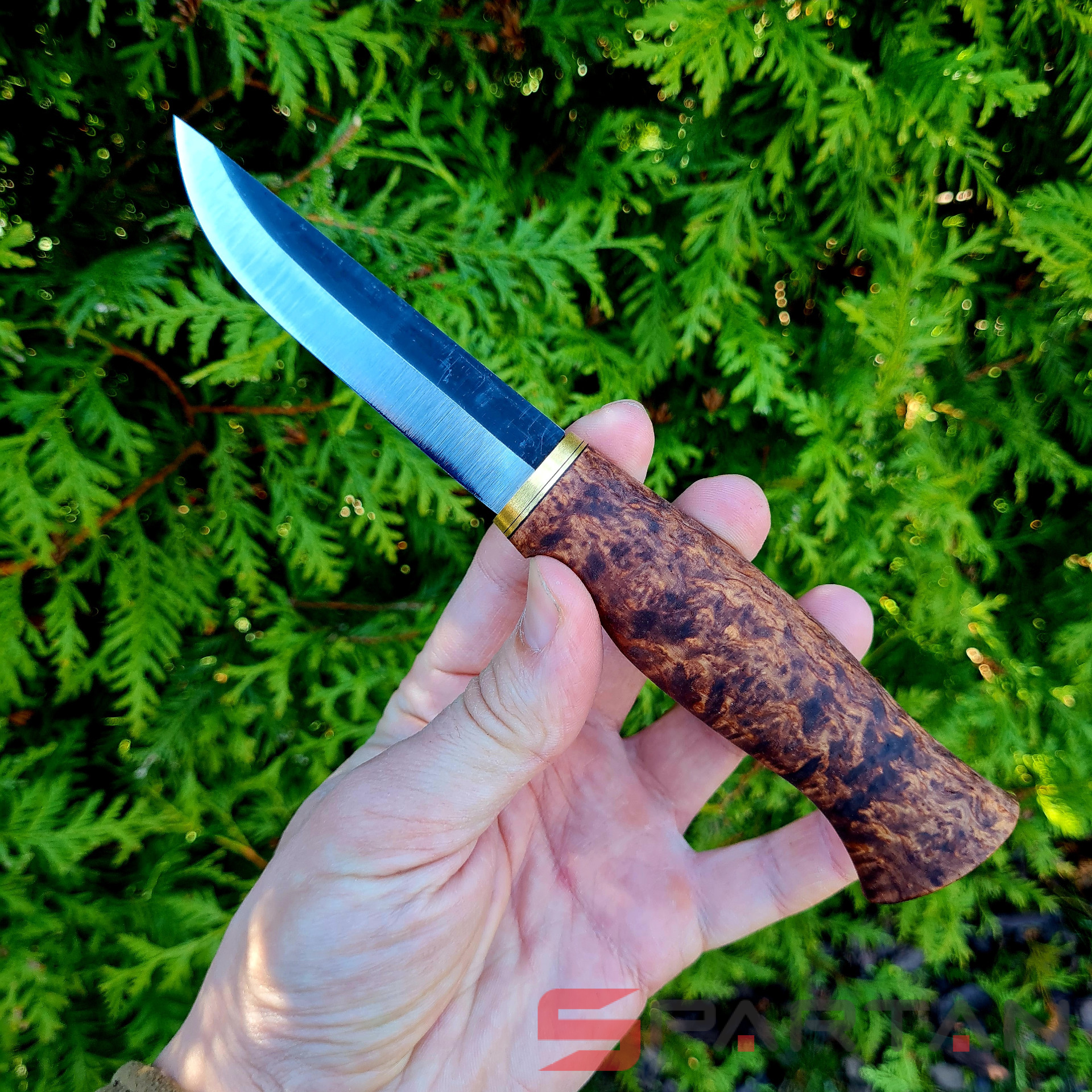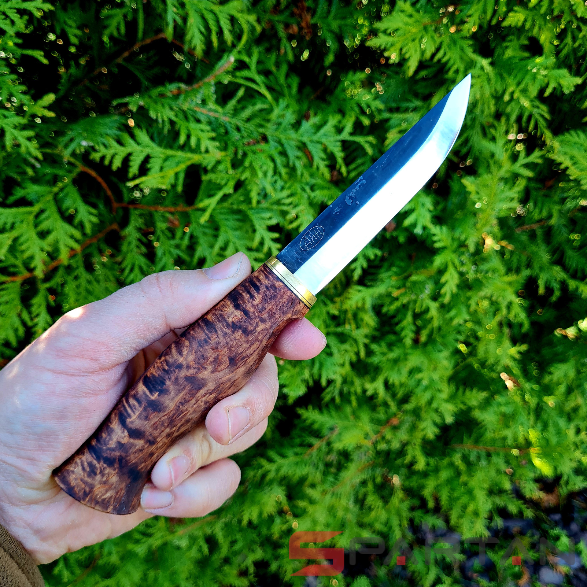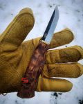 Удобный рабочий нож, с острым как бритва клинком с чёрным обухом. Ухватистая рукоятка из карельской берёзы, позволяет надёжно и безопасно работать ножом как голыми руками, так и в перчатках. Нож прекрасно центрируется в ладони и не стремится к непроизвольному провороту в руке. Финка Ahti Vaara выполнена с соблюдением традиций производства финских ножей. Ahti Vaara пригоден как скиннер для снятия шкур и как основной нож для леса. Клинок согласно традиции выполнен из тёмной углеродистой стали. На голомени клинка, как и положено, сохранена окалина и нанесена гравировка Ahti. Спуски клинка отполированы.