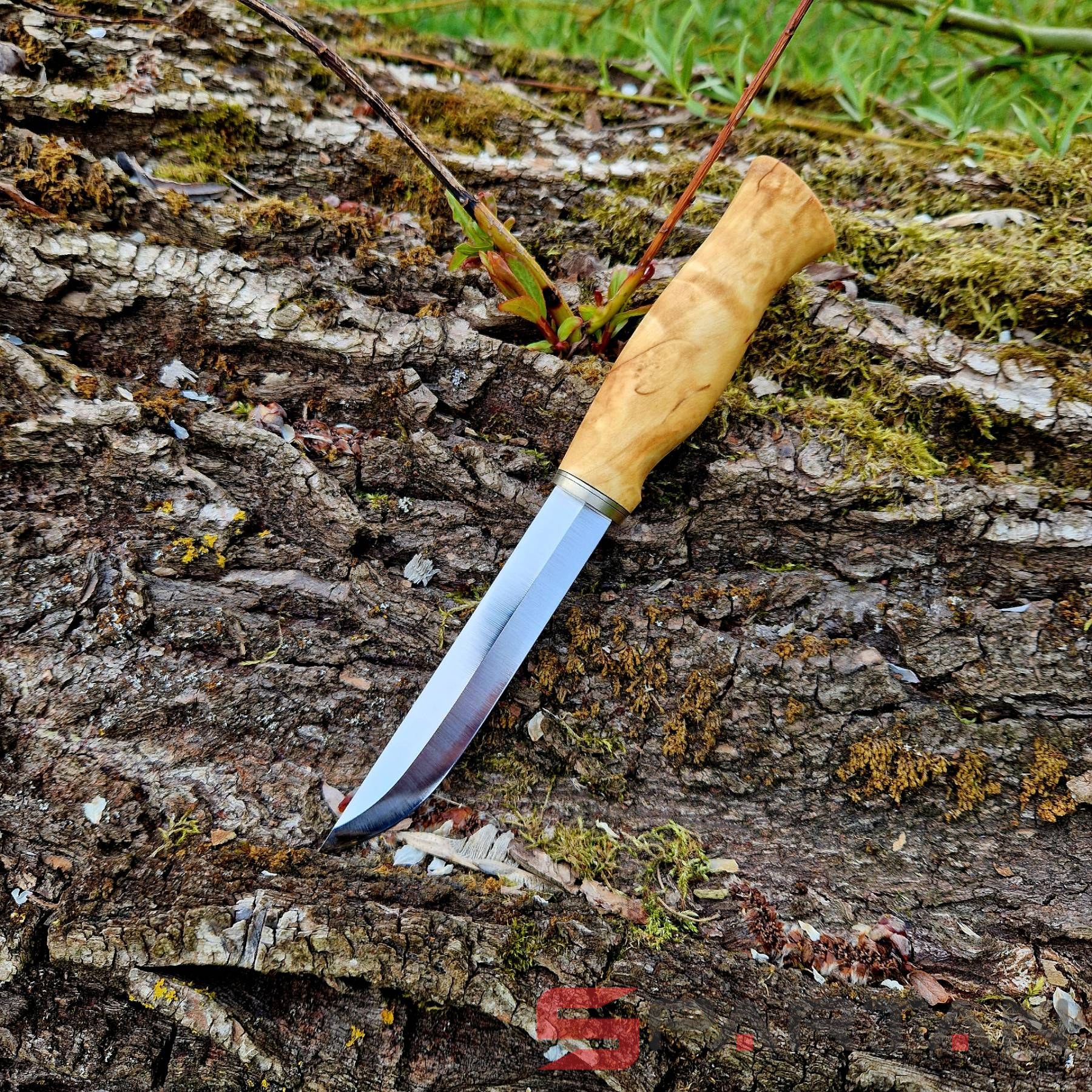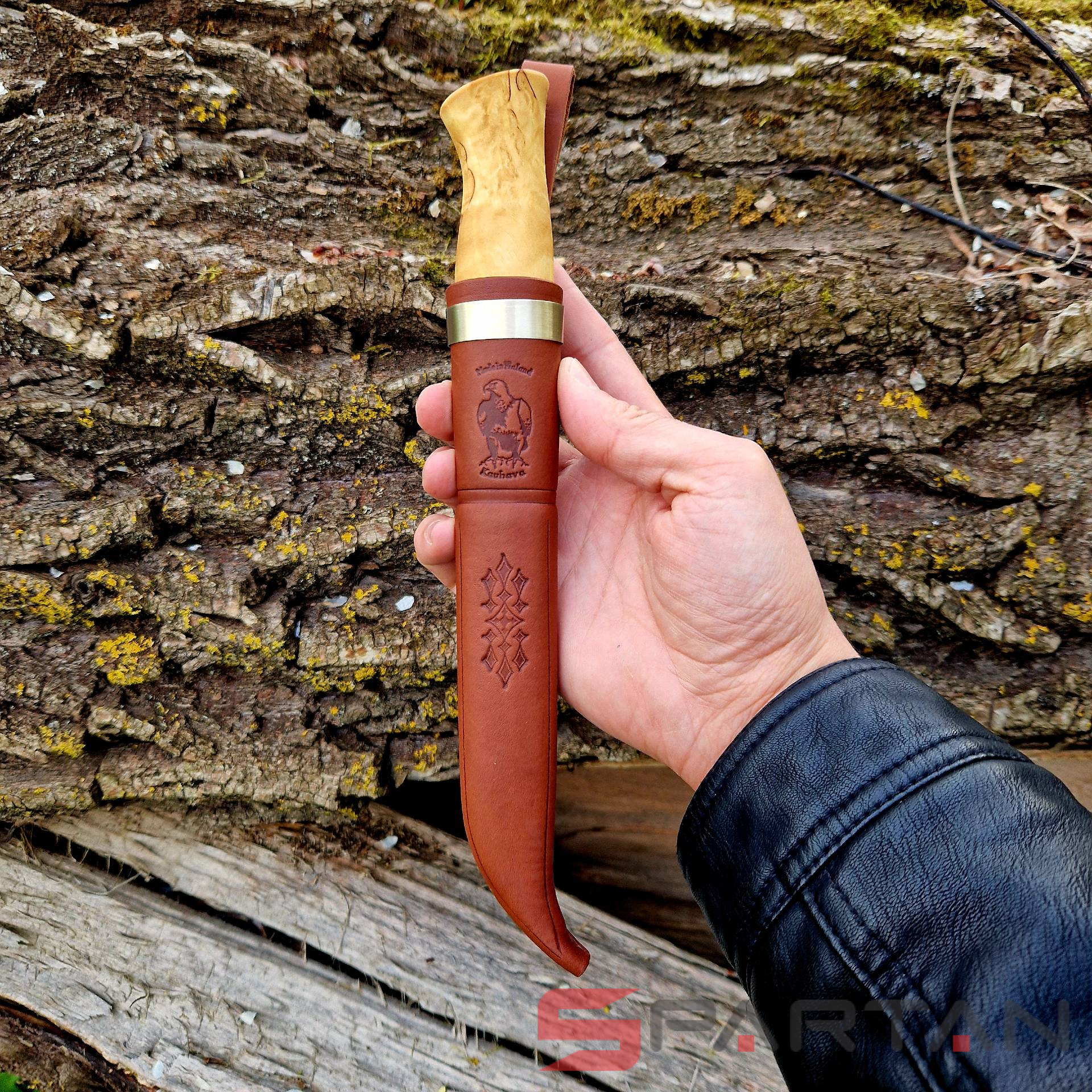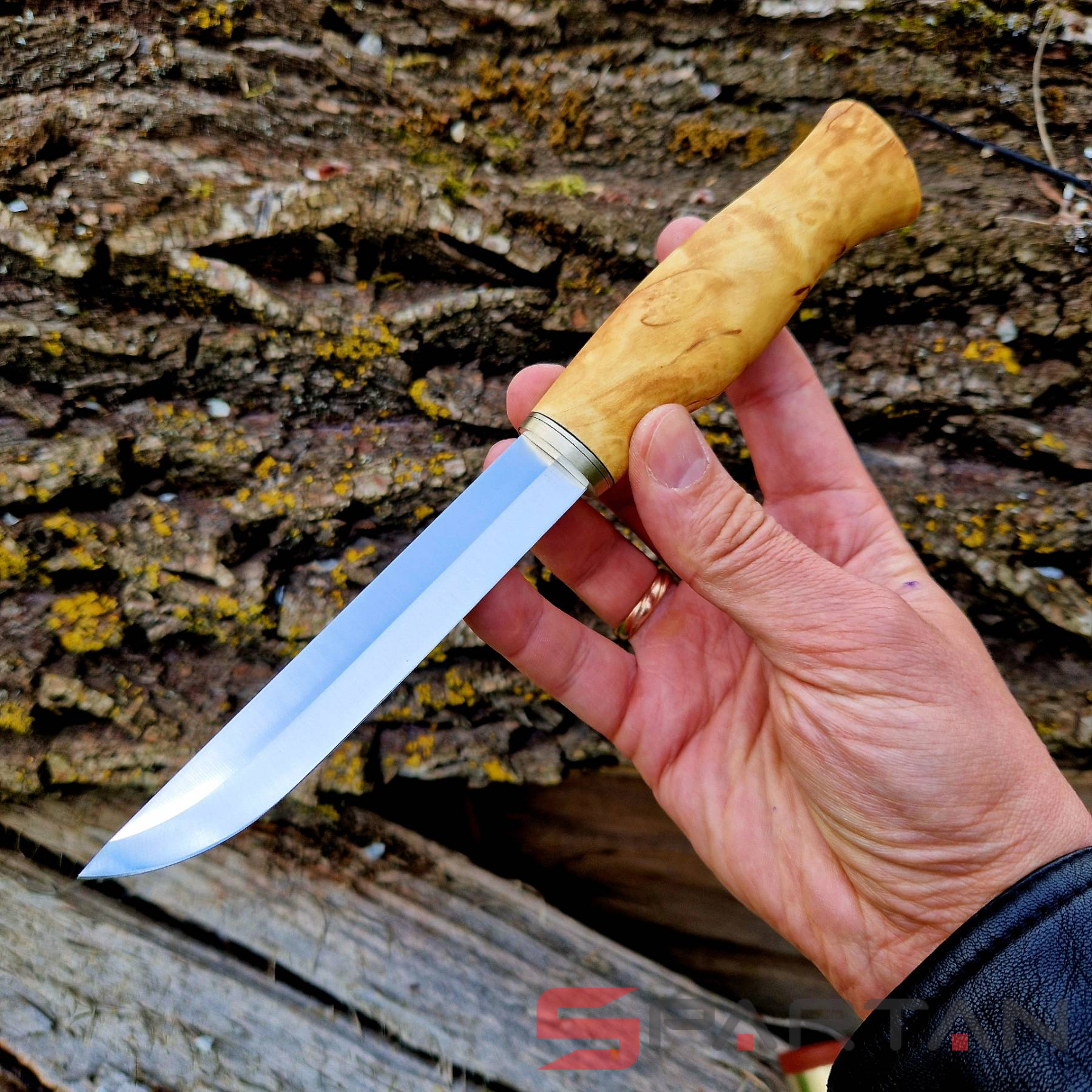 Популярная рабочая финка Ahti Vaara теперь с клинком из нержавеющей стали Sandvik 12C27 и со светлой рукояткой из карельской березы. Кроме того в отличие от классической Vaara здесь более длинный клинок - 12.5 см (против 9.5 см). В исполнении с нержавейкой рез будет не таким "вкусным" как у Vaara из углеродки (впрочем далеко не каждый сможет это заметить и ощутить), но зато не придётся щепетильно протирать клинок насухо после каждого "влажного реза". Нож прекрасно центрируется в ладони и не стремится к непроизвольному провороту в руке. Ahti Vaara пригоден как скиннер для снятия шкур и как основной нож для леса. На голомени клинка нанесена гравировка Ahti, спуски отполированы.