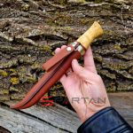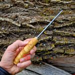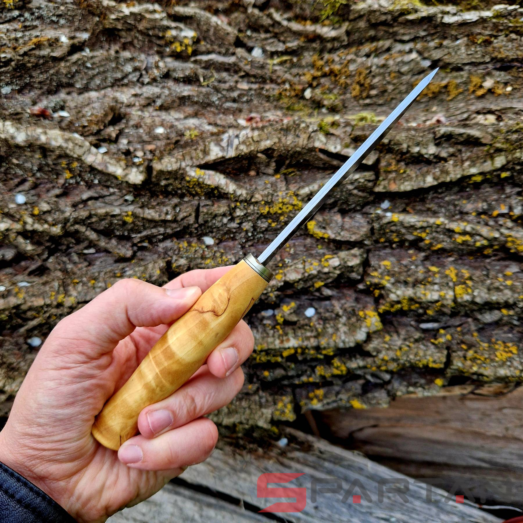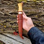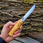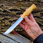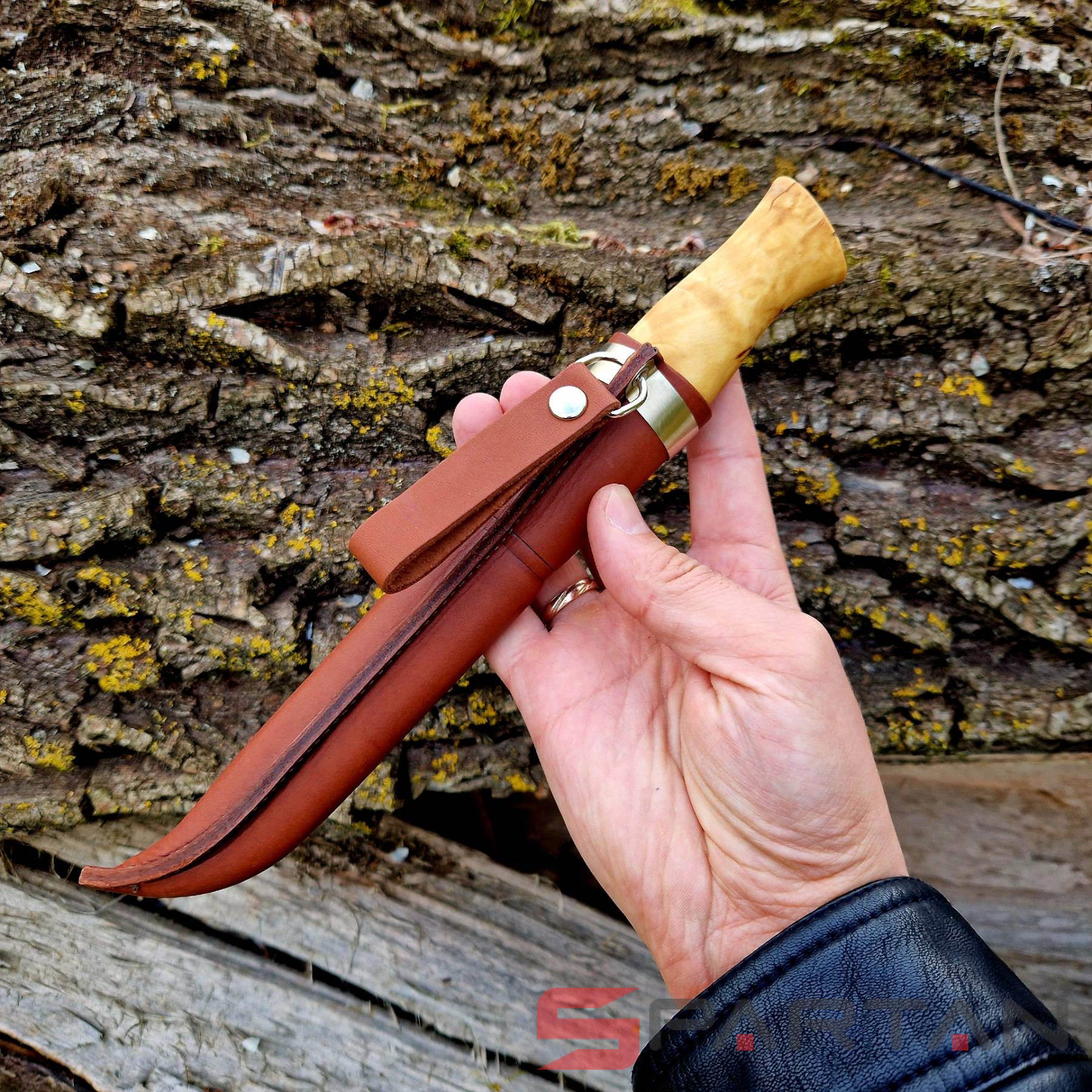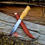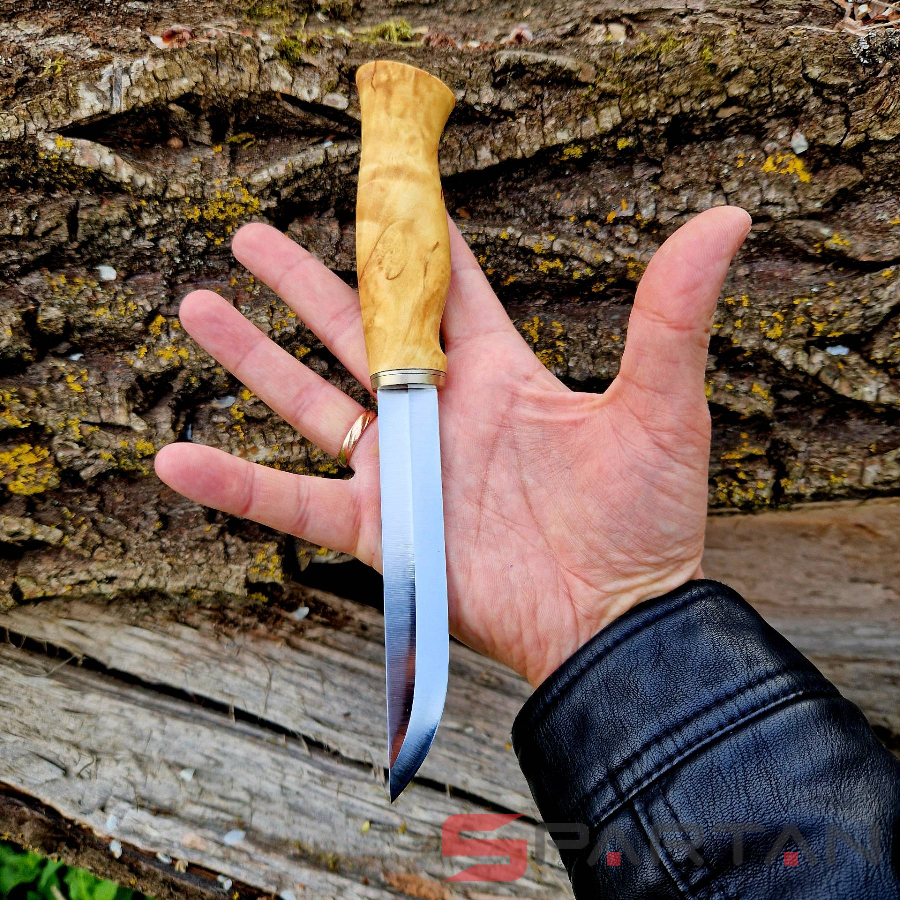Популярная рабочая финка Ahti Vaara теперь с клинком из нержавеющей стали Sandvik 12C27 и со светлой рукояткой из карельской березы. Кроме того в отличие от классической Vaara здесь более длинный клинок - 12.5 см (против 9.5 см). В исполнении с нержавейкой рез будет не таким "вкусным" как у Vaara из углеродки (впрочем далеко не каждый сможет это заметить и ощутить), но зато не придётся щепетильно протирать клинок насухо после каждого "влажного реза". Нож прекрасно центрируется в ладони и не стремится к непроизвольному провороту в руке. Ahti Vaara пригоден как скиннер для снятия шкур и как основной нож для леса. На голомени клинка нанесена гравировка Ahti, спуски отполированы.