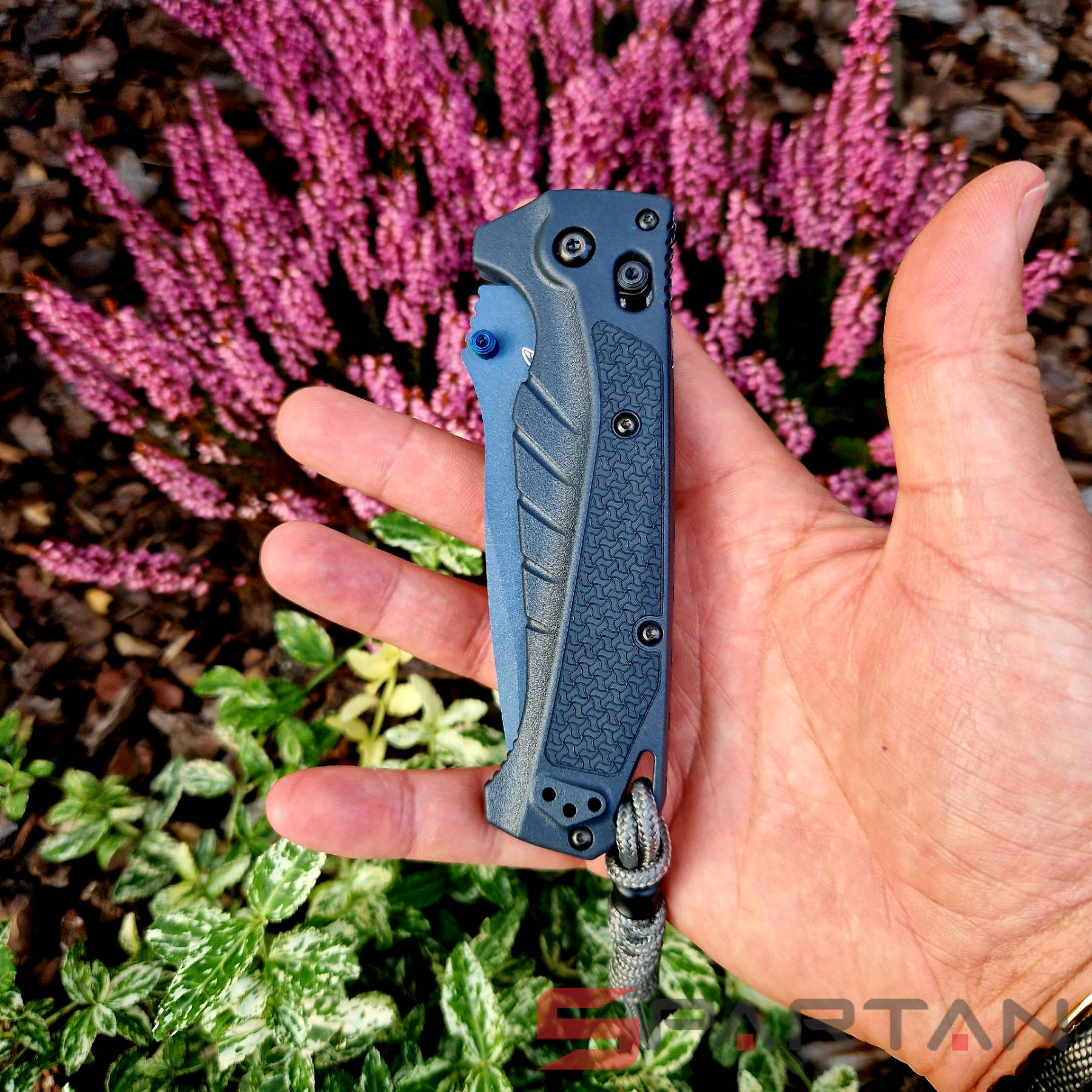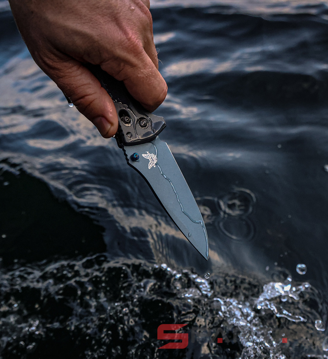 Флагман "водной" линейки Benchmade - мощный складной нож Adira в тёмном исполнении. По габаритам он может сравниться с ломовитым Adamas, но конечно предназначение и материалы у Adira совершенно другие. На клинке топовая суперсталь CPM Magnacut с защитным покрытием Cerakote цвета Blue Titanium, рукоять из термопластика Grivory тёмно-серого цвета, клипса глубокой посадки, фирменный надёжный замок AXIS и конечно безупречная механика. Спуски на 2/3 высоты клинка обеспечивают отличное сочетание реза и прочности, так что Adira смело можно гонять "и в хвост и гриву". Если вам нужен крупный складной нож который СОВЕРШЕННО не боится влаги, то Adira - это то что нужно! Этот нож созданный для работы во влажной среде, подходит для самых разных задач, он идеален для водных видов спорта, кемпинга, походов и охоты, даже в условиях повышенной влажности. Надёжный, безотказный и удобный рабочий инструмент.