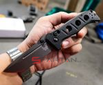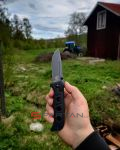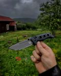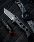 Брутальный, мощный, непобедимый. Именно как "непобедимый" и переводится Adamas с греческого. Нож не костюмный, чистая тактика, место такого не в кармане брюк, а на разгрузке или в крайнем случае на кармане джинс. Производитель посвятил Adamas рейнджерам американской армии, часть прибыли от продаж этой модели идёт в фонд помощи рейнджерам (Ranger Assistance Foundation). Разработку дизайна доверили мастеру Шейну Сиберту, его конёк - могучие боевые ножи. Основа рукоятки - массивная металлическая рама, на неё закреплены объемные накладки из пластика G10. Клинок выполнен из отличной твёрдой стали CPM Cru-Wear толщиной 3.5 mm. Весит всё это удовольствие 183 грамма. Это новая модификация "старого-доброго" Adamas: он стал легче, сталь D2 сменили на лютую Cru-Wear, стойкое защитное покрытие Cerakote (вместо чёрной краски).