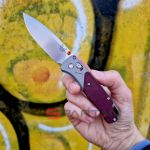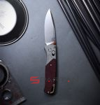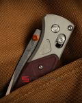 Рукоять состоит из фрезерованных накладок из Richlite тёмно-красного цвета (Redstone) и серого анодированного алюминиевого больстера. Любопытно что Richlite - это композитный материал на основе бумаги, потому ножеманы иногда называют его "Бумажная Микарта". Тонкие бумажные листы пропитываются смолой и прессуются под воздействием температуры и давления. Состав будущего бруска подбирается и компонуется вручную, что обеспечивает уникальную текстуру у каждого бруска. Richlite отличается прочностью, устойчивостью к истиранию, воздействию влаги, коррозии и рассыханию. Его поверхность имеет приятную на ощупь текстуру и легко шлифуется.