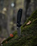 Рукоять сделана из пластика Grivory. Это очень лёгкий современный полимер, устойчивый к высоким температурам и ударным нагрузкам, основными компонентами которого являются полиамиды, сополимеры, стекловолокно и мелкие частицы кевлара. Так что нож вполне пригоден для каждодневного ношения, а в походных условиях так и вообще идеален. Рукоять удобная, достаточно толстая и хорошо лежит в руке. Никаких острых углов впивающихся в руку замечено не было, а закругленный торец позволяет, при необходимости, работать с упором в ладонь. Легкое рифление на рукояти и насечка на обухе клинка, не даёт ножу скользить даже в мокрой руке.