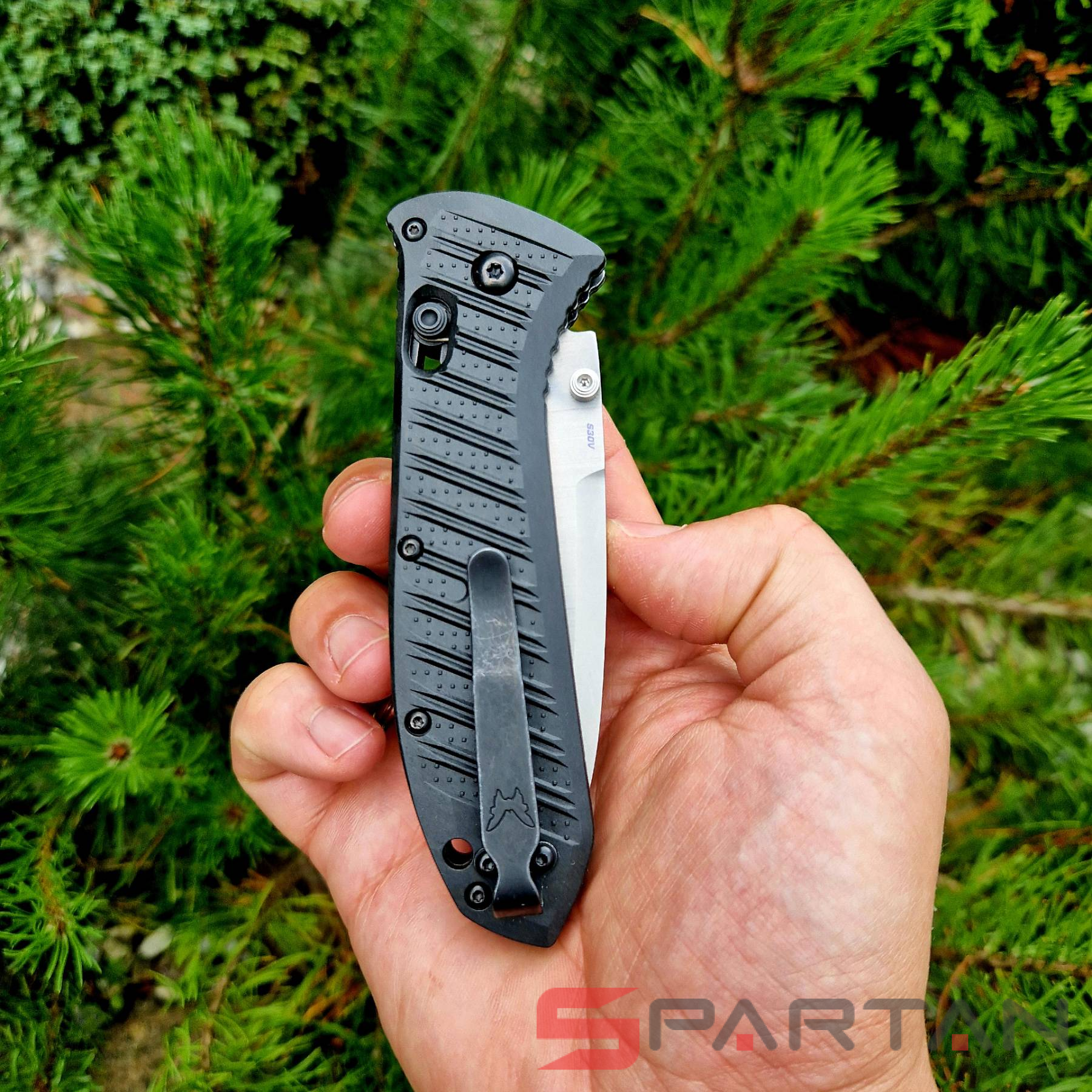 Рукоять Benchmade 570-1 Presidio II не просто сохранила все свои легендарные преимущества, но и получила дополнительные элементы, улучшающие тактические способности ножа и формирующие очевидный милитари-образ нашего красавца. Каждый обладатель ружей и карабинов сразу узнает в объемном рисунке плашек рукояти форму насечек планки Вивера или Пикатинни, и это сразу делает нож "своим" среди военного снаряжения. Открытая конструкция рукояти не просто мощна, а монументальна, и состоит из скелетизированных стальных лайнеров толщиной 1.5 мм и полимерных плашек CF-Elite. Последние выдерживают как высокие, так и низкие температуры, и способны пережить сильную ударную нагрузку.