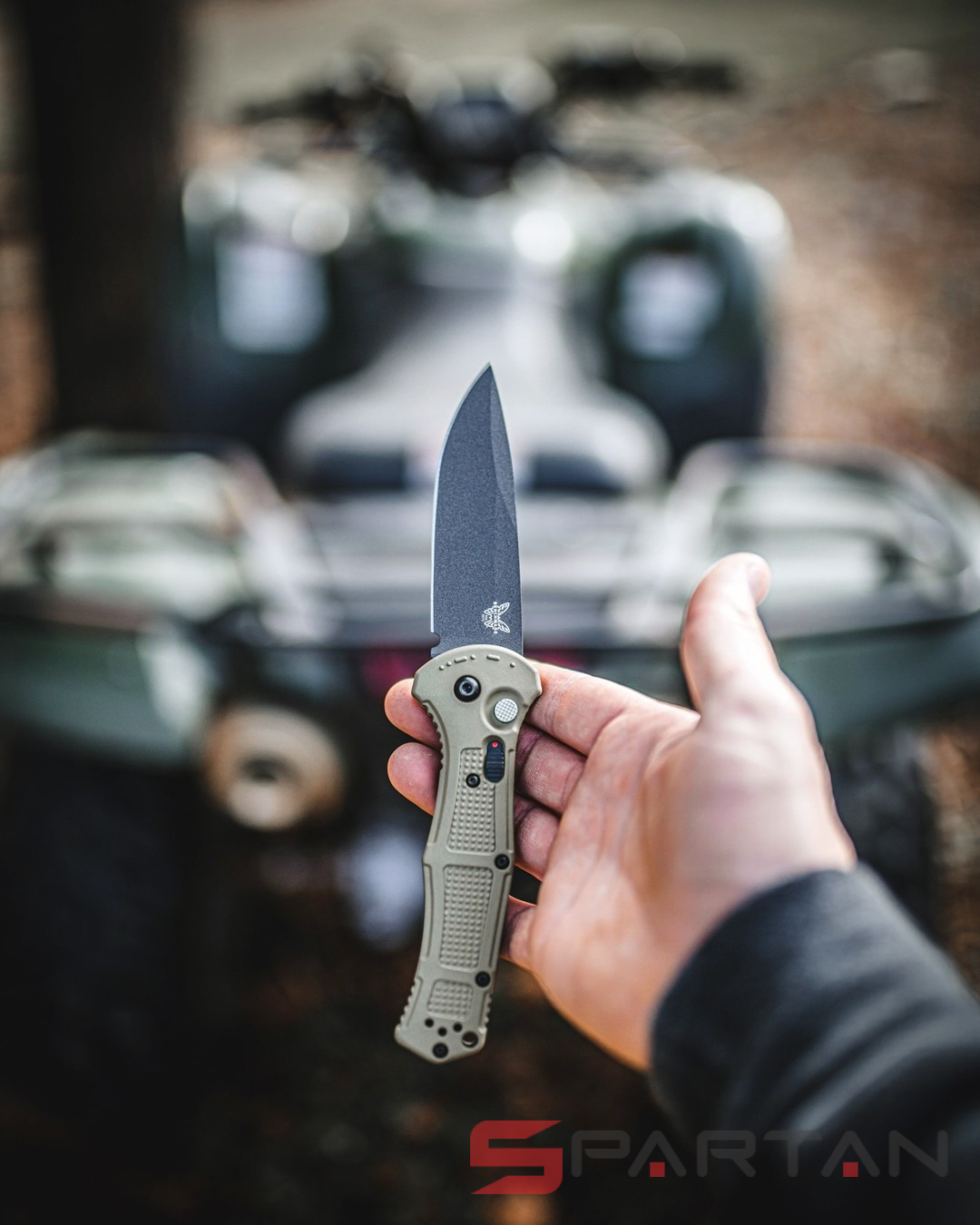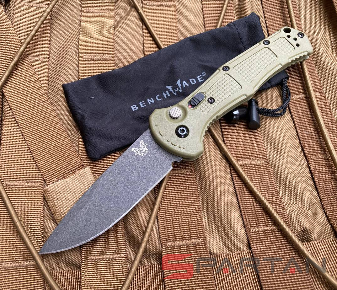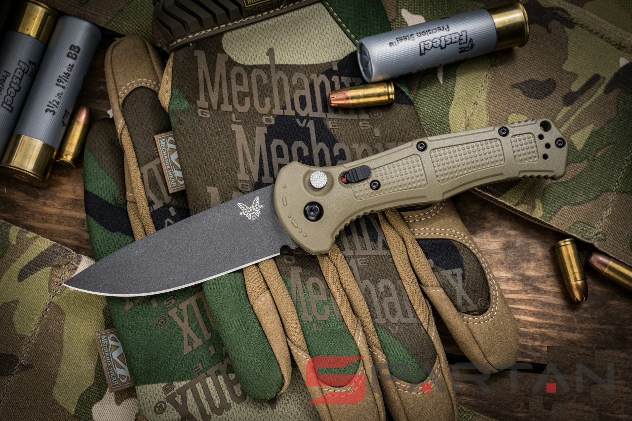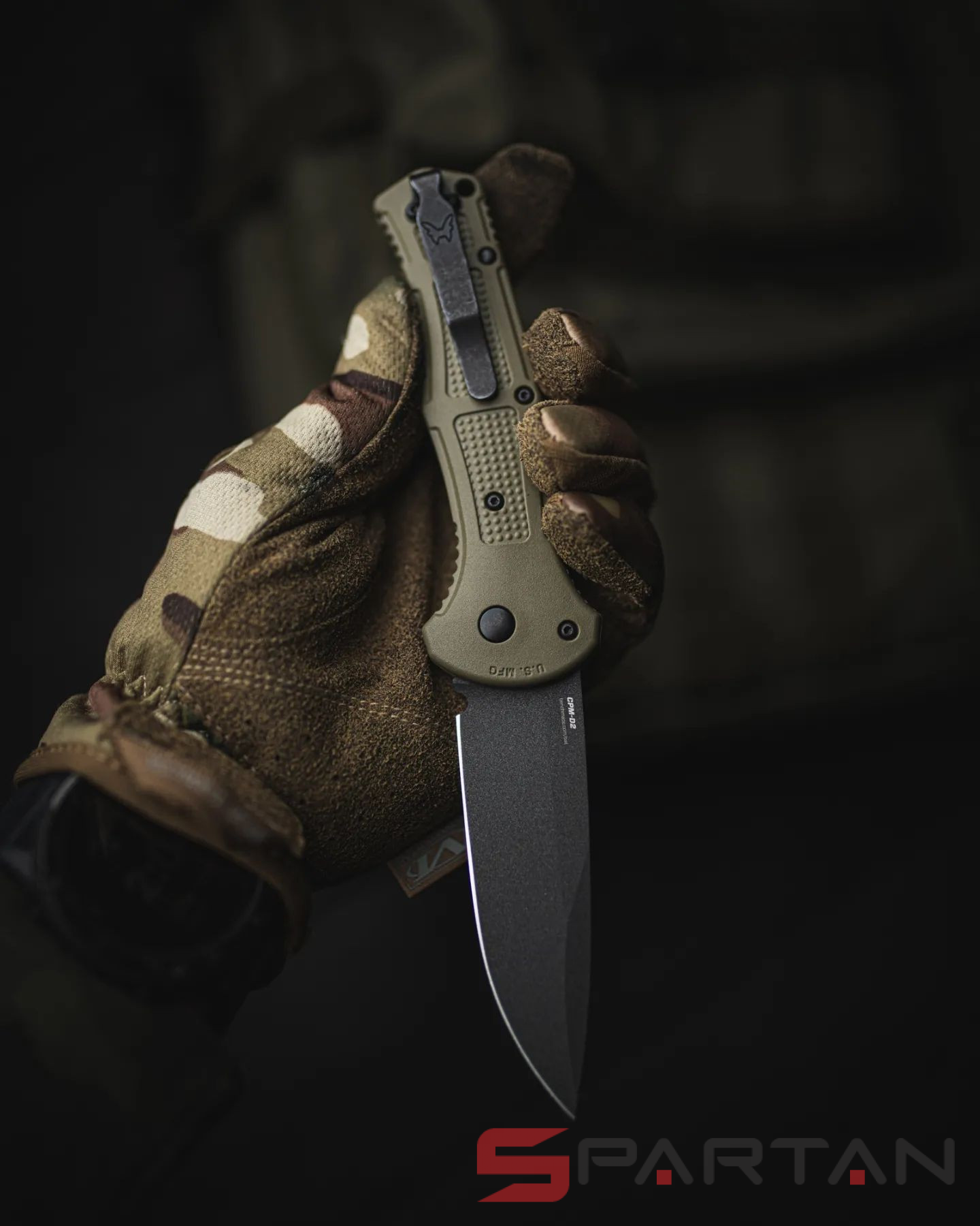 Могучий тактический "автомат" из чёрной серии Benchmade. Нож посвящён американской противопехотной мине направленного действия - Claymore. Это отражёно не только в названии, но и расцветке корпуса и внешнем оформлении. Так на рукояти со стороны клинка нанесена в виде "морзянки" типичная для мин аббревиатура F.T.E. (Front Toward Enemy) - "Лицом к противнику". Изначально Benchmade Claymore задумывался в качестве предмета экипировки военнослужащих армейских подразделений и флота, а также агентов спецслужб, но в результате был "отпущен" в гражданскую продажу. Ухватистая рукоять из пластика Grivory, переставляемая клипса глубокой посадки, рифленый предохранитель, здоровенный клинок из стали CPM-D2 с защитным серым покрытием Cobalt Black Cerakote и конечно просто взрывная "механика" автомата.
