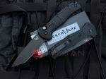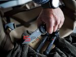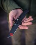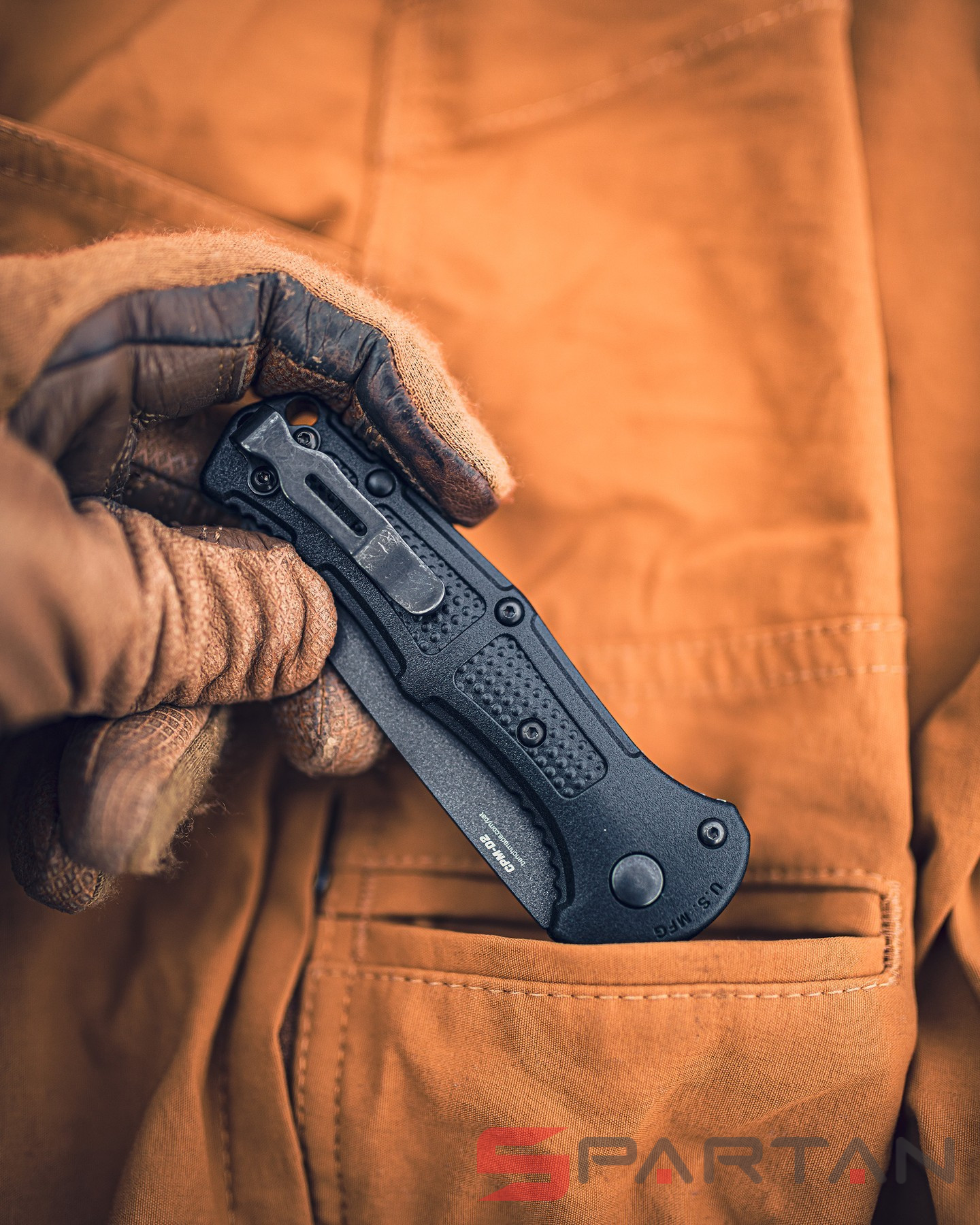 Кнопка выброса клинка имеет шляпку с мелкой насечкой, дабы в экстренной ситуации у вас не соскользнул палец, особенно если мокрые руки. Нож открывается после нажатия клавиши с чётким оружейным "клацем". Открывается, это неподходящее слово в этом случае, Benchmade 9071BK Claymore выстреливает, с весьма ощутимой отдачей в руку. Чтобы "выстрела" не произошло в кармане, производитель предусмотрел предохранитель. Он работает как при закрытом клинке, так и при открытом. Любопытная тактическая фишка - "снятый" предохранитель помечен красной точкой.