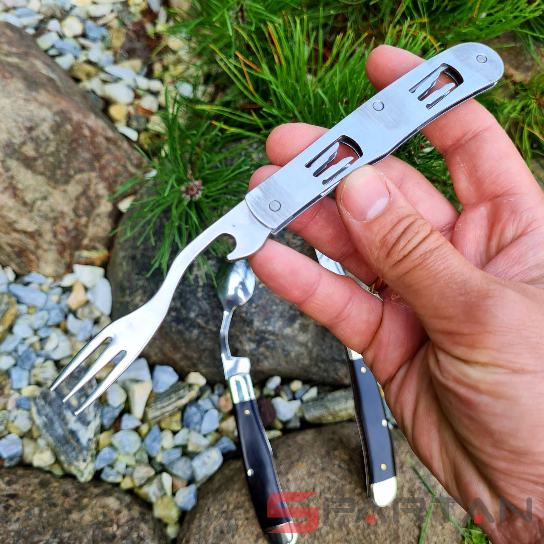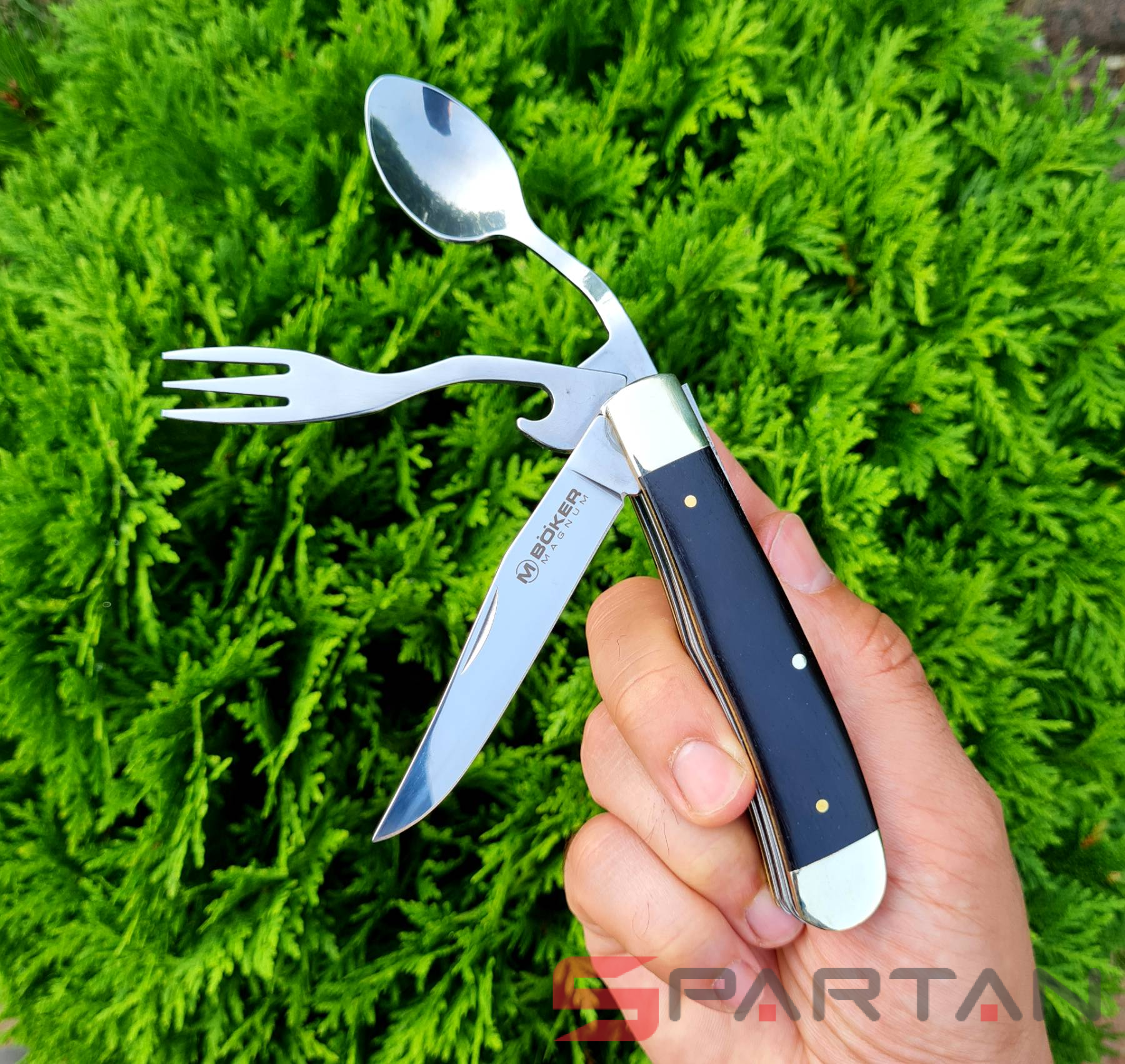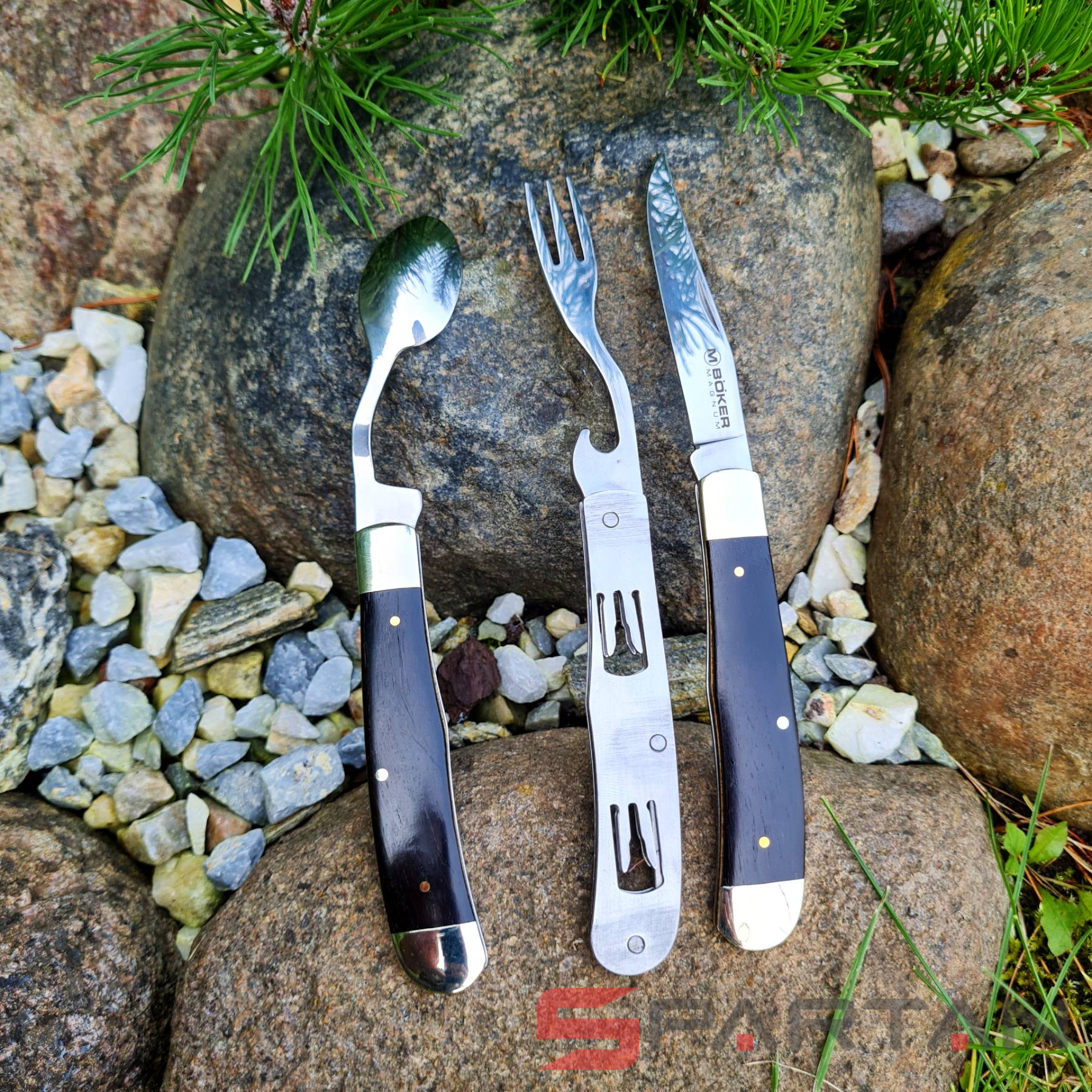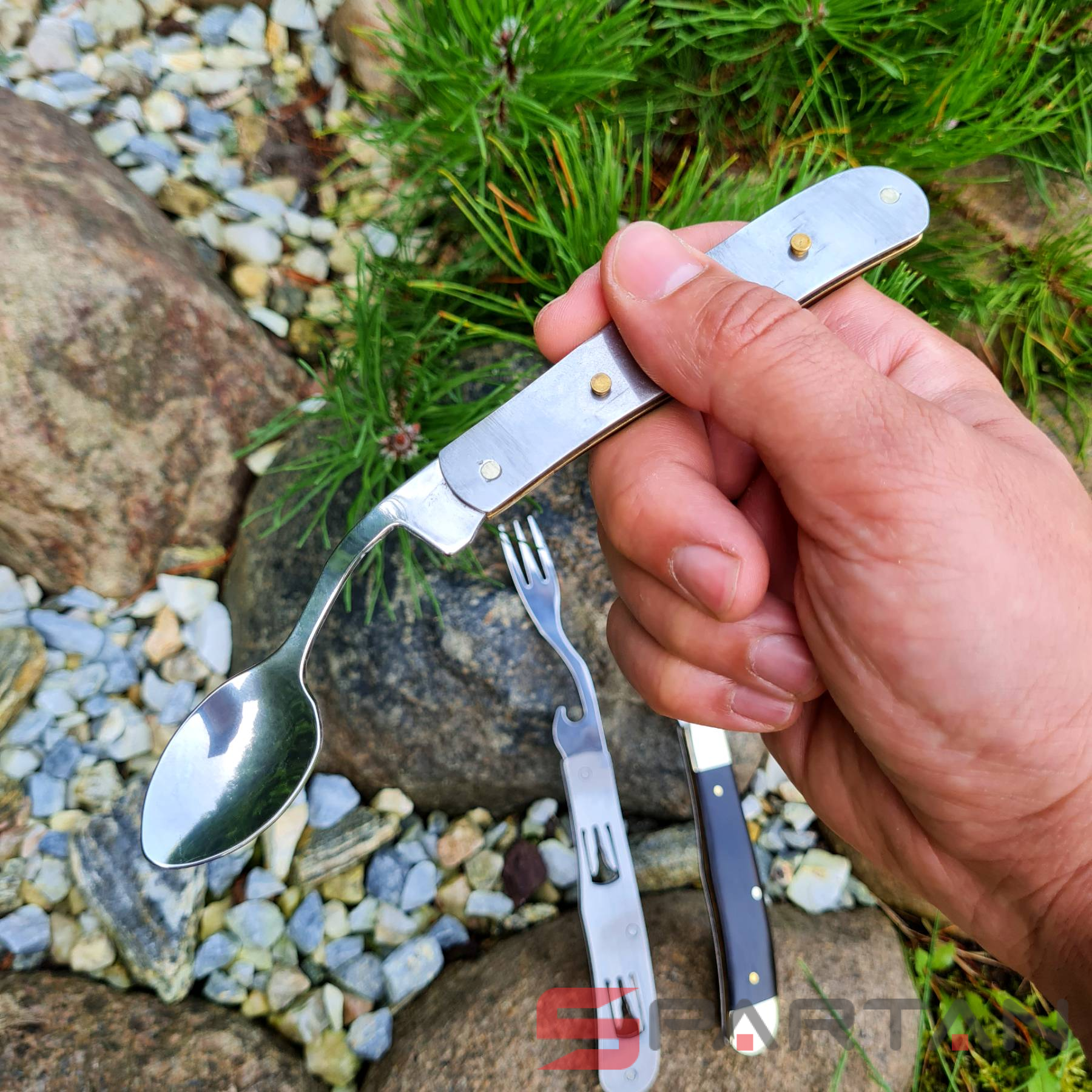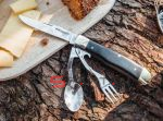 Удобный походный набор в винтажном стиле объединяющий в себе сразу 4 предмета: нож, вилку, ложку и открывашку для бутылок. Всё это складывается в одном корпусе на манер перочинного ножа, но при необходимости все предметы можно отделить и использовать независимо и одновременно. К примеру, нарезать куски жареного мяса и тут же накалывать их вилкой. Все предметы изготовлены из стали 440A, клинок дополнительно снабжен классическим замком Slip Joint, накладки на рукояти деревянные, больстеры латунные. Стильный и недорогой вариант для подарка.
