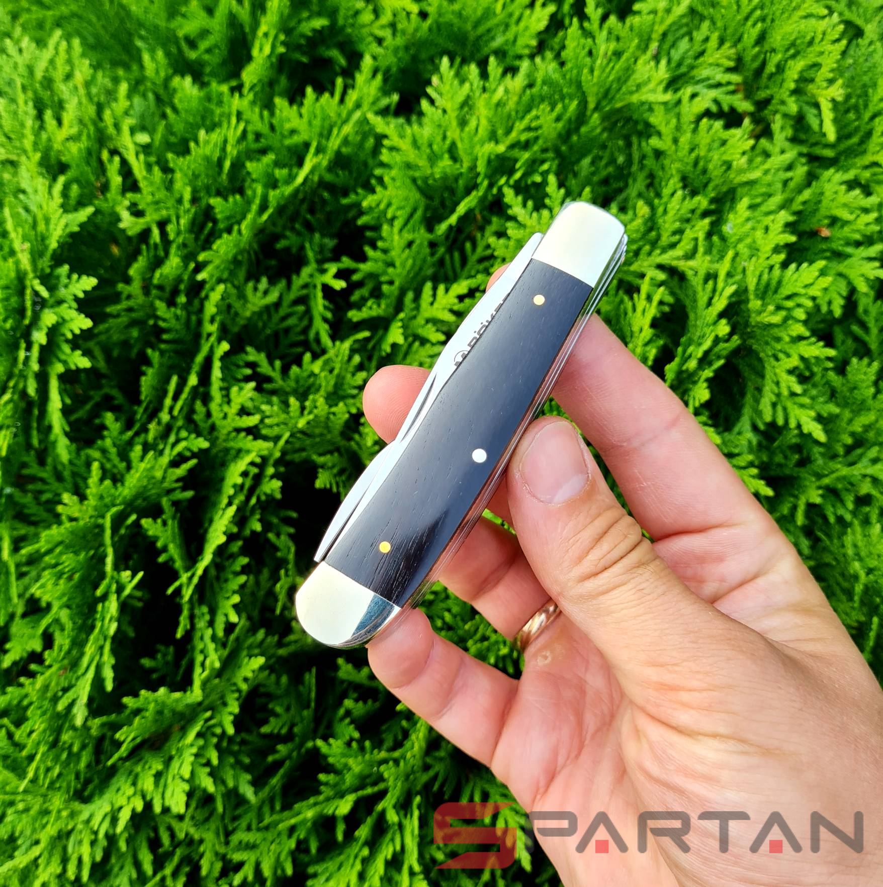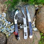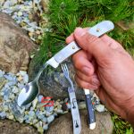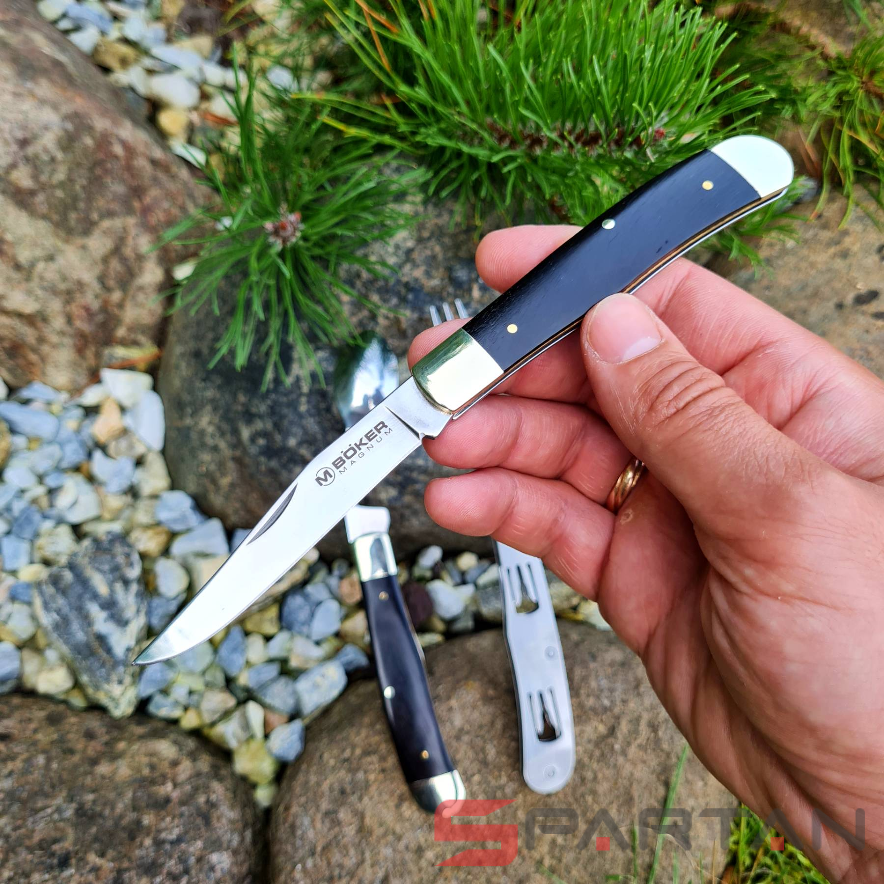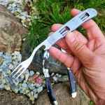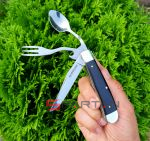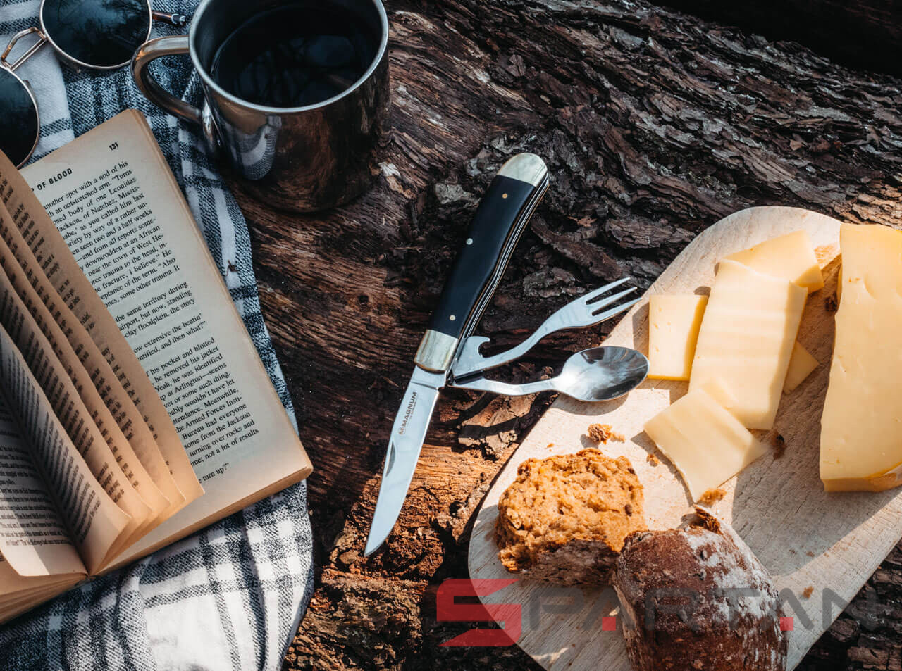 Удобный походный набор в винтажном стиле объединяющий в себе сразу 4 предмета: нож, вилку, ложку и открывашку для бутылок. Всё это складывается в одном корпусе на манер перочинного ножа, но при необходимости все предметы можно отделить и использовать независимо и одновременно. К примеру, нарезать куски жареного мяса и тут же накалывать их вилкой. Все предметы изготовлены из стали 440A, клинок дополнительно снабжен классическим замком Slip Joint, накладки на рукояти деревянные, больстеры латунные. Стильный и недорогой вариант для подарка.