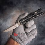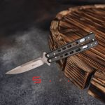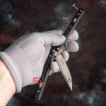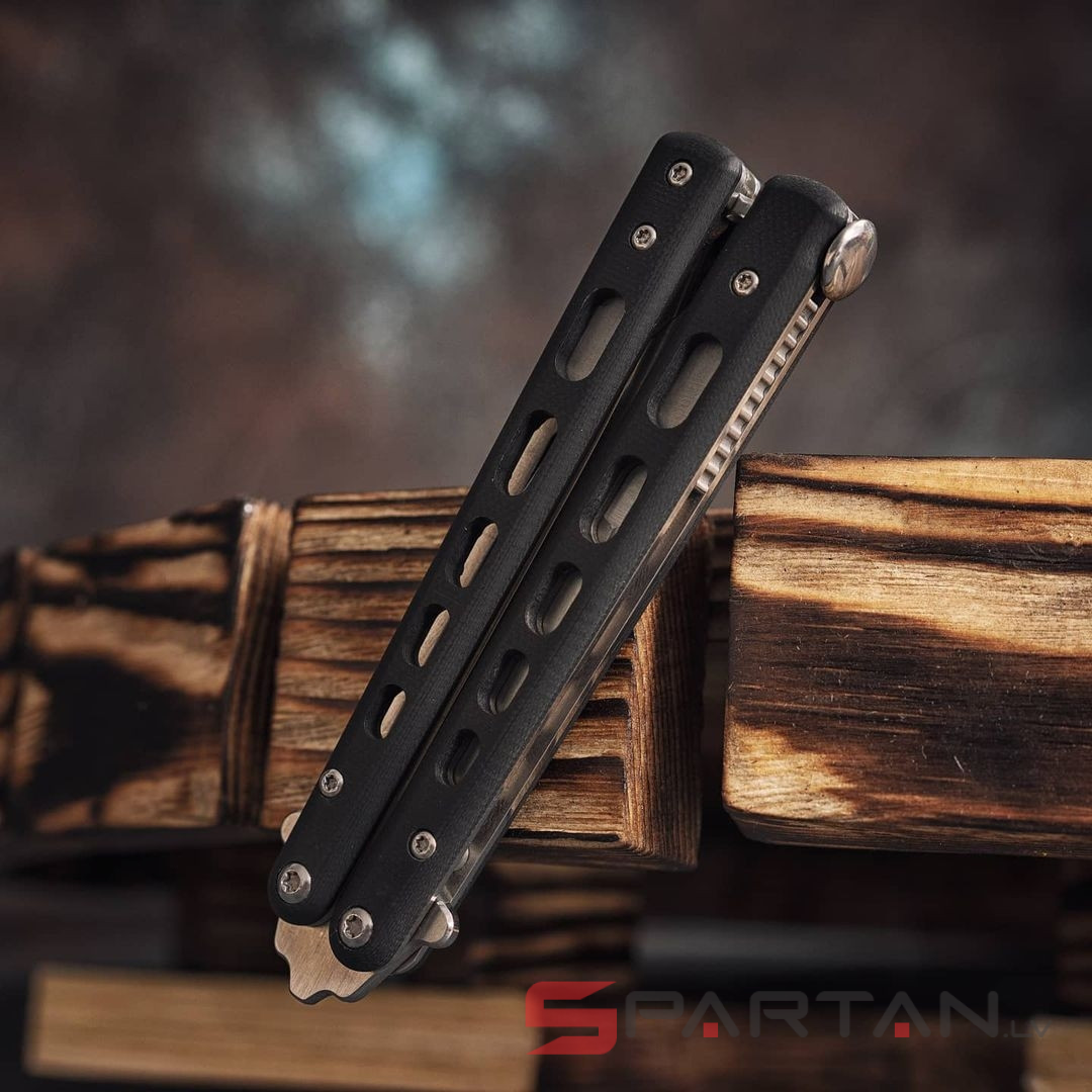 При наличии навыков балисонг раскладывается одной рукой буквально за секунды и надежно фиксируется. В сложенном и разложенном положении половинки рукояти скрепляются защелкой на шарнире и удерживаются от расхождения рукой. Половинки рукояти представляет собой накладки из стеклотекстолита G10, закрепленные на стальной основе. Высверленные в накладках отверстия снижают вес, улучшая баланс ножа. На одной из половинок рукояти имеется клипса для надежного крепления к элементам одежды.