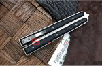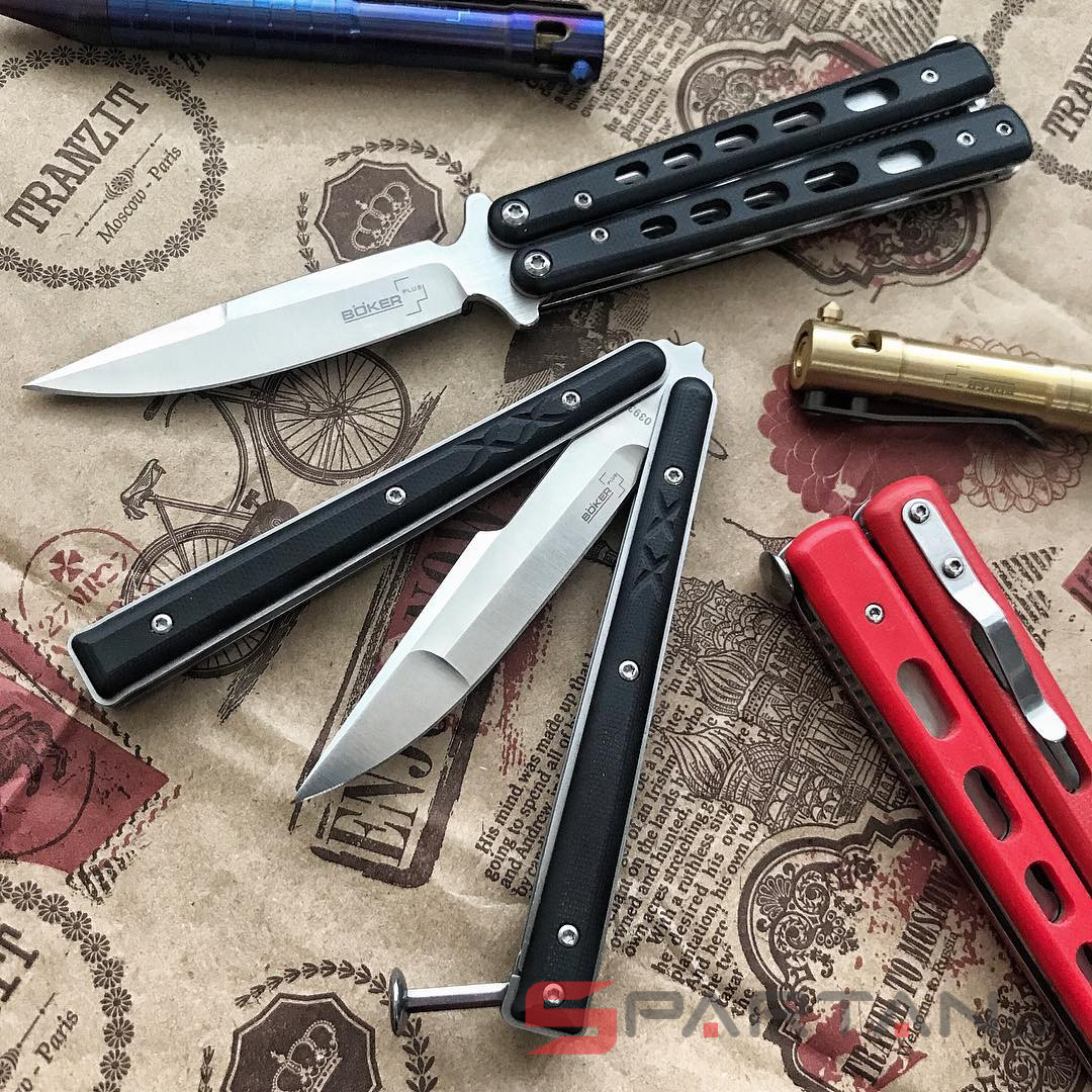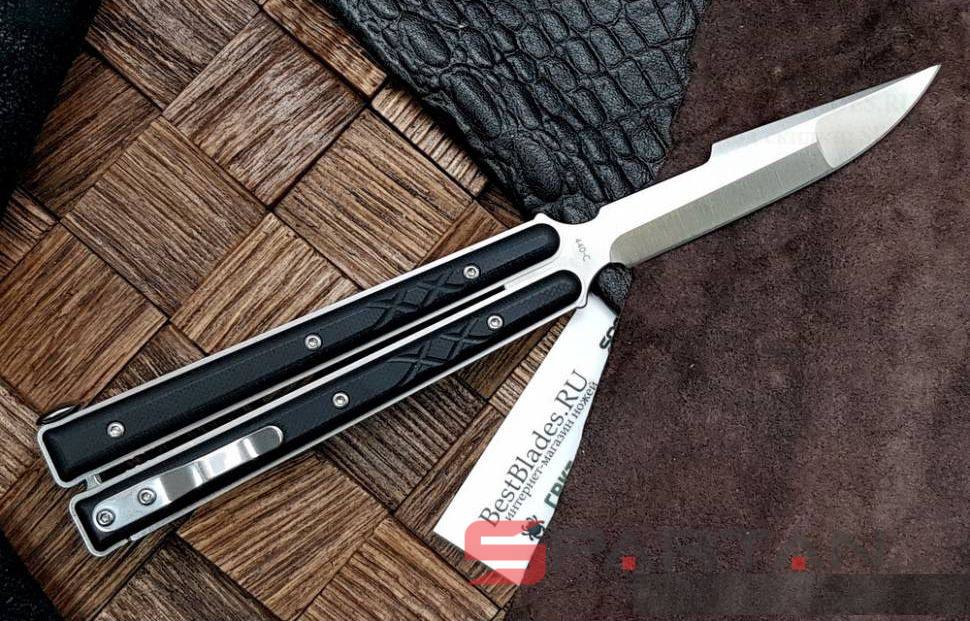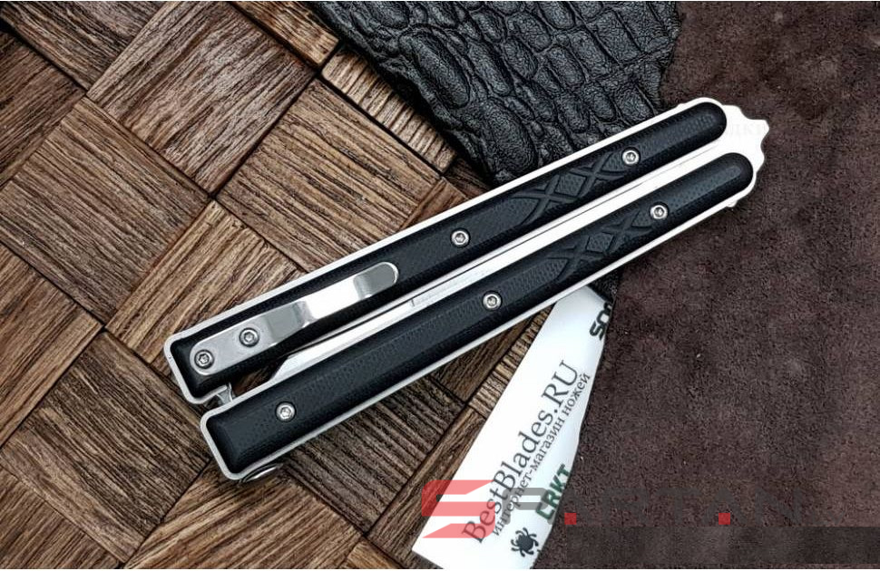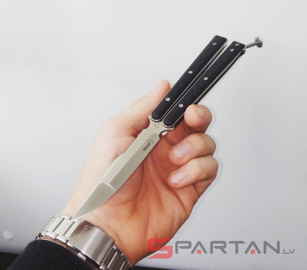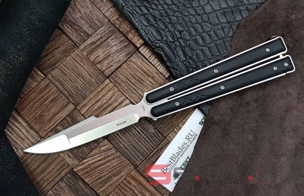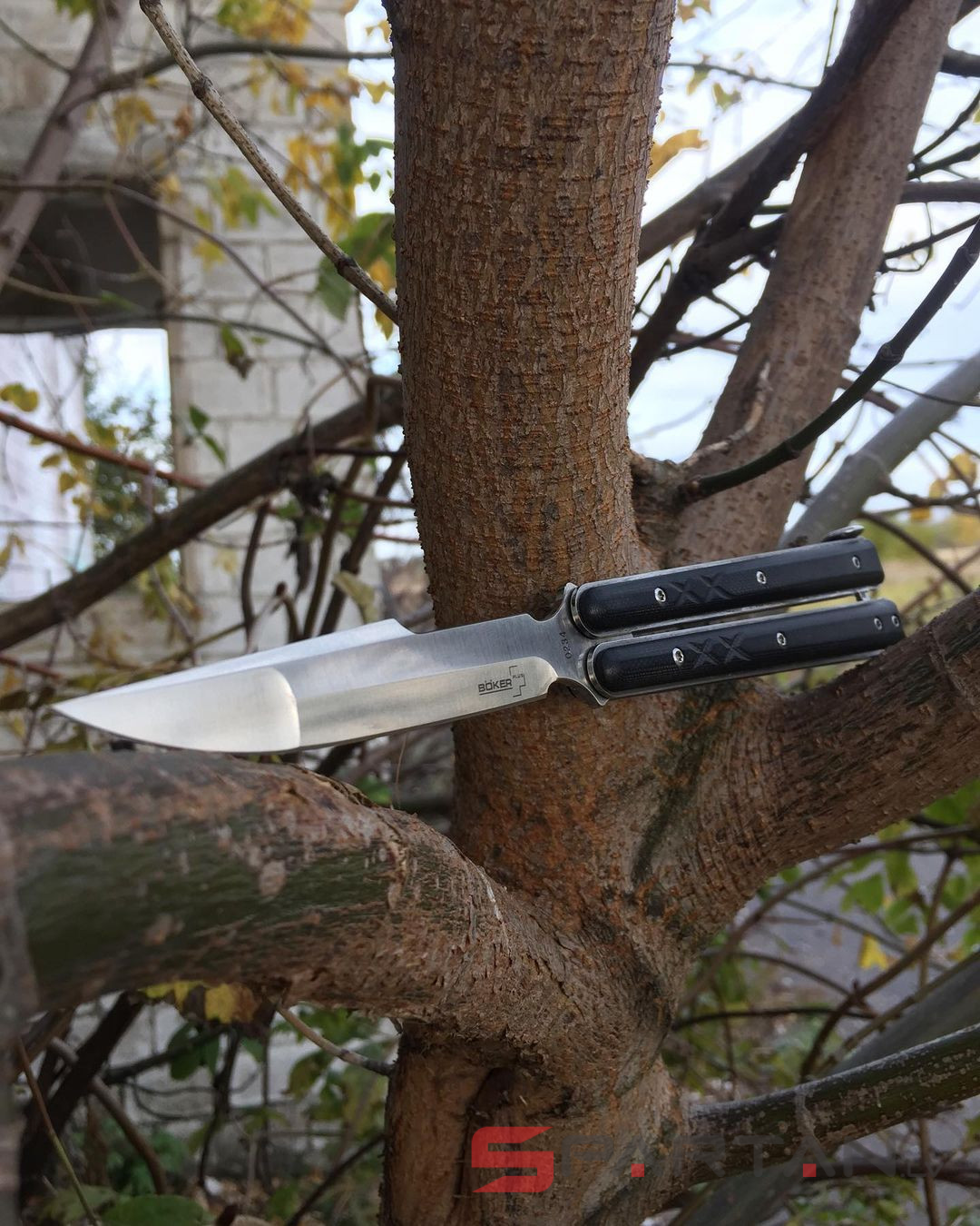 Полноразмерная "бабочка" от немецкого производителя, из неплохих современных материалов. Клинок изготовлен из нержавеющей стали 440C, и имеет необычную гарпунообразную форму. Для каркаса использованы стальные пластины, сверху прикрытые накладками из пластика G10. Несмотря на довольно крупные размеры, нож получился сравнительно лёгким, и что немаловажно ухватистым (рукоять не скользит в руке). В отличие от типичной "китайщины", здесь не наблюдается никаких посторонних люфтов, болтания и бренчания. К качеству сборки также нет никаких претензий. Тем не менее, на всякий случай, производитель предусмотрел в комплекте ключик-шестигранник, для подкручивания осевых винтов.