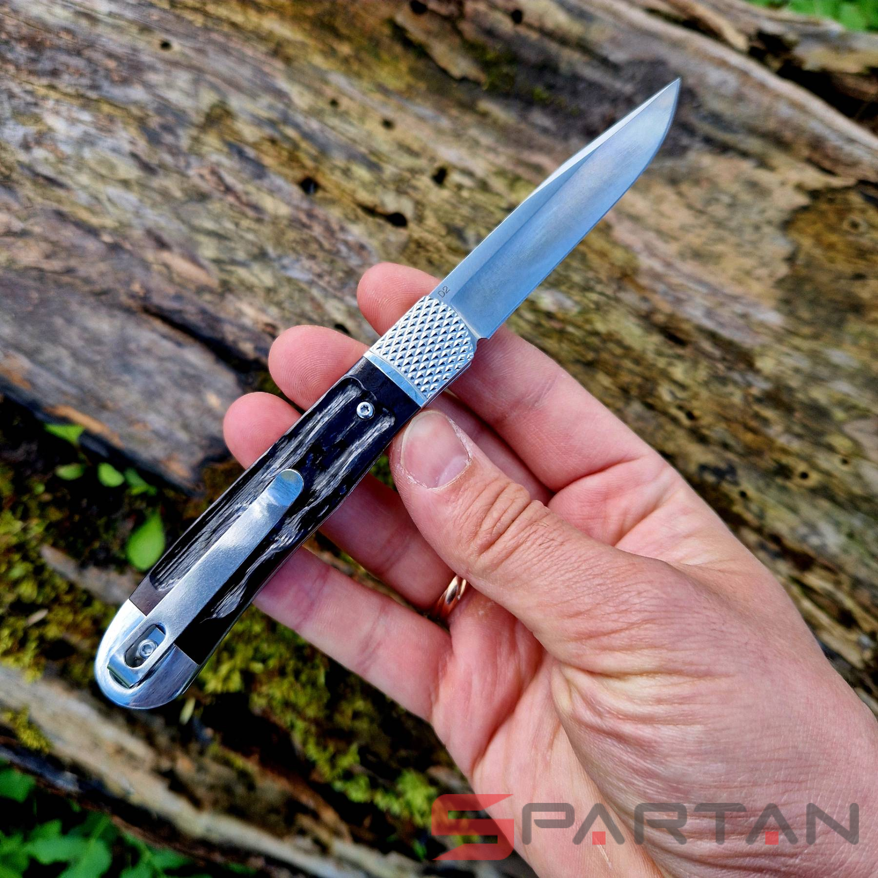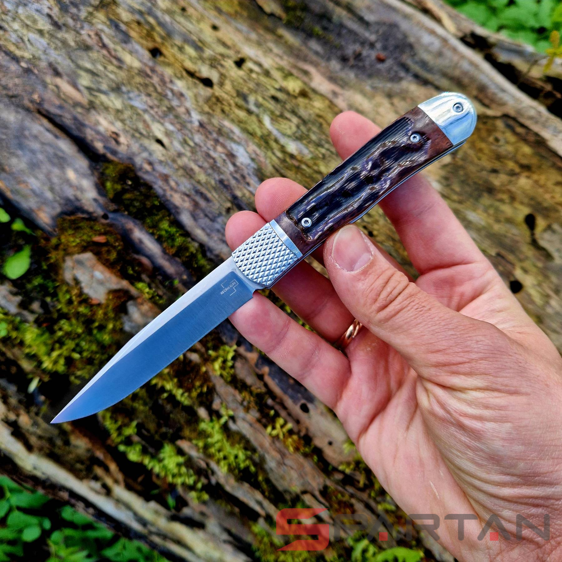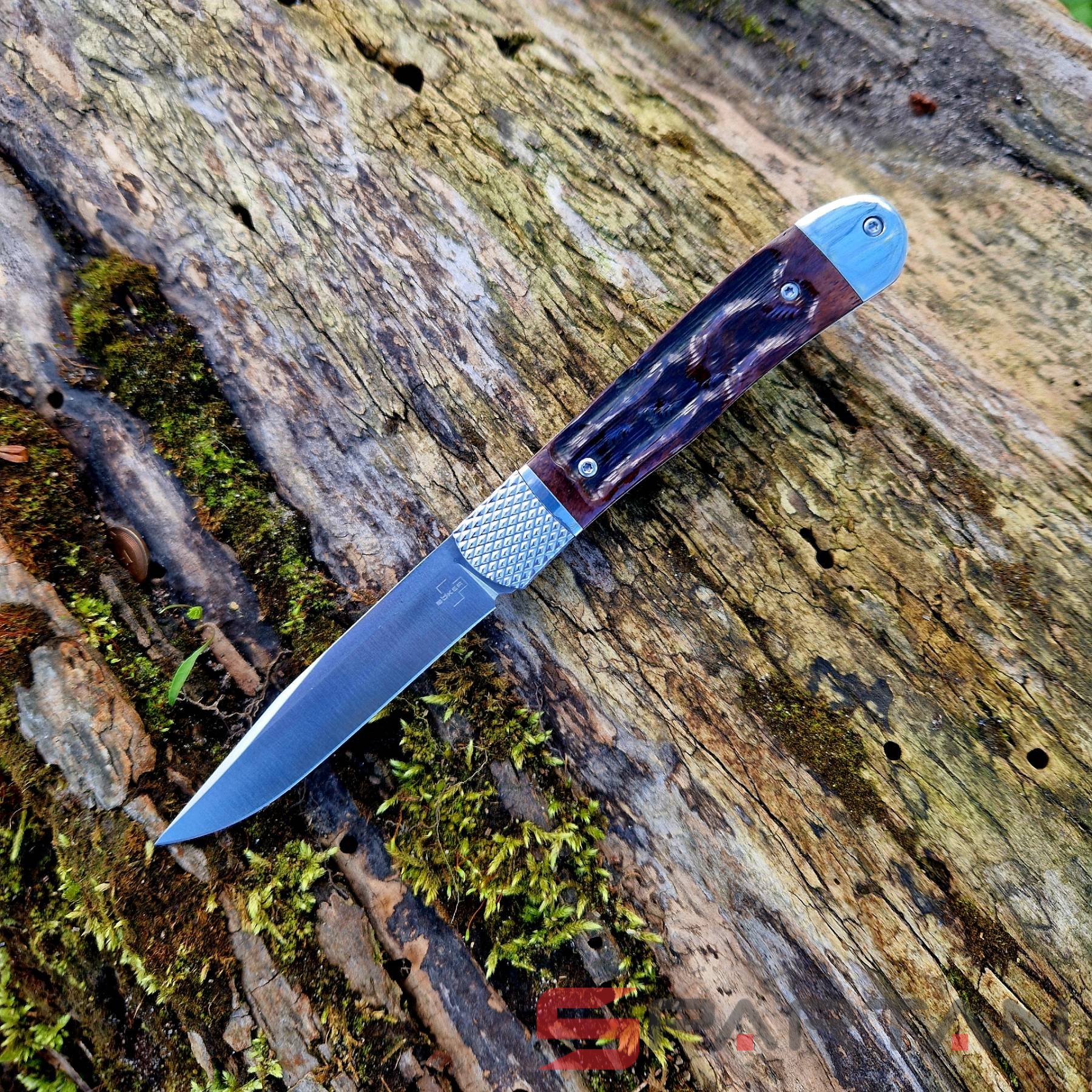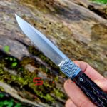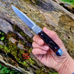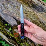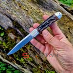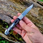 Небольшой автоматический нож в классическом, можно даже сказать винтажном стиле Trapper. Достаточно длинный узкий клиночек выполнен из американской стали D2, имеет высокие спуски и не слишком хрупкий кончик. Так что нож пригоден для самого широко круга задач (порезать, проколоть, подковырнуть). В основе рукояти мощная стальная рама, сверху закрытая плашками из кости лошади Аппалуза (Appaloosa). Крайне популярная американская порода лошадей выведенная еще индейцами. С обеих сторон рукояти расположены стальные больстеры. Изюминка этого "автомата" помимо его лампового внешнего вида, это собственно механизм - здесь нет привычной кнопки или рычага для спуска. Чтобы открыть клинок нужно слегка сдвинуть верхний больстер вбок и мощная пружина тут же откроет нож с сочным щелчком. Для закрытия клинка процедуру нужно повторить. Разумеется в кармане проделать такое "случайно" невозможно, так что предохранитель здесь попросту не требуется.