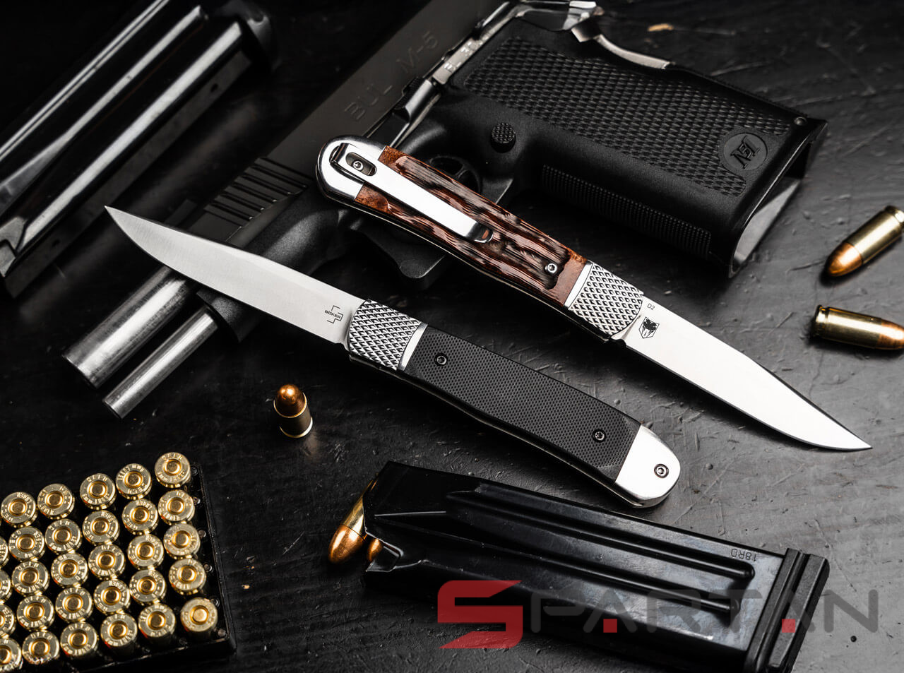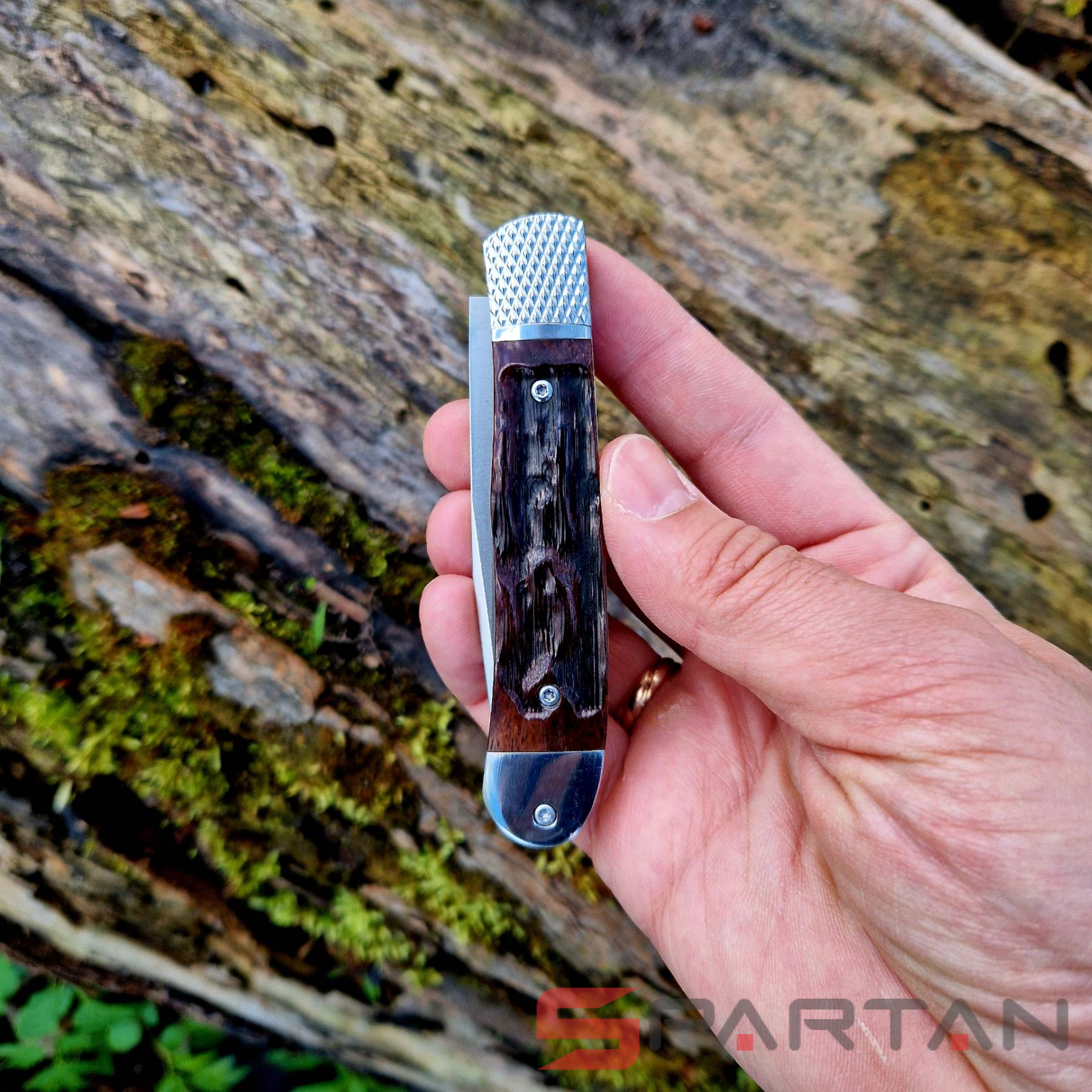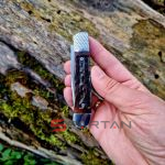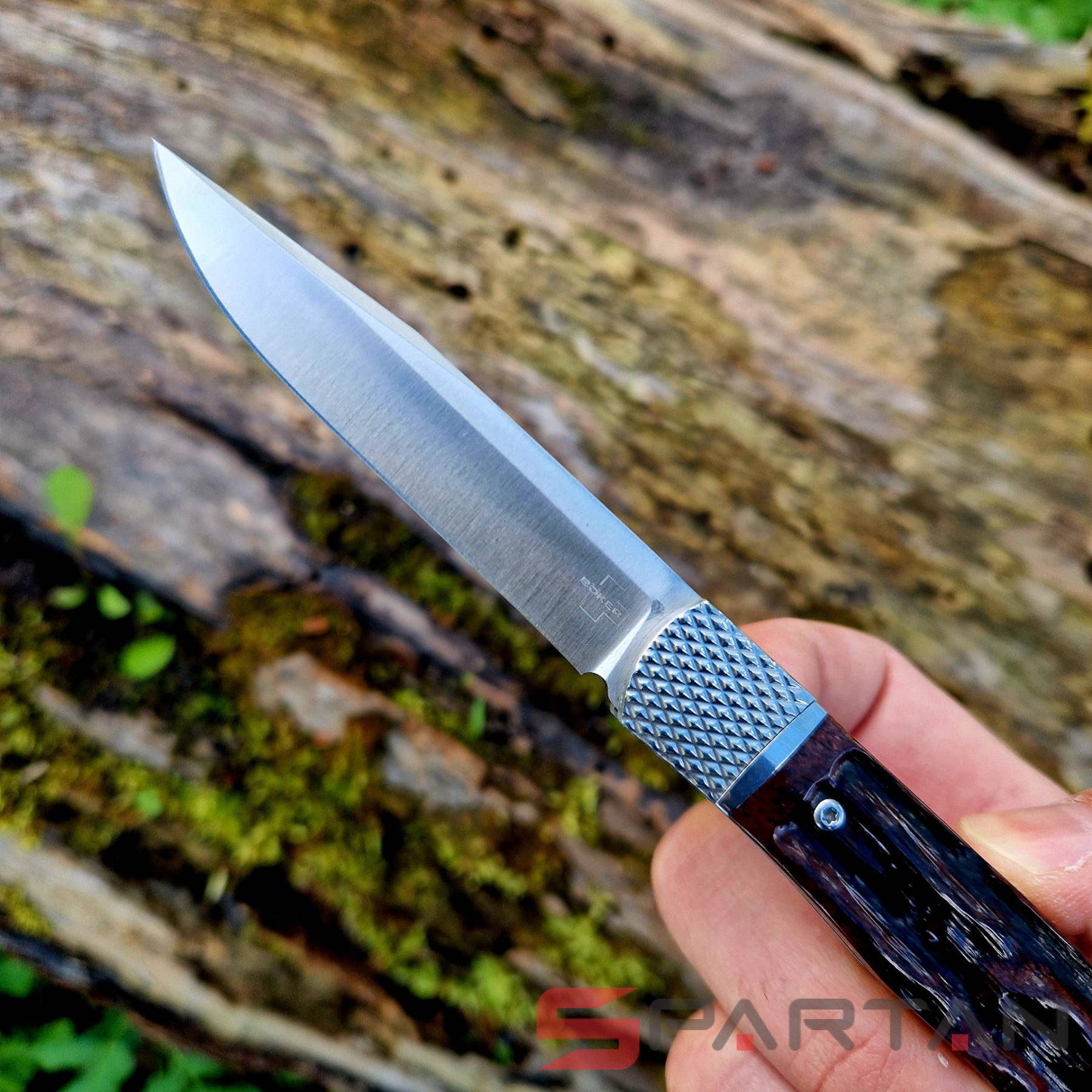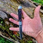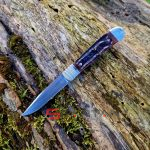 Небольшой автоматический нож в классическом, можно даже сказать винтажном стиле Trapper. Достаточно длинный узкий клиночек выполнен из американской стали D2, имеет высокие спуски и не слишком хрупкий кончик. Так что нож пригоден для самого широко круга задач (порезать, проколоть, подковырнуть). В основе рукояти мощная стальная рама, сверху закрытая плашками из кости лошади Аппалуза (Appaloosa). Крайне популярная американская порода лошадей выведенная еще индейцами. С обеих сторон рукояти расположены стальные больстеры. Изюминка этого "автомата" помимо его лампового внешнего вида, это собственно механизм - здесь нет привычной кнопки или рычага для спуска. Чтобы открыть клинок нужно слегка сдвинуть верхний больстер вбок и мощная пружина тут же откроет нож с сочным щелчком. Для закрытия клинка процедуру нужно повторить. Разумеется в кармане проделать такое "случайно" невозможно, так что предохранитель здесь попросту не требуется.
