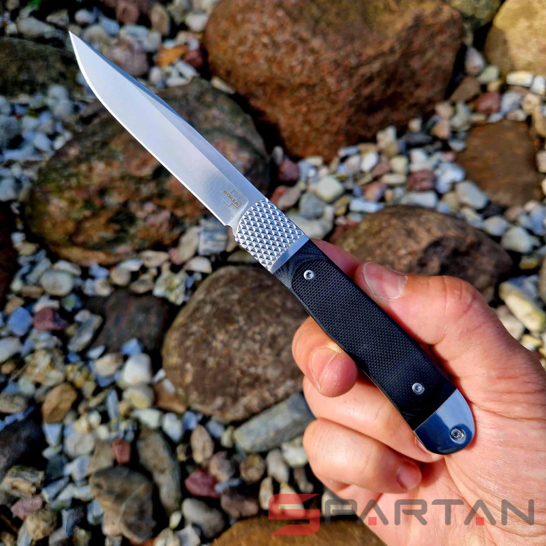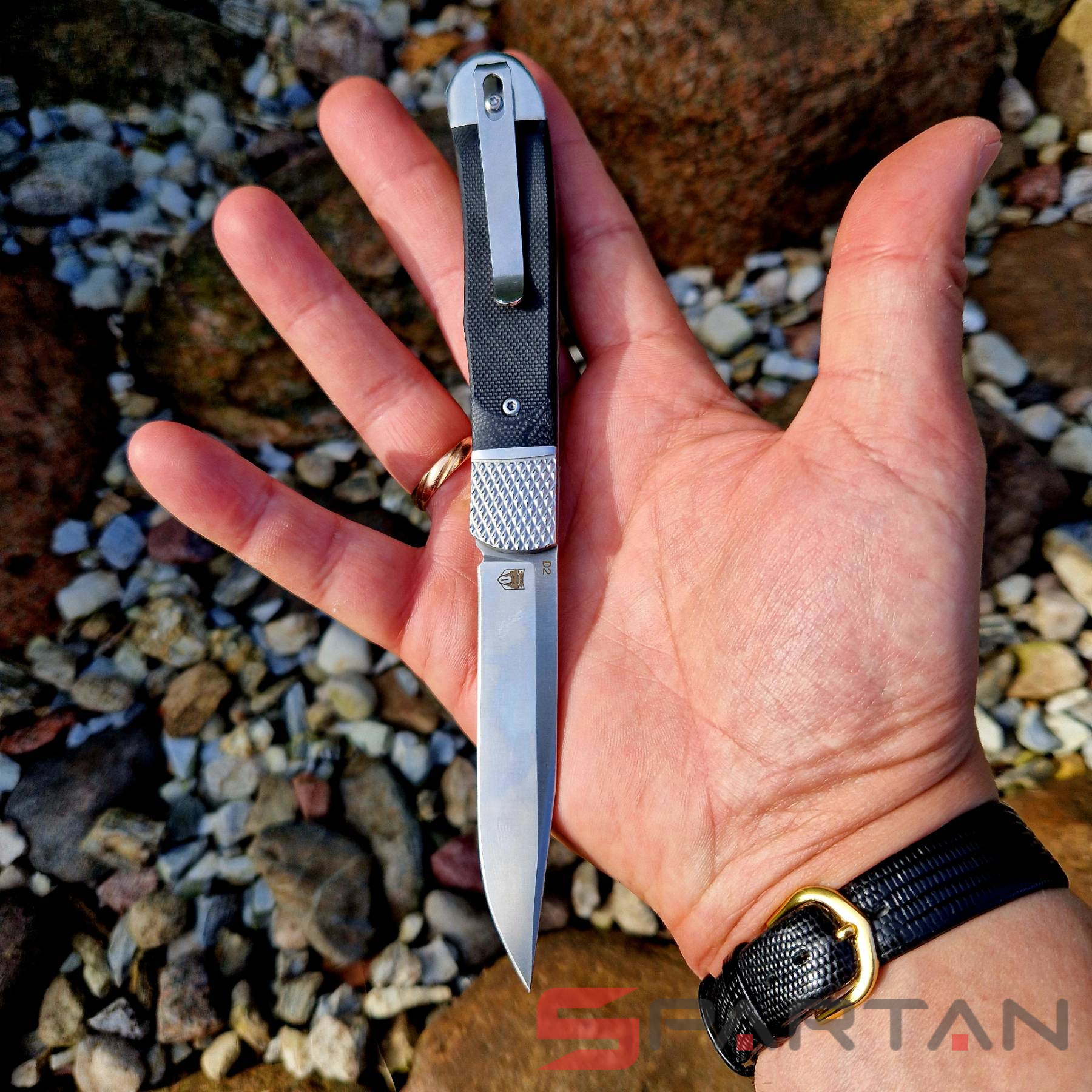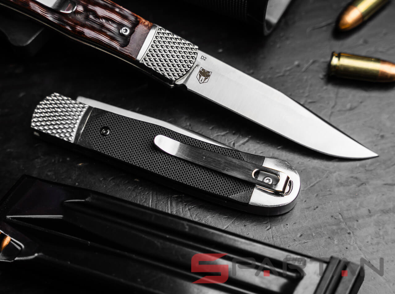 Небольшой автоматический нож в классическом, можно даже сказать винтажном стиле Trapper. Достаточно длинный узкий клиночек выполнен из американской стали D2, имеет высокие спуски и не слишком хрупкий кончик. Так что нож пригоден для самого широко круга задач (порезать, проколоть, подковырнуть). В основе рукояти мощная стальная рама, сверху закрытая плашками из пластика G10. С обеих сторон рукояти расположены стальные больстеры. Изюминка этого "автомата" помимо его лампового внешнего вида, это собственно механизм - здесь нет привычной кнопки или рычага для спуска. Чтобы открыть клинок нужно слегка сдвинуть верхний больстер вбок и мощная пружина тут же откроет нож с сочным щелчком. Для закрытия клинка процедуру нужно повторить. Разумеется в кармане проделать такое "случайно" невозможно, так что предохранитель здесь попросту не требуется.