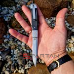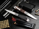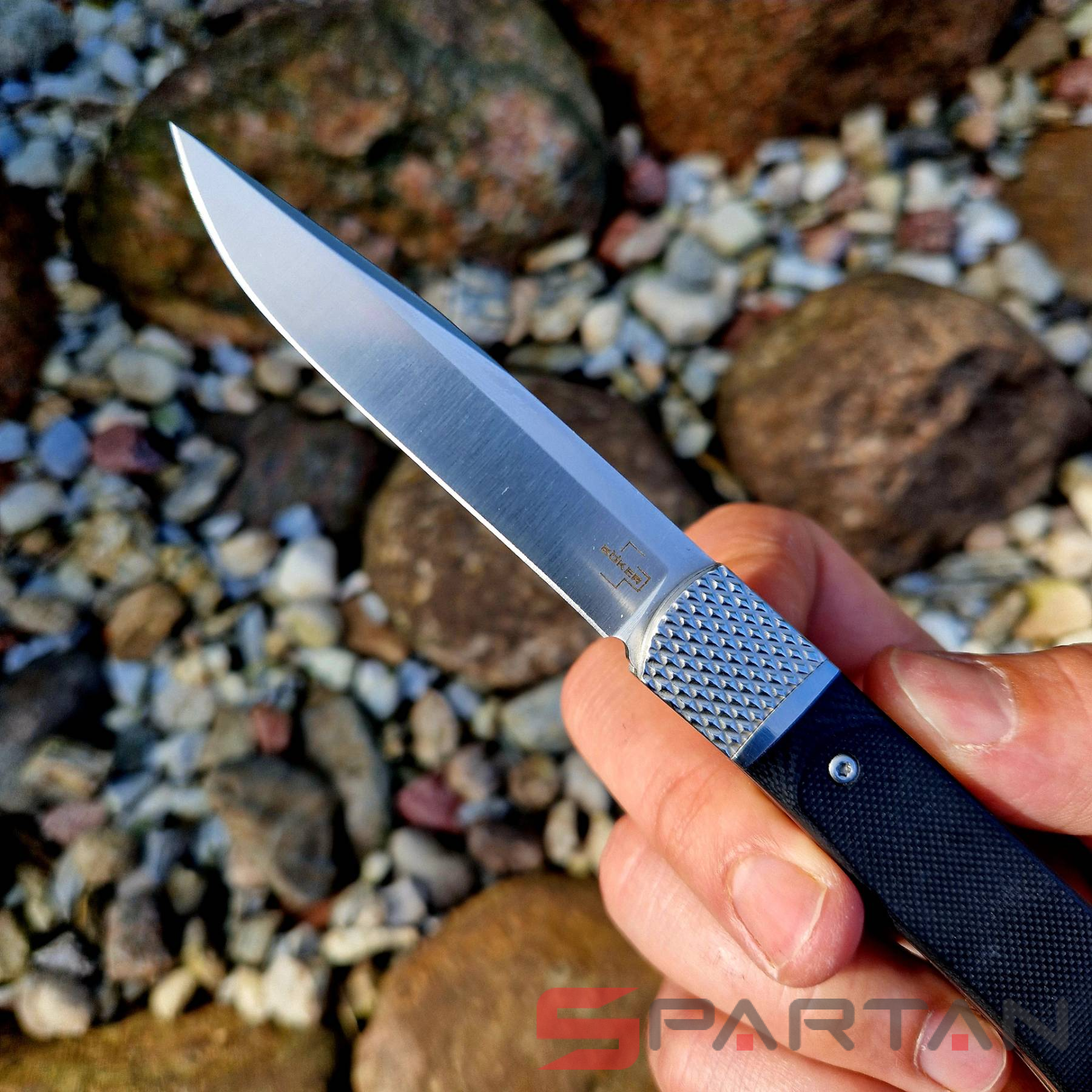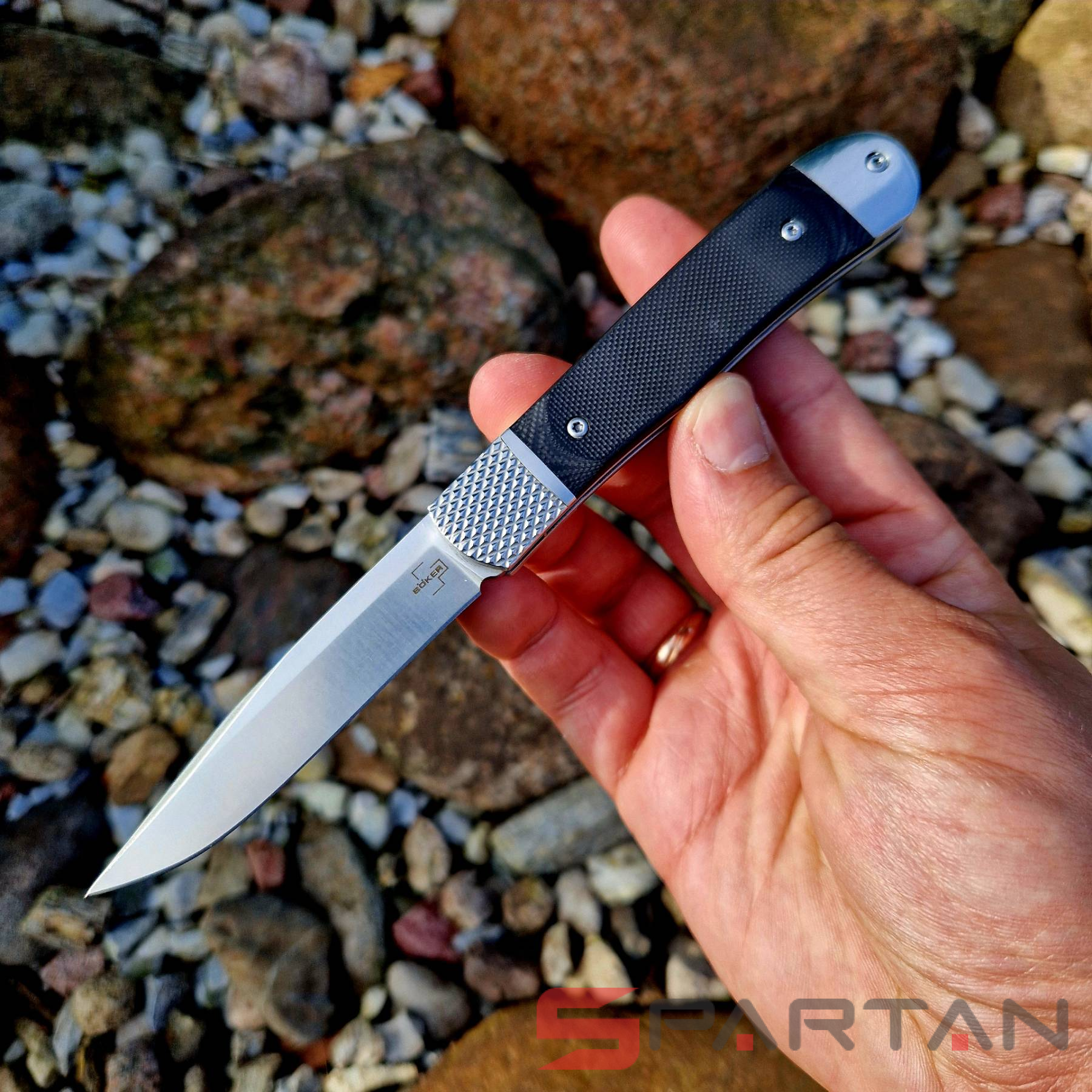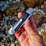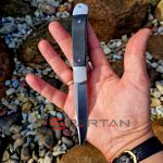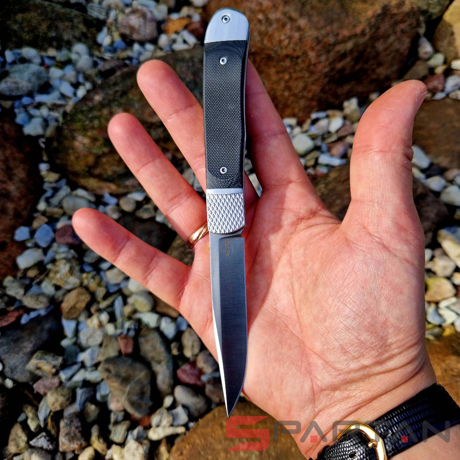 Небольшой автоматический нож в классическом, можно даже сказать винтажном стиле Trapper. Достаточно длинный узкий клиночек выполнен из американской стали D2, имеет высокие спуски и не слишком хрупкий кончик. Так что нож пригоден для самого широко круга задач (порезать, проколоть, подковырнуть). В основе рукояти мощная стальная рама, сверху закрытая плашками из пластика G10. С обеих сторон рукояти расположены стальные больстеры. Изюминка этого "автомата" помимо его лампового внешнего вида, это собственно механизм - здесь нет привычной кнопки или рычага для спуска. Чтобы открыть клинок нужно слегка сдвинуть верхний больстер вбок и мощная пружина тут же откроет нож с сочным щелчком. Для закрытия клинка процедуру нужно повторить. Разумеется в кармане проделать такое "случайно" невозможно, так что предохранитель здесь попросту не требуется.
