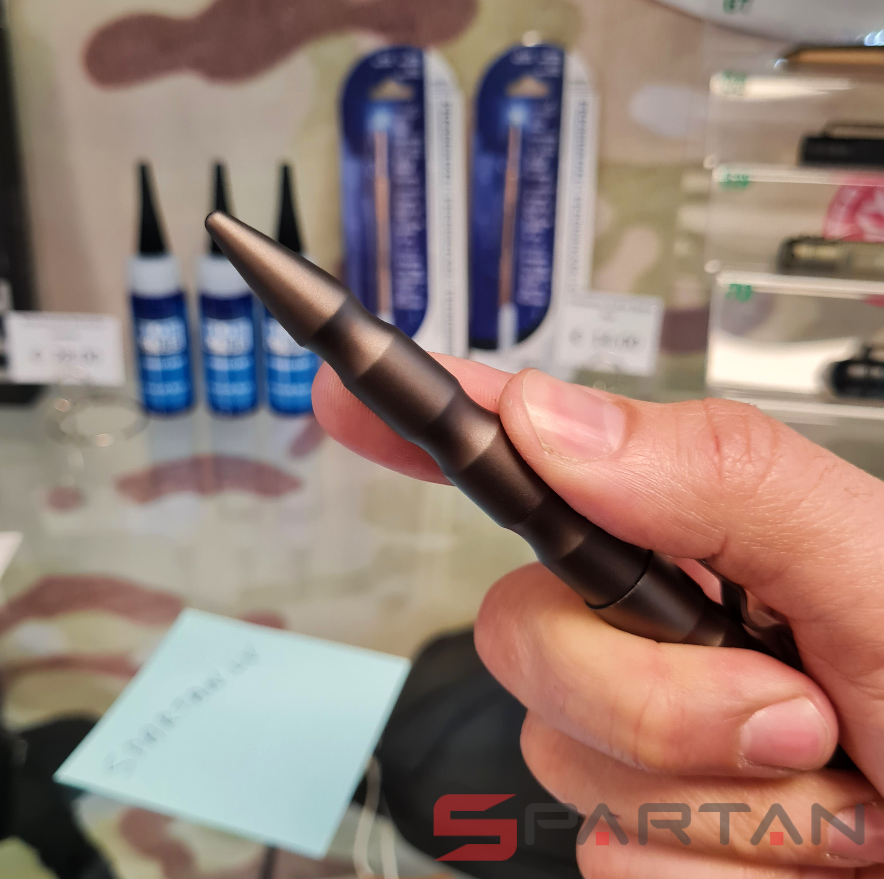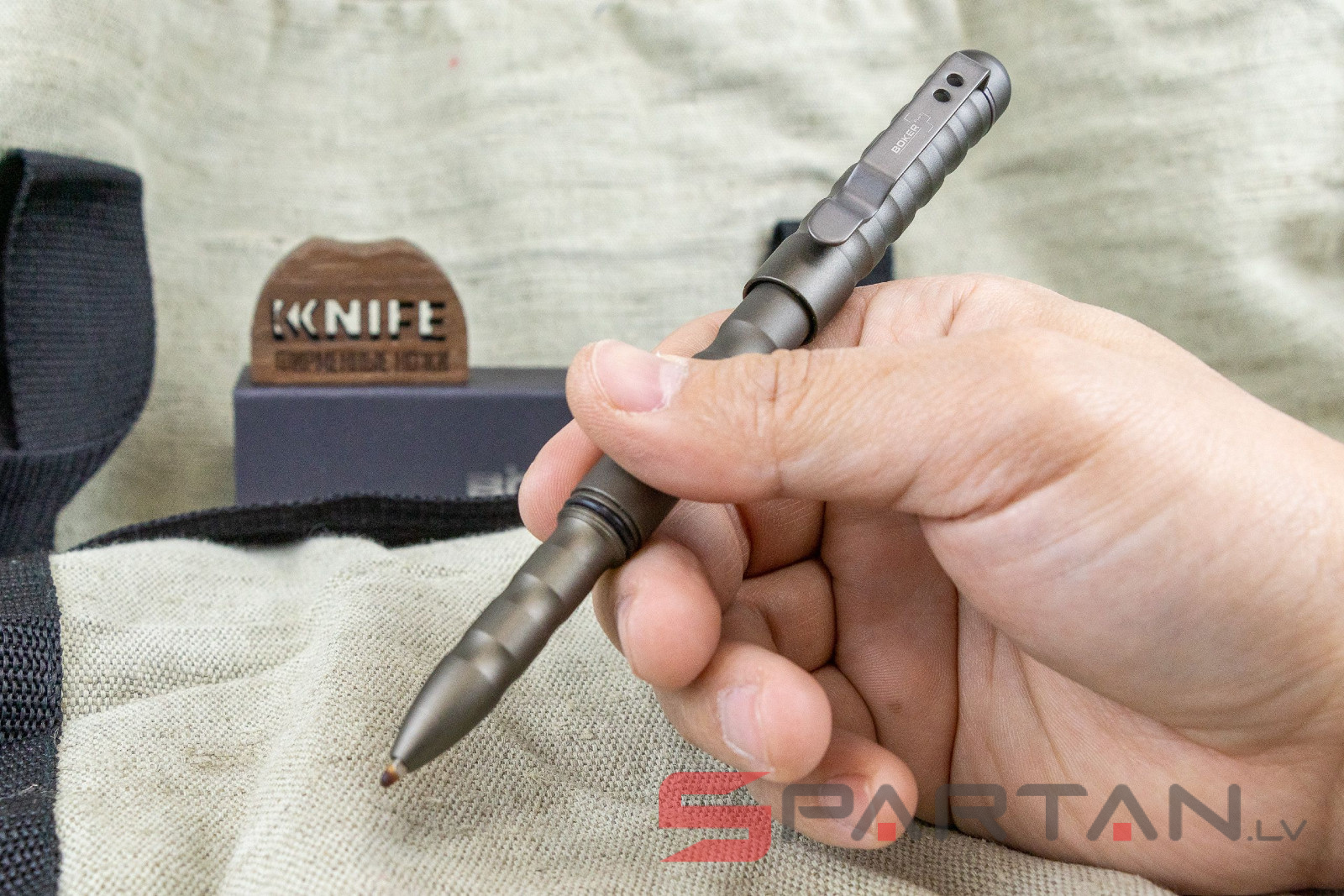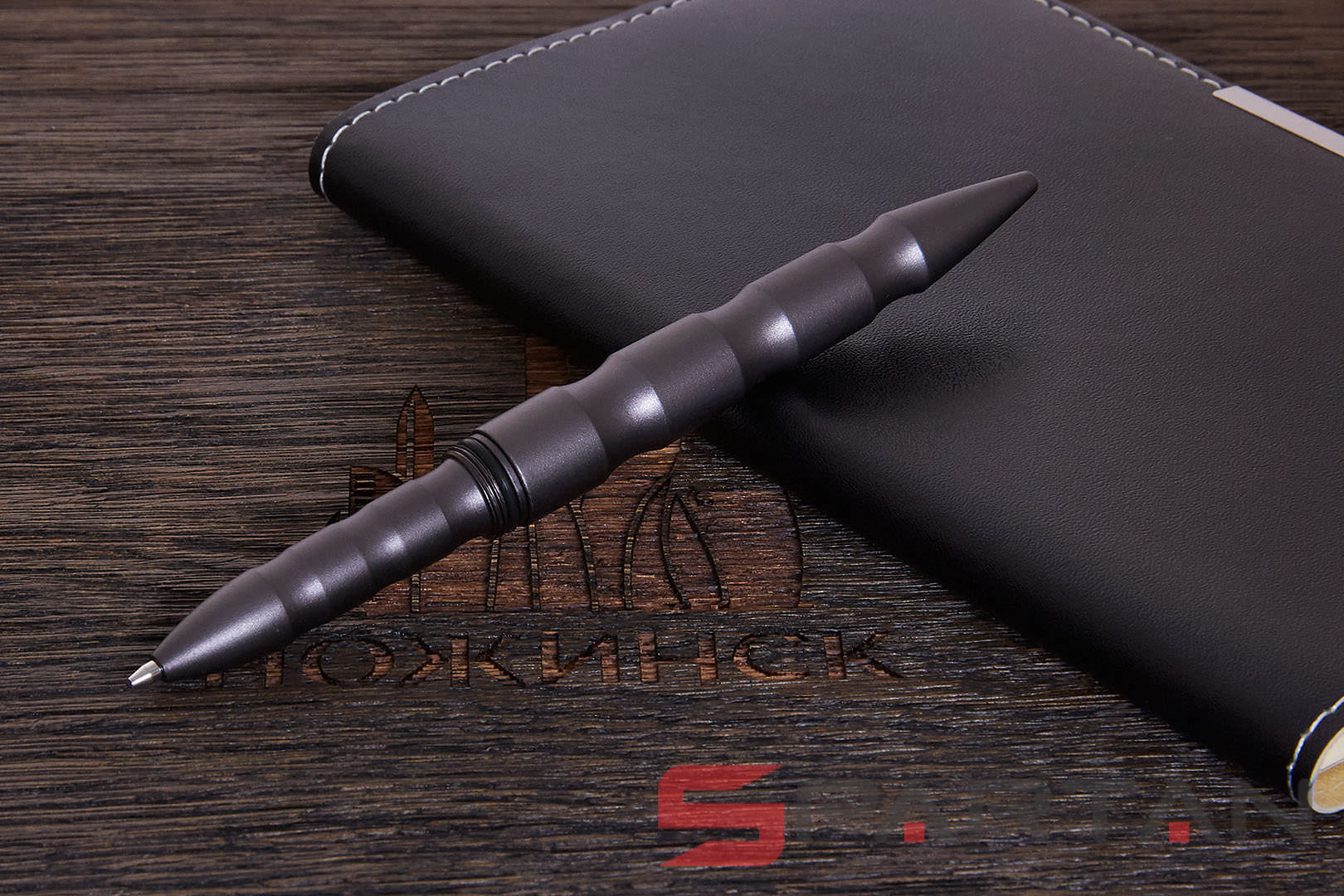 Мощная немецкая тактическая ручка с интересным дизайном корпуса напоминающим стебель бамбука. Корпус целиком выполнен из алюминия, имеет характерное ударное навершие и стальной стеклобой с другой стороны. Вообще по форме эта тактическая ручка максимально близка к японской яваре (куботану) и вполне способна выполнять точно такие же задачи: нанесение болезненных тычковых ударов. Благодаря выемкам в виде колец ручка очень надёжно удерживается даже влажными руками. Колпачёк закрывающий пишущую часть традиционно на резьбе, при письме его можно надеть сзади на корпус ручки. Из дополнительных удобств отметим наличие клипсы для ношения на кармане. Комплектный стержень при желании можно заменить на "космический" Fisher Space Pen.