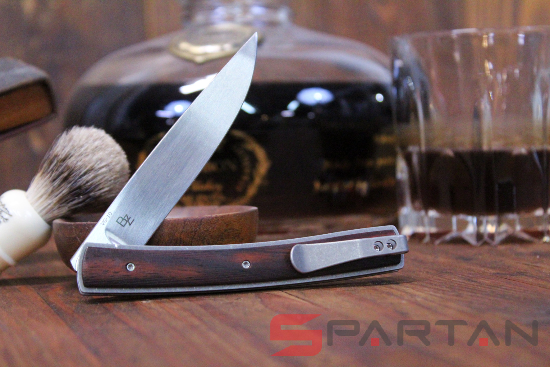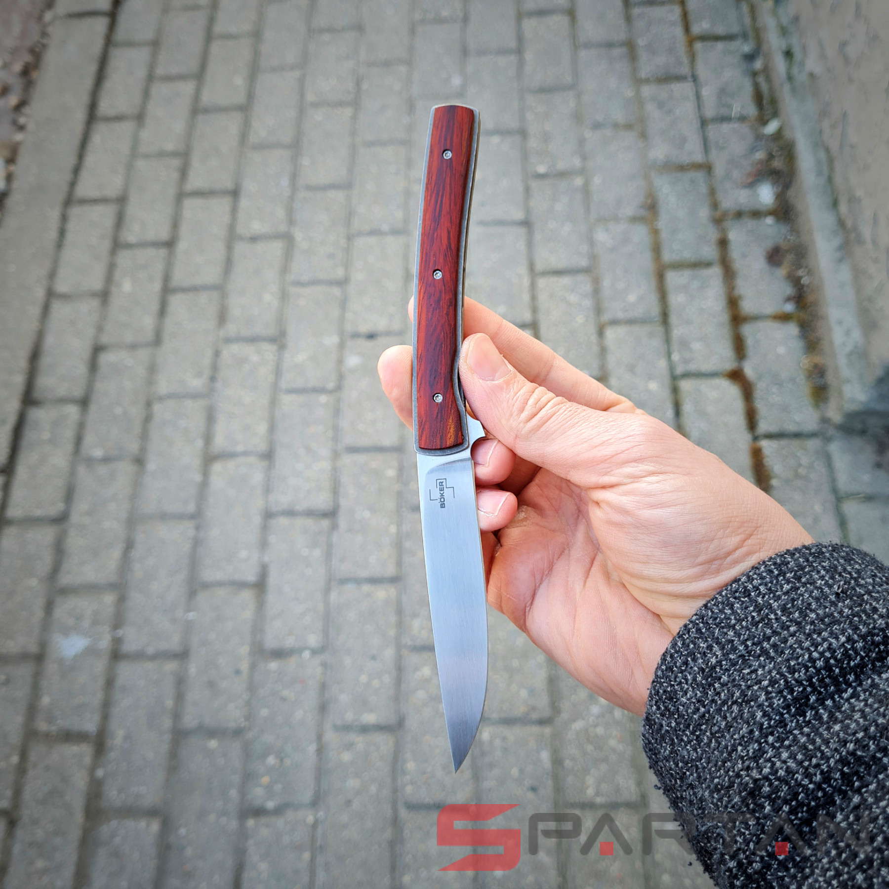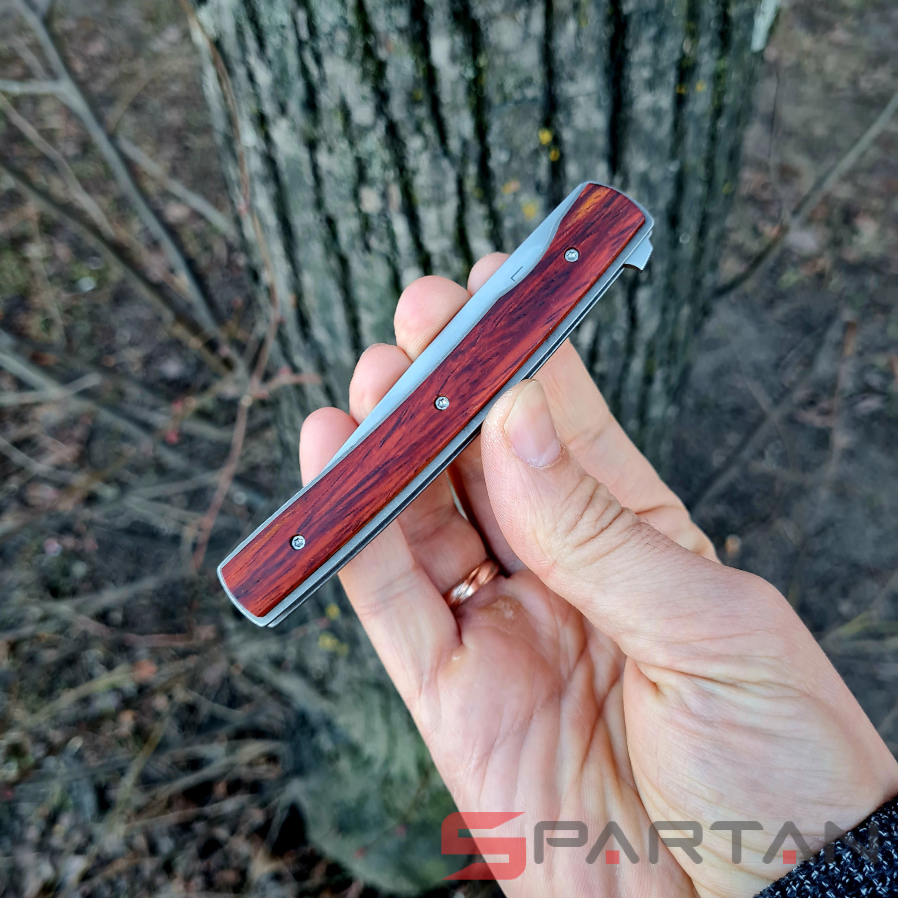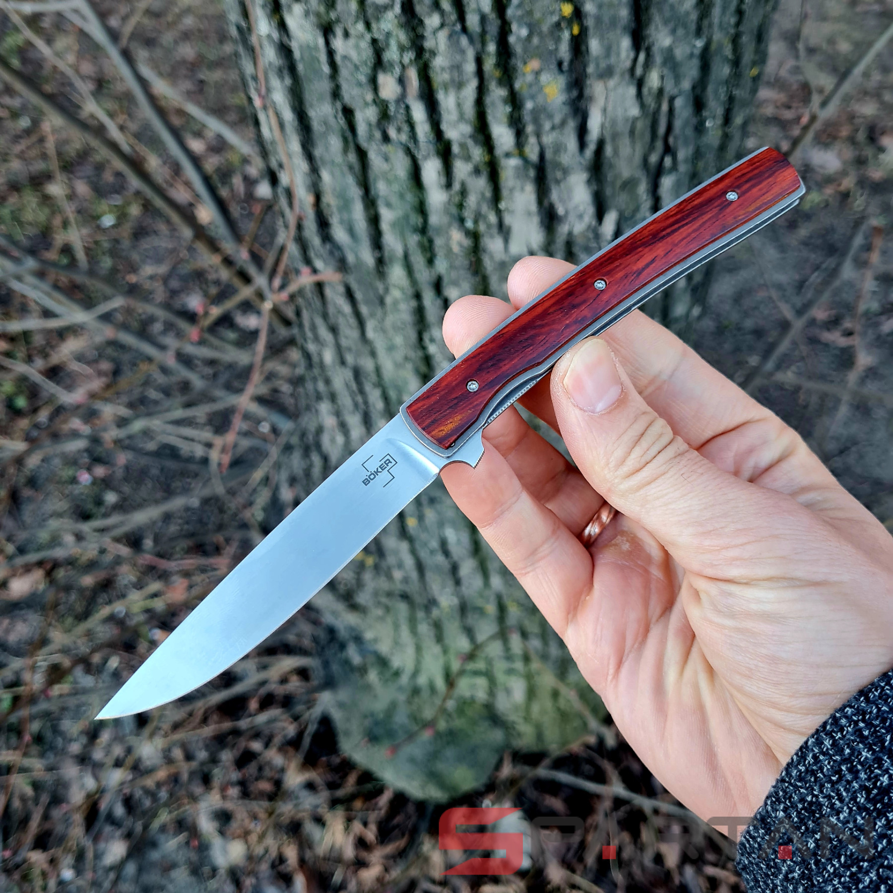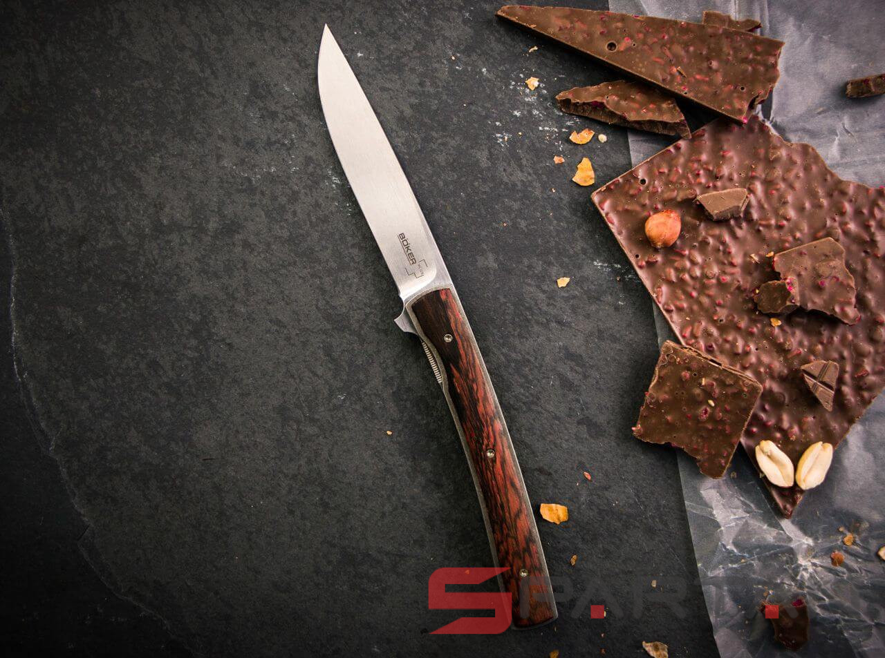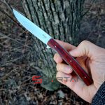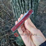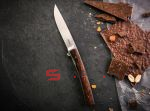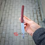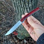 Утонченный и изысканный джентльменский нож от немецкого производителя. Клинок из японской стали VG-10, титановая рама, плашки на рукояти из африканского дерева Cocobolo. В основе конструкции подшипники что и обеспечивает сочное и чёткое открытие клинка, стоит лишь слегка нажать на плавник флиппера. В открытом состоянии флиппер превращается в уверенную стальную гарду, обеспечивая безопасность пальцев пользователя. Учитывая что это полноразмерный нож с клинком без малого 10 см его вес всего лишь 51 грамм. В кармане рубашки или брюках Urban Trapper Gentleman действительно не ощутим. Спокойная строгая внешность не испугает окружающих если решите воспользоваться ножом. Широкая удобная клипса имеет глубокую посадку на карман, её перестановка на другую сторону рукояти не предусмотрена.