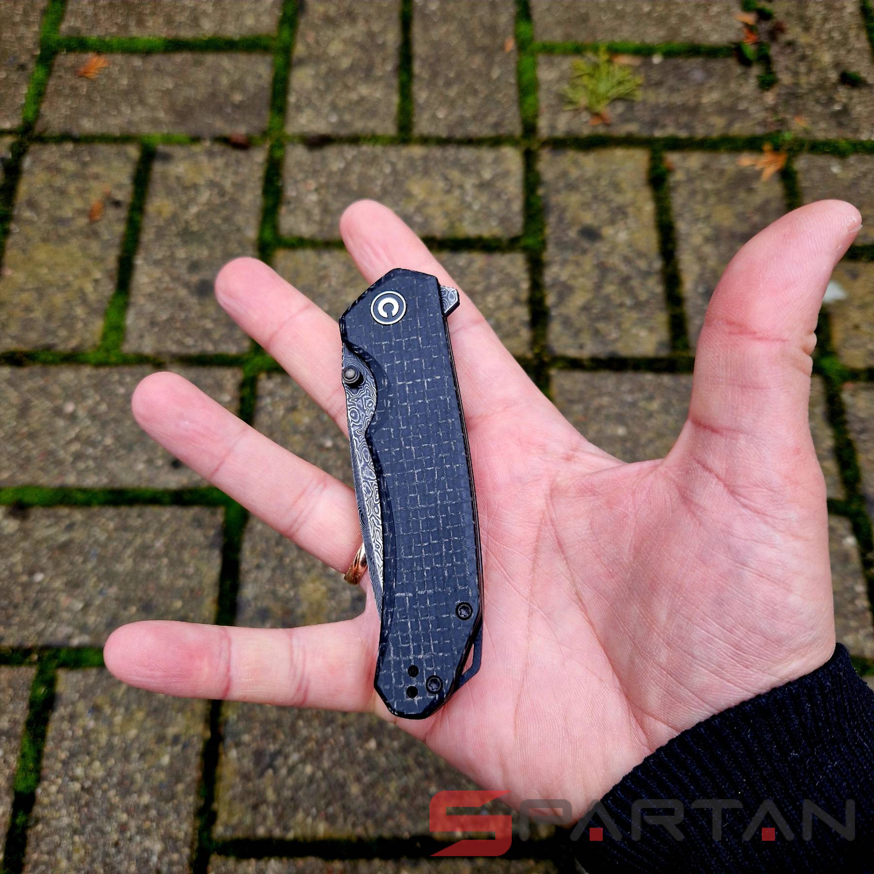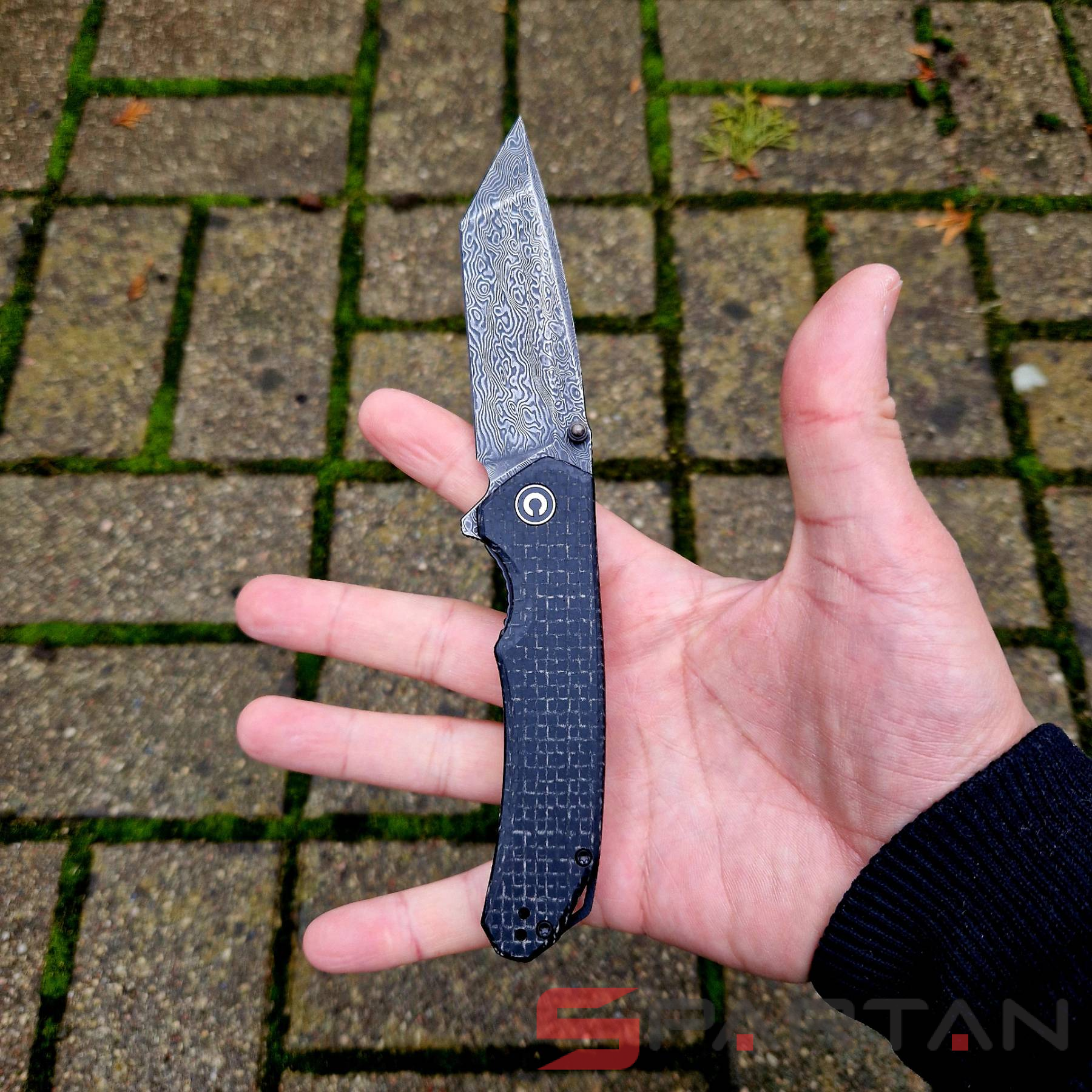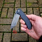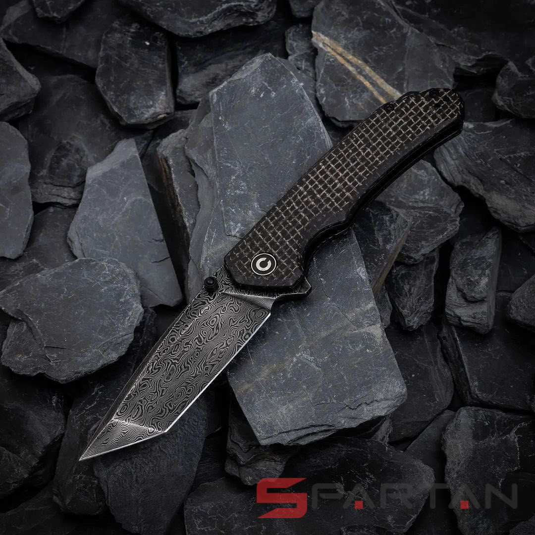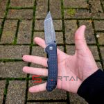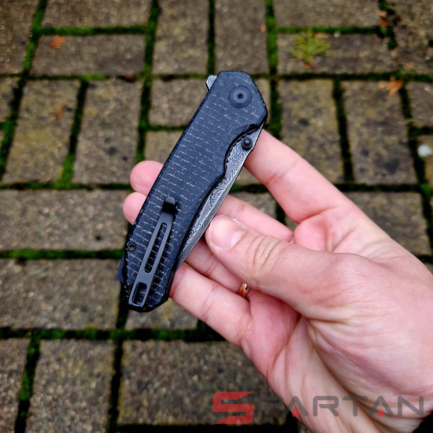 Очень нарядный городской "тантоид" для ежедневного ношения. Нож не слишком крупный и соответственно не слишком тяжёлый, но при этом это полноразмерный нож с очень резучим клинком и пушечной механикой (керамические подшипники). На клинке здесь используется чёрный дамаск, рукоять чёрная микарта с необычной фактурой белой сетки. Благодаря такому броскому сочетанию Brazen выглядит очень дорого, можно сказать даже премиально, при этом приятно удивляет своей сравнительно скромной ценой. Вариантов открытия два: классический плавник флиппера или более традиционный шпенёк на клинке. Удобная клипса глубокой посадки хорошо садится на карман, при необходимости она может быть переставлена на другую сторону рукояти. По итогу имеем удобный и несомненно харизматичный нож с цепкой рукоятью и пробивным клинком.