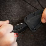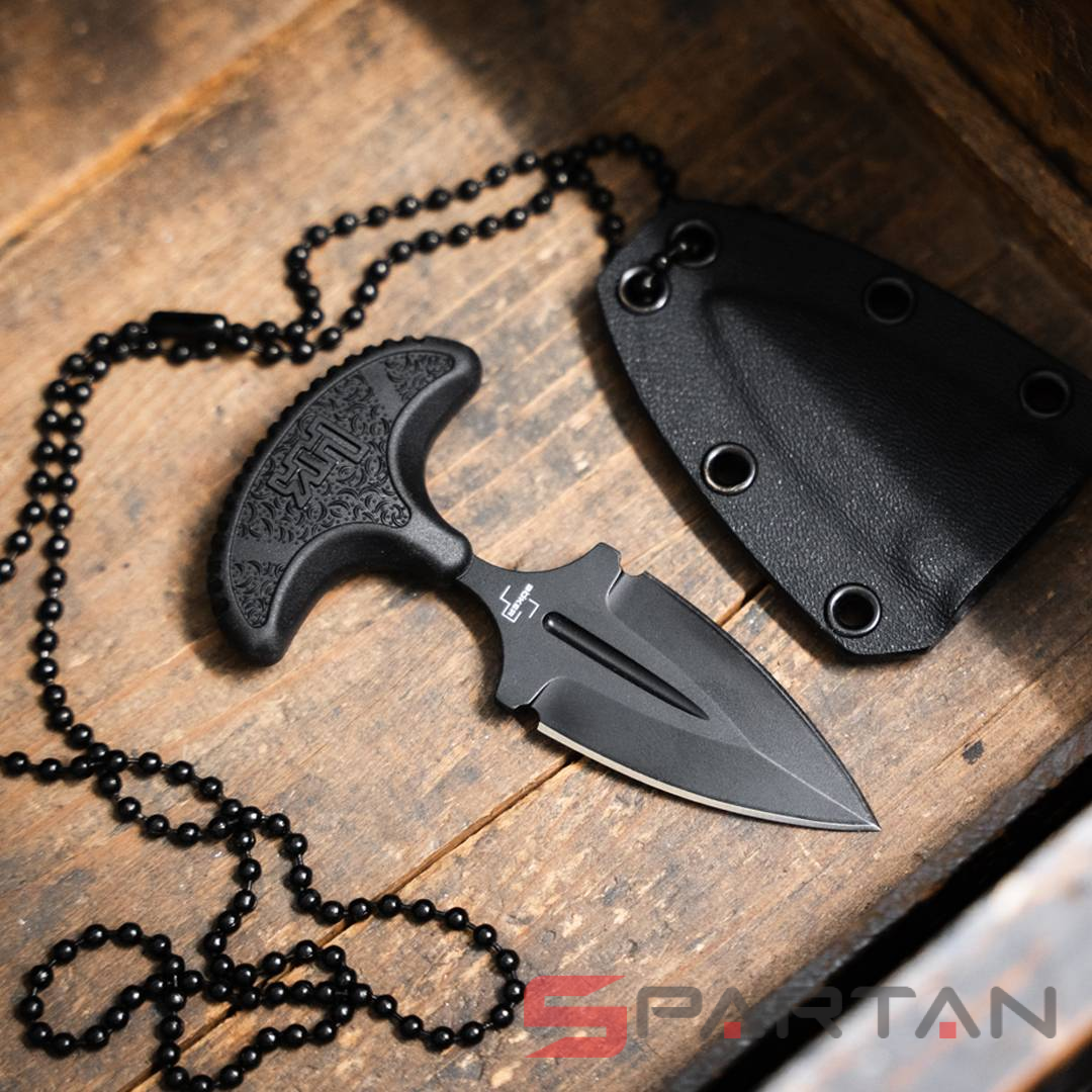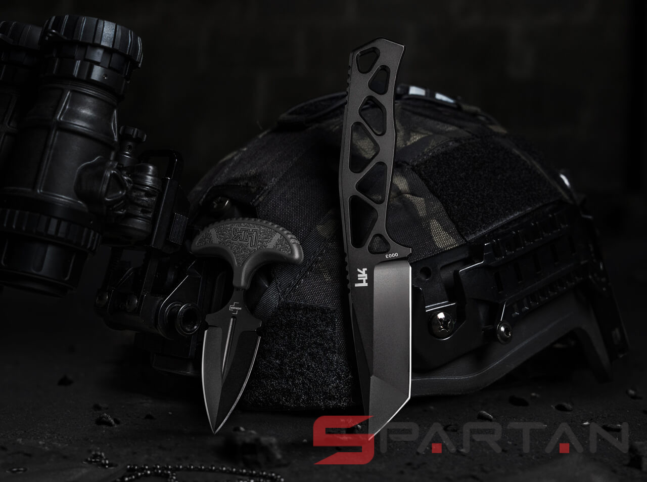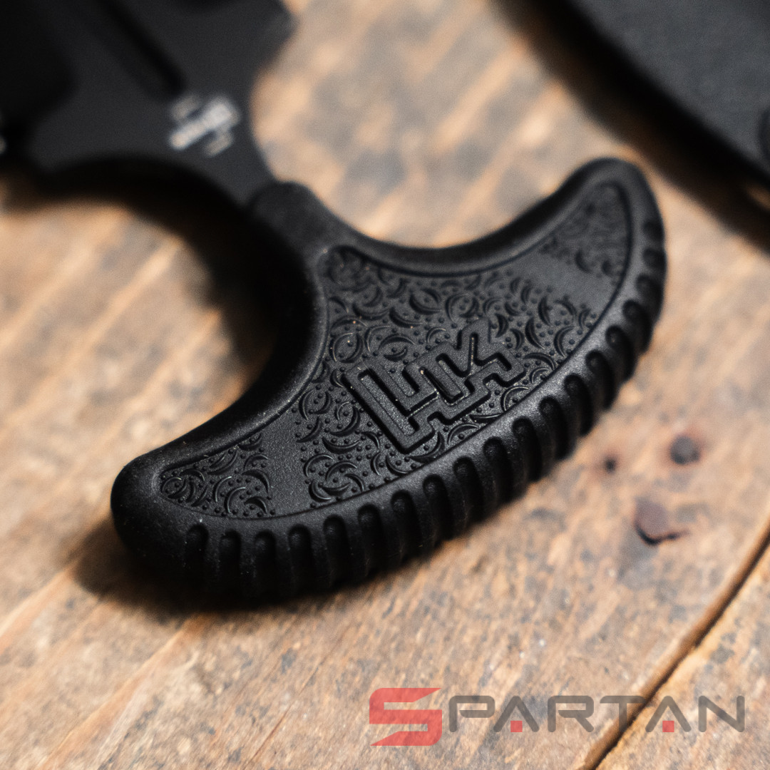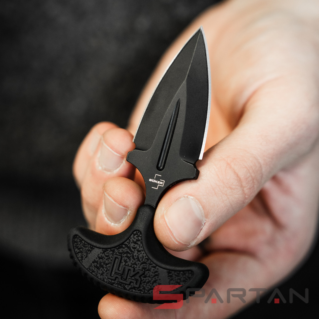 Именитые оружейники Heckler & Koch в сотрудничестве с Boker создали этот компактный тычковый кинжал (push dagger), отлично выполняющий функции ножа последнего шанса для самозащиты в суровых "городских джунглях". Общая T-образная форма позволяет надёжно удерживать рукоять в сжатом кулаке пропустив клинок между двух пальцев. При таком хвате выбить FX02 из руки практически невозможно. Вообще подобные ножы (push dagger) обрели популярность во время золотой лихорадки XIX века в США как оружие скрытого ношения для самообороны, у золотоискателей на Аляске. С помощью такого клинка также было удобно выкраивать одежду из плотной кожи и снимать шкуры. Обоюдоострый клинок FX02 выполнен из американской стали D2 и обладает чёрным антибликовым покрытием. Рукоять изготовлена из термопластика FRN с цепкими насечками. В комплект входят ножны из кайдекса и цепочка для ношения ножа на шее.