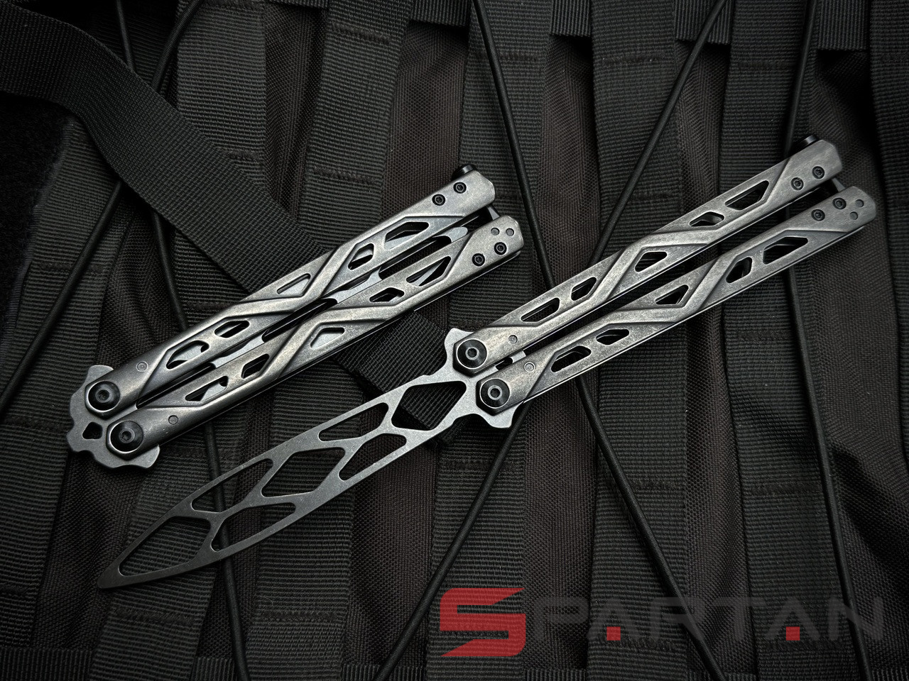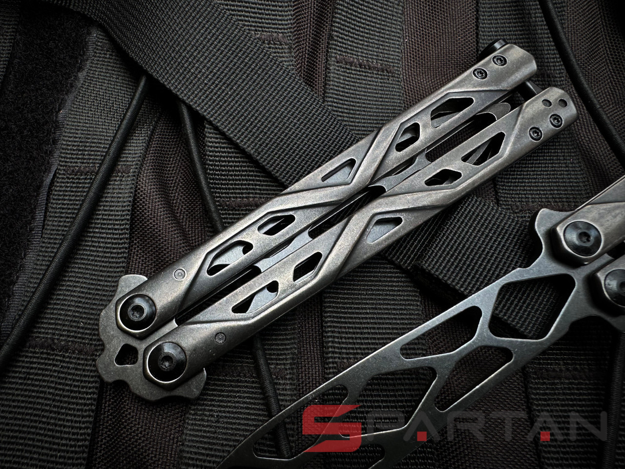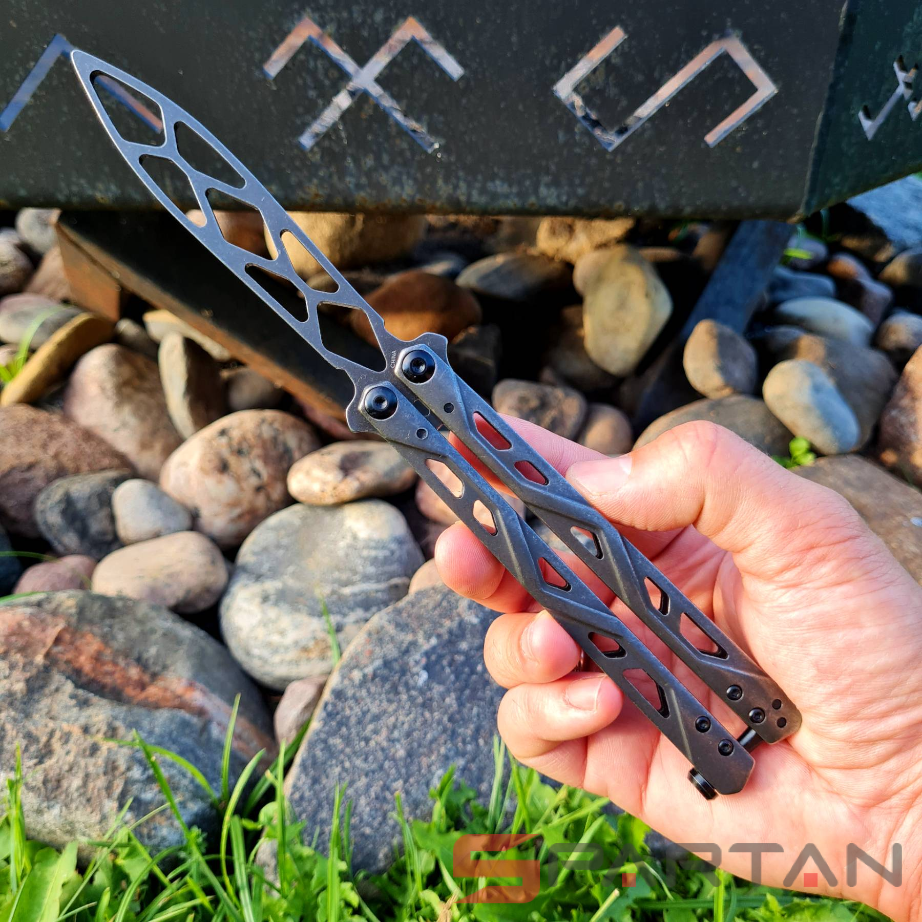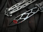 Тренировочный балисонг (нож-бабочка) от американского производителя. По габаритам и весу этот тренировочный балисонг максимально приближен к настоящему. Разница лишь в том что в тренировочном ноже вместо острого клинка установлена абсолютно не заострённая стальная пластина. А чтобы сильно не отличался вес в пластине для облегчения проделаны сквозные отверстия. Балисонг Kershaw Balanza целиком выполнен из стали (на манер боевого балисонга Lucha от этого же производителя), какие-либо пластиковые плашки на рукоятках отсутствуют. За основу взята нержавеющая сталь сверху покрытая стильным тёмным покрытием Black Stonewash. В осевых узлах используется фирменная шарикоподшипниковая система KVT (Kershaw Velocity Technology). Благодаря этому балисонг движется максимально плавно, что делает его идеальным тренировочным инструментом. Рукоять имеет выпуклую фактуру так что удерживается Kershaw Balanza отлично, а выглядит броско и стильно.