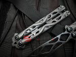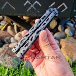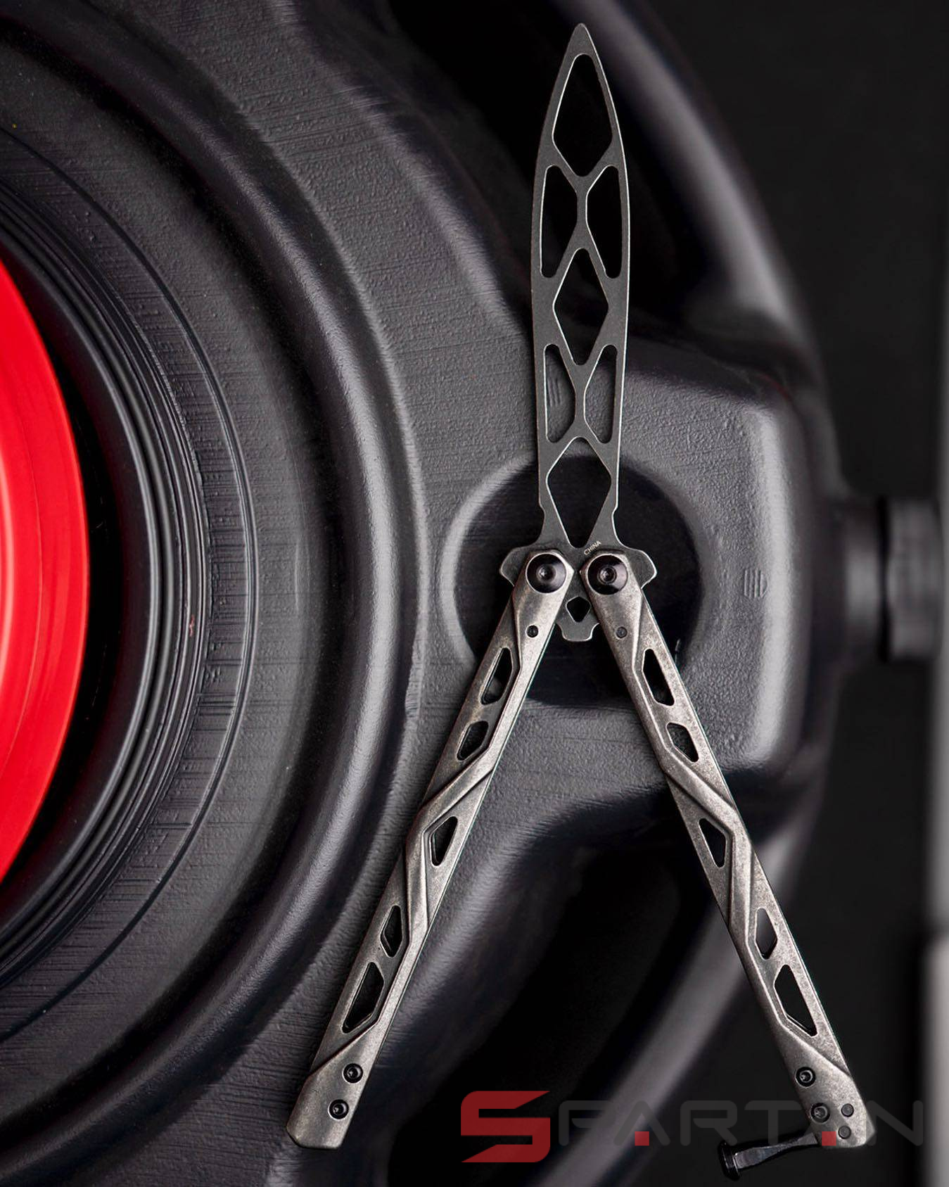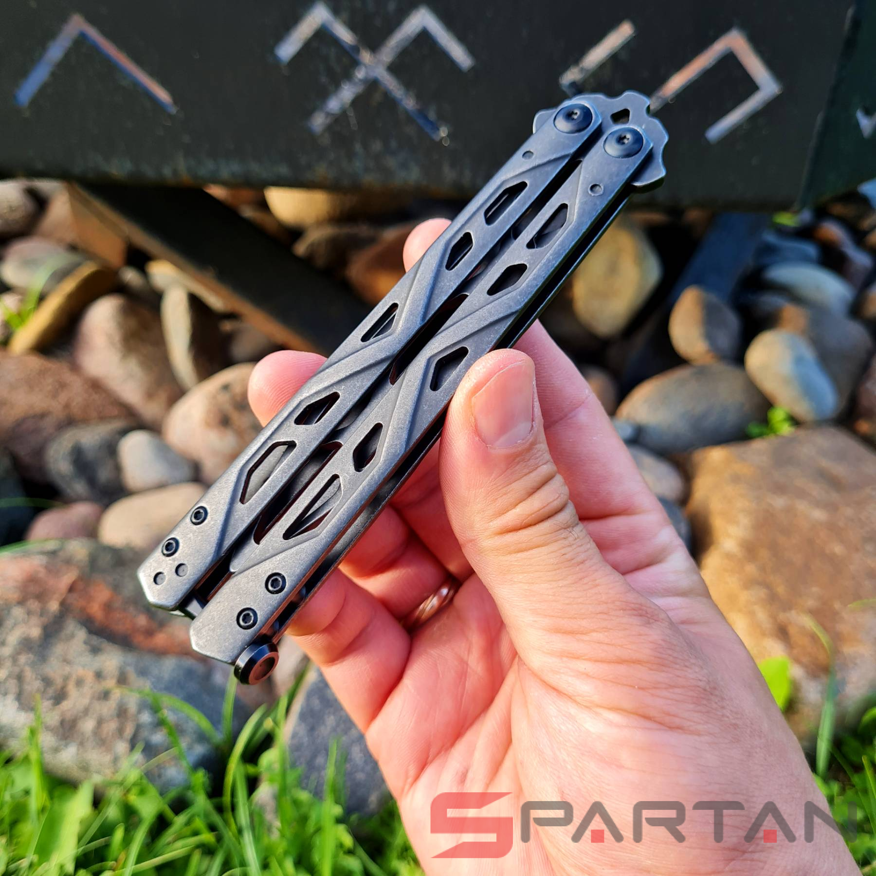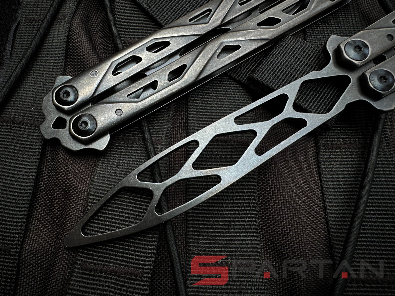 Тренировочный балисонг (нож-бабочка) от американского производителя. По габаритам и весу этот тренировочный балисонг максимально приближен к настоящему. Разница лишь в том что в тренировочном ноже вместо острого клинка установлена абсолютно не заострённая стальная пластина. А чтобы сильно не отличался вес в пластине для облегчения проделаны сквозные отверстия. Балисонг Kershaw Balanza целиком выполнен из стали (на манер боевого балисонга Lucha от этого же производителя), какие-либо пластиковые плашки на рукоятках отсутствуют. За основу взята нержавеющая сталь сверху покрытая стильным тёмным покрытием Black Stonewash. В осевых узлах используется фирменная шарикоподшипниковая система KVT (Kershaw Velocity Technology). Благодаря этому балисонг движется максимально плавно, что делает его идеальным тренировочным инструментом. Рукоять имеет выпуклую фактуру так что удерживается Kershaw Balanza отлично, а выглядит броско и стильно.
