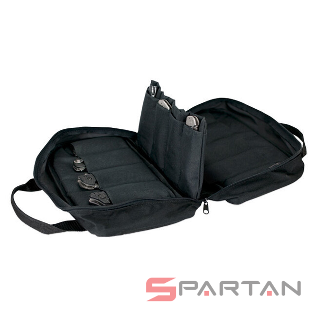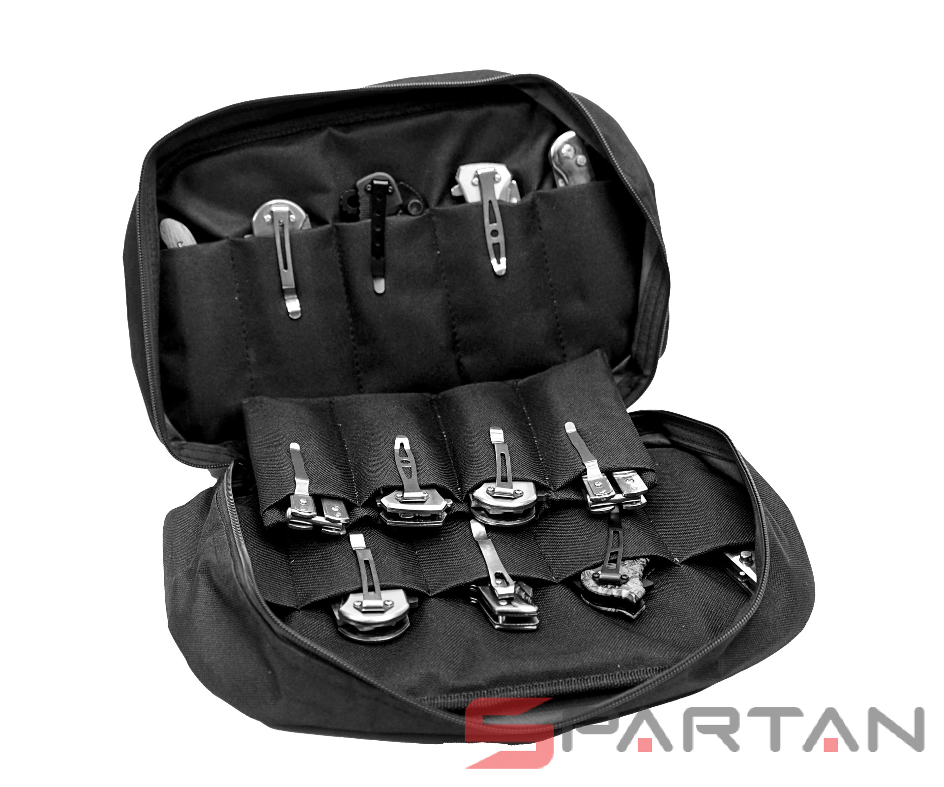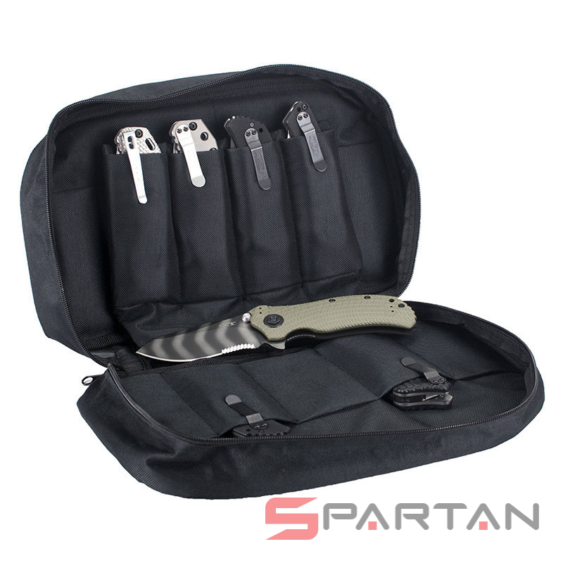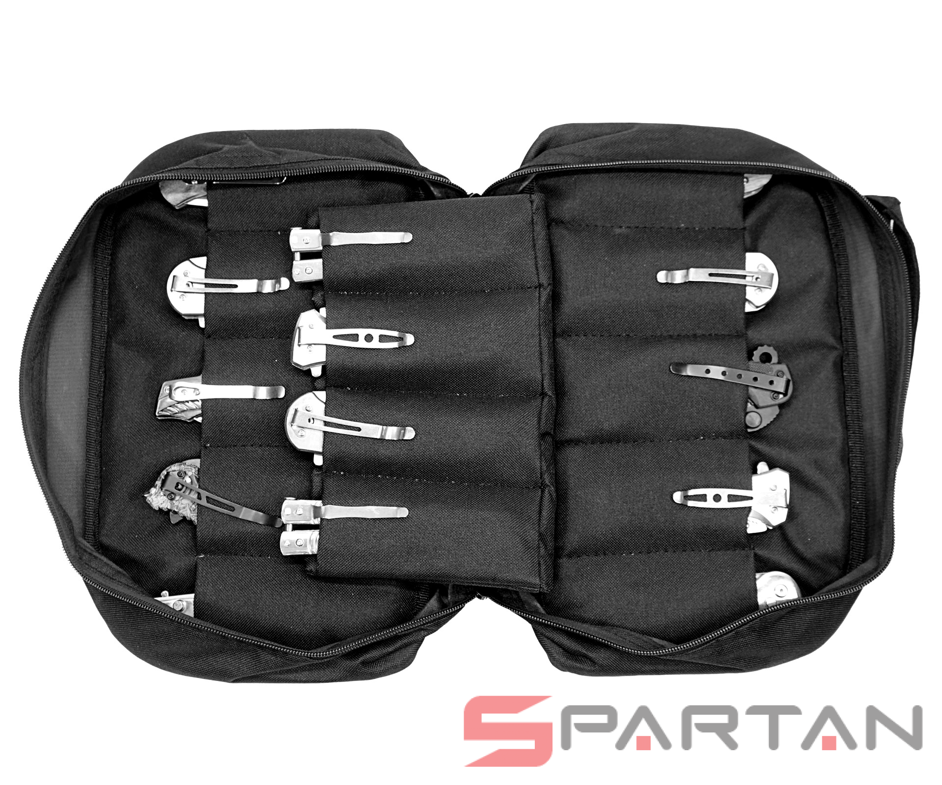 Сумка для хранения и транспортировки ножей, рассчитана ориентировочно на 18 складных ножей. Изготовлена из износостойкого нейлона и снабжена мягкой подкладкой, которая амортизирует возможные удары и таким образом обеспечивает сохранность ваших ножей. Для удобной переноски предусмотрены ремни-ручки, содержимое застёгивается на двойную молнию. Сумка спроектирована таким образом чтобы при полном раскрытии молнии сумка раскрывалась на 180 градусов. На каждой из внутренних стенок располагается по 5 глубоких карманов, в центре размещена съемная секция (на липучке) с 8-ю отделениями. Если ваша коллекция насчитывает более десятка острых-режущих предметов, то пожалуй стоит присмотреться к такому варианту хранения своих любимцев. Зарубежные магазины в описании указывают "ножи в комплект не входят", но так как мы не держим своих клиентов за дебилов, писать такое не будем :).