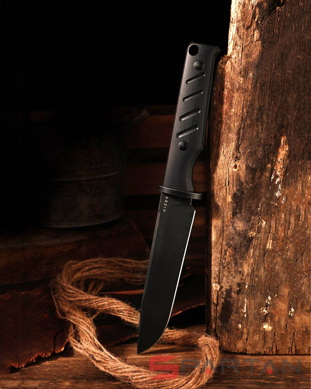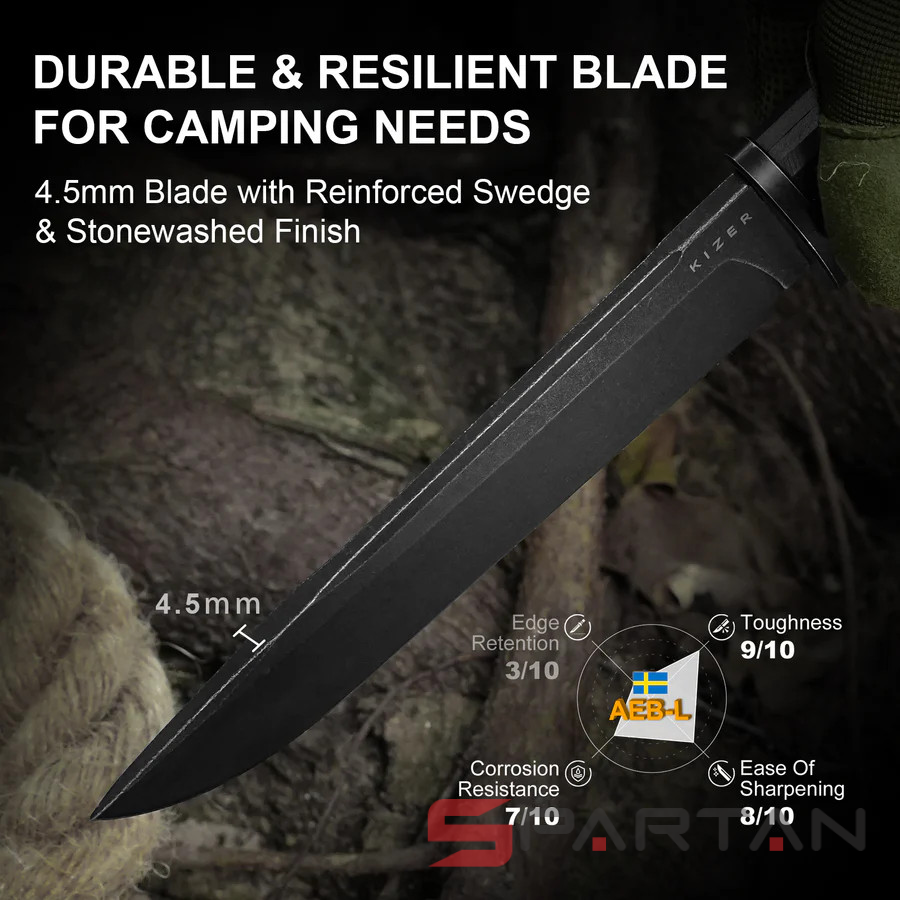 KIZER Camp 180 имеет конструкцию full tang, то есть изготовлен из цельнометаллического куска стали толщиной 4.5 mm. Ножи такой конструкции небезосновательно считаются самыми прочными и долговечными. Именно поэтому они привлекают определенную категорию пользователей: выживальщиков, туристов, охотников и рыболовов.