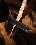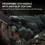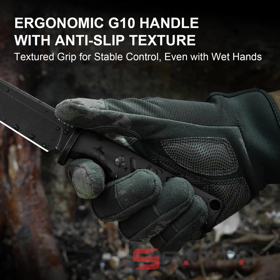 Объемная и ухватистая рукоять позволяет хорошо контролировать нож. Основу рукояти формирует полноразмерный хвостовик, в выступе которого, на конце, проделано отверстие для страховочного шнура. Накладки изготовлены из самого технологичного в настоящее время стеклотекстолита G10 - композитного материала, обладающего прочностью металла и весом пластика. Текстурированная поверхность, ярковыраженая подпальцевая впадина и стальная гарда препятствует скольжению ножа даже в мокрой ладони.