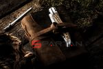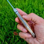 Плашки из дерева Зебрано прибиты декоративными гвоздиками. Сами плашки имеют выпуклую форму благодаря чему рукоять получилась бочкообразной и хорошо удерживается в руке. На одной стороне шляпки гвоздиков образуют крест из 7 точек. Согласно одной из легенд он является знаком счастья, удачи и благополучия. Считается, что впервые такой крест был нанесён пастухами, которые использовали воткнутый в хлеб или землю нож так, чтобы крест встал вертикально, для молитв, когда они не находились дома и не имели возможности посещать церковь.
