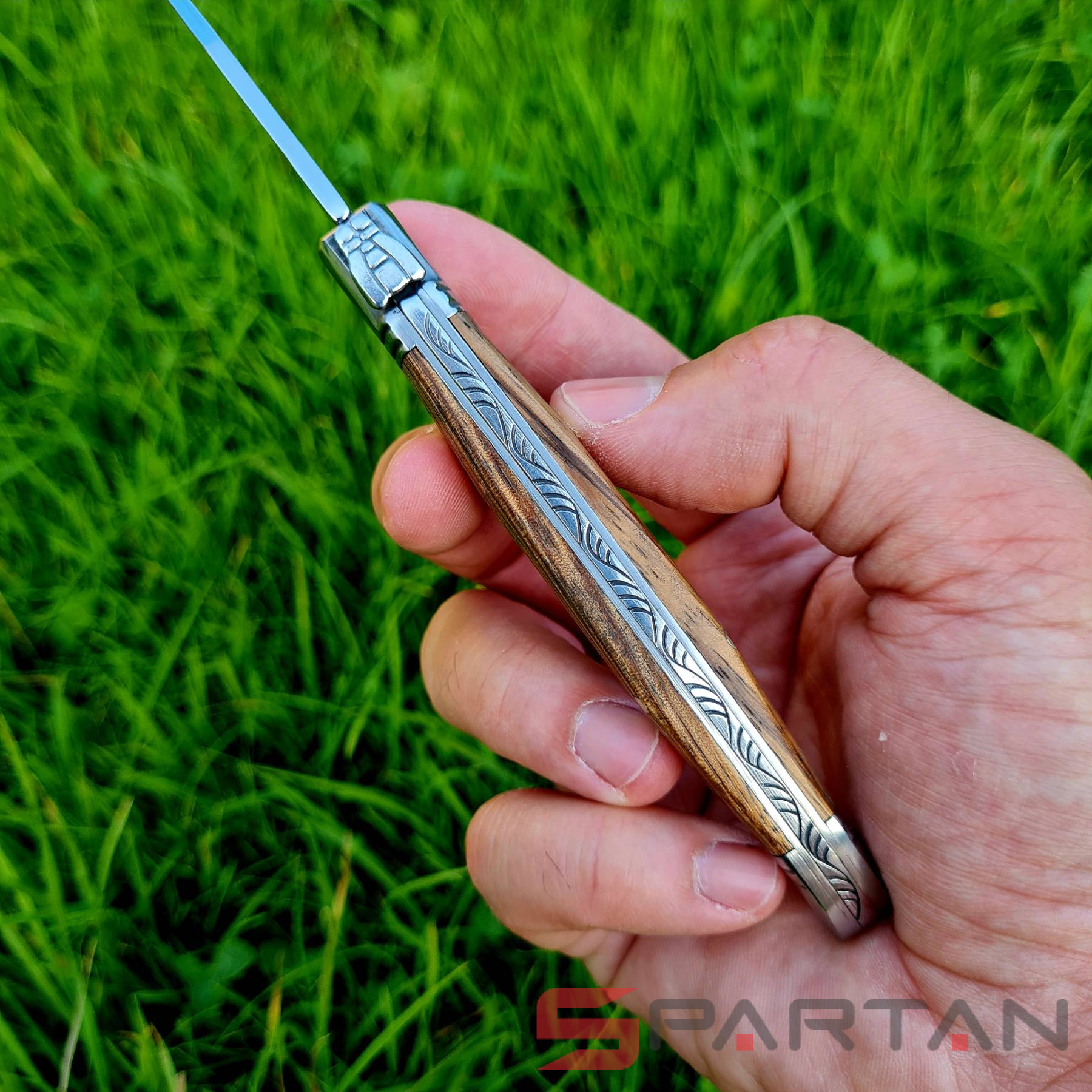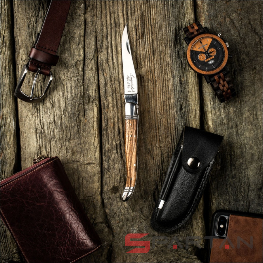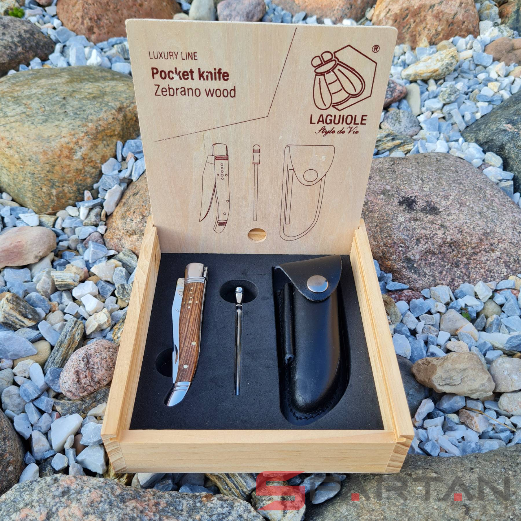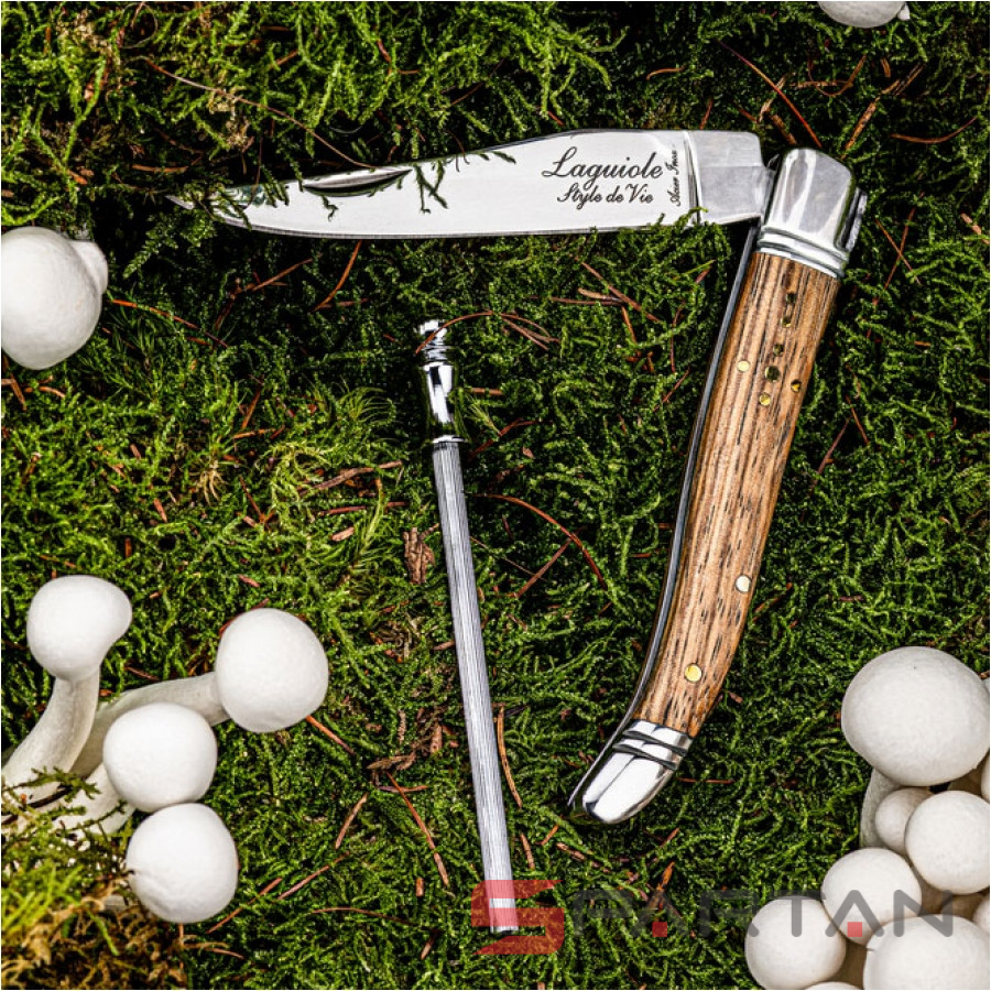 Классический карманный нож Laguiole в исполнении голландских мастеров Style De Vie. Они постарались сохранить весь шарм аутентичных французских ножей, которые производятся в местечке Laguiole с 1829 года. Нож поставляется в деревянной коробке, в которой помимо ножа имеется чёрный кожаный чехол для ношения на поясе и компактный мусат для правки клинка. Нож изготовлен из нержавеющей стали, на рукояти накладки из экзотического африканского дерева Зебрано. На обухе рукояти традиционная маленькая стальная пчёлка и извилистая гильошировка. Теплый, ламповый ножичек, который может выполнять роль прекрасного подарка.