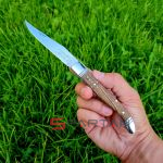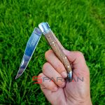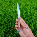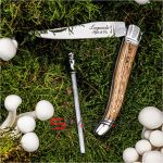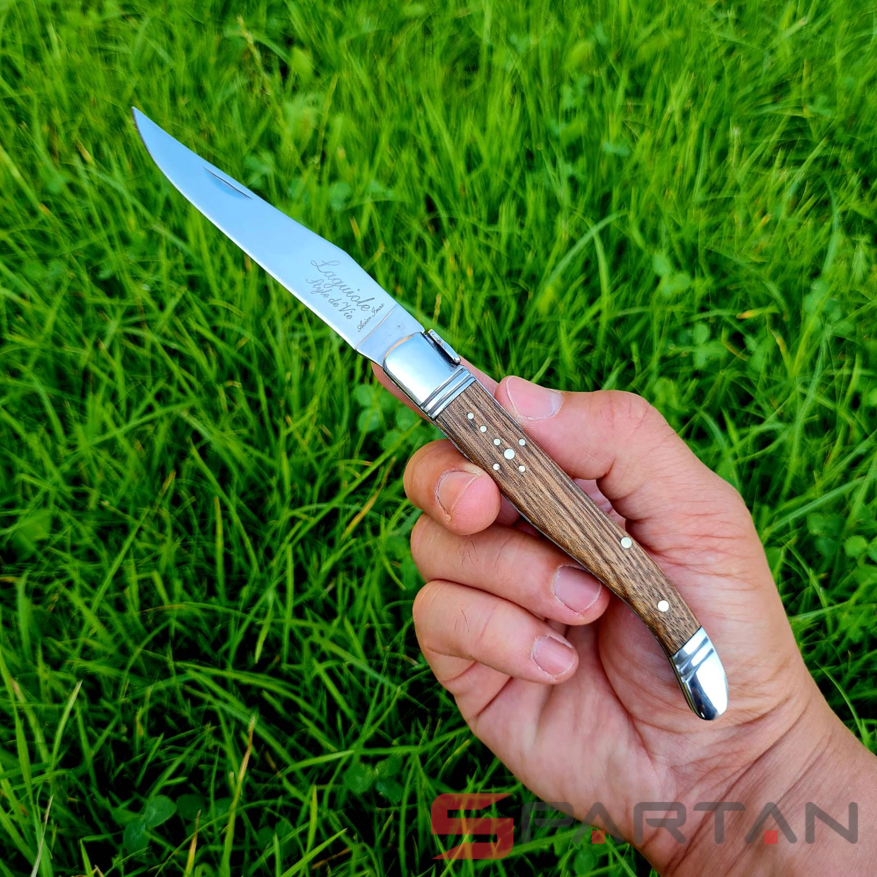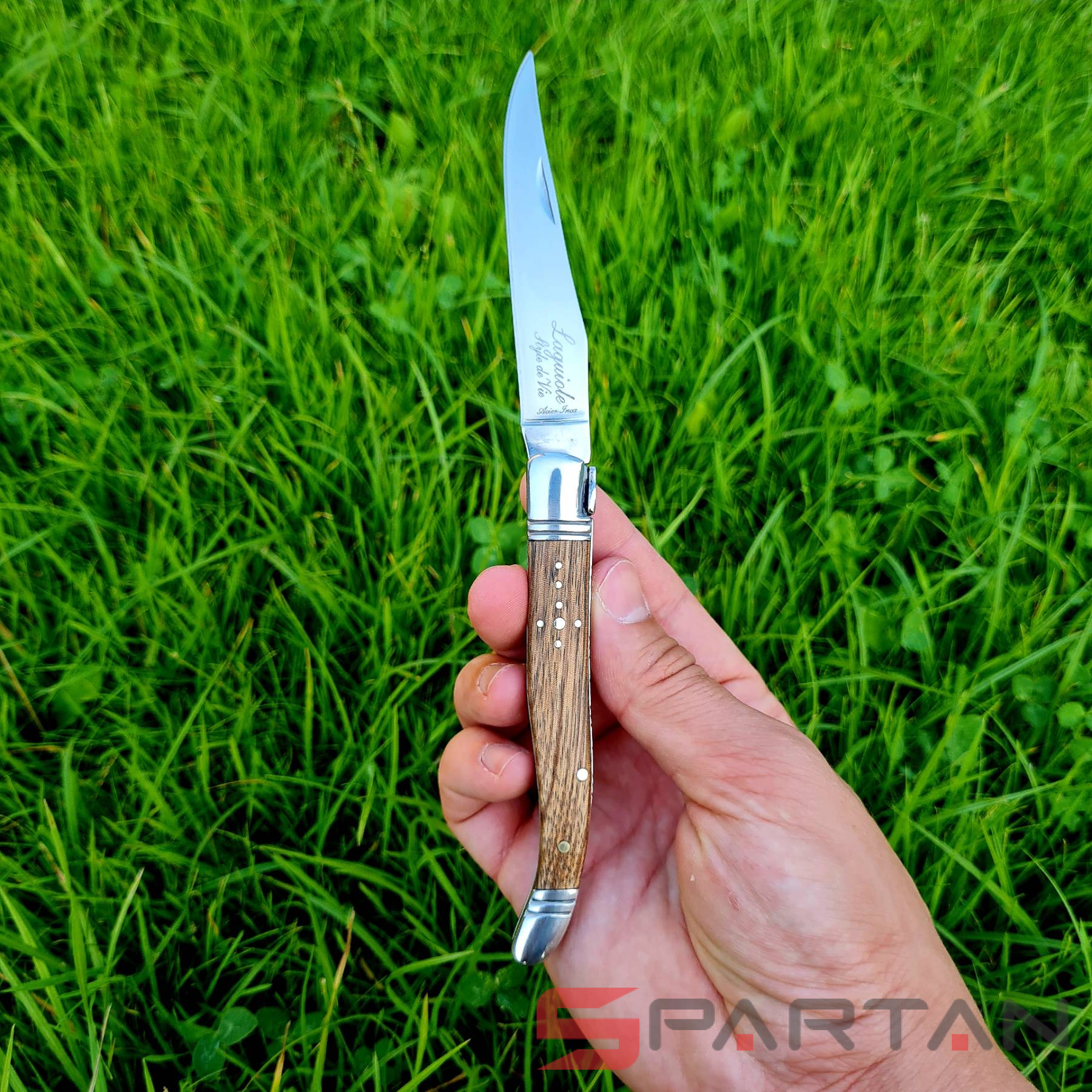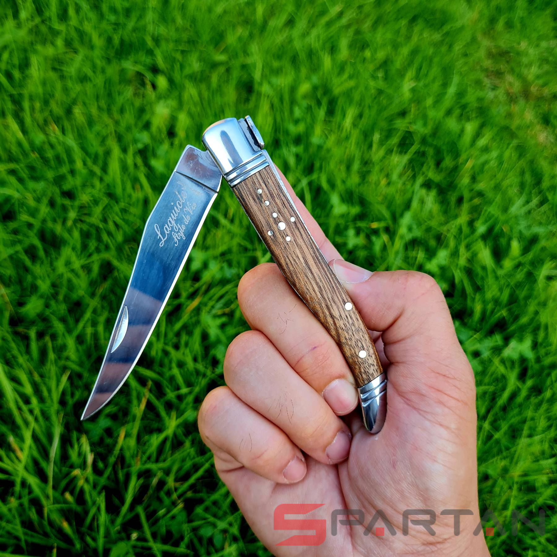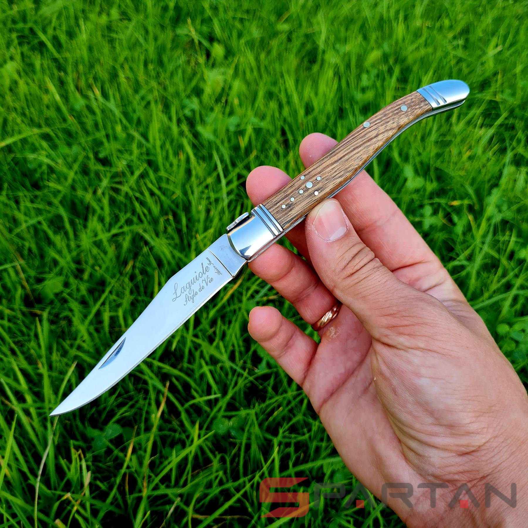На клинке из нержавеющей стали есть небольшая прорезь для зацепа ногтем, хотя нож прекрасно открывается и без этого - просто потянув пальцами за клинок. Высокие спуски от обуха и узкий клинок позволяют Laguiole очень прилично резать. Этот нож однозначно придётся кстати как на загородном пикнике, так и за обеденным столом.