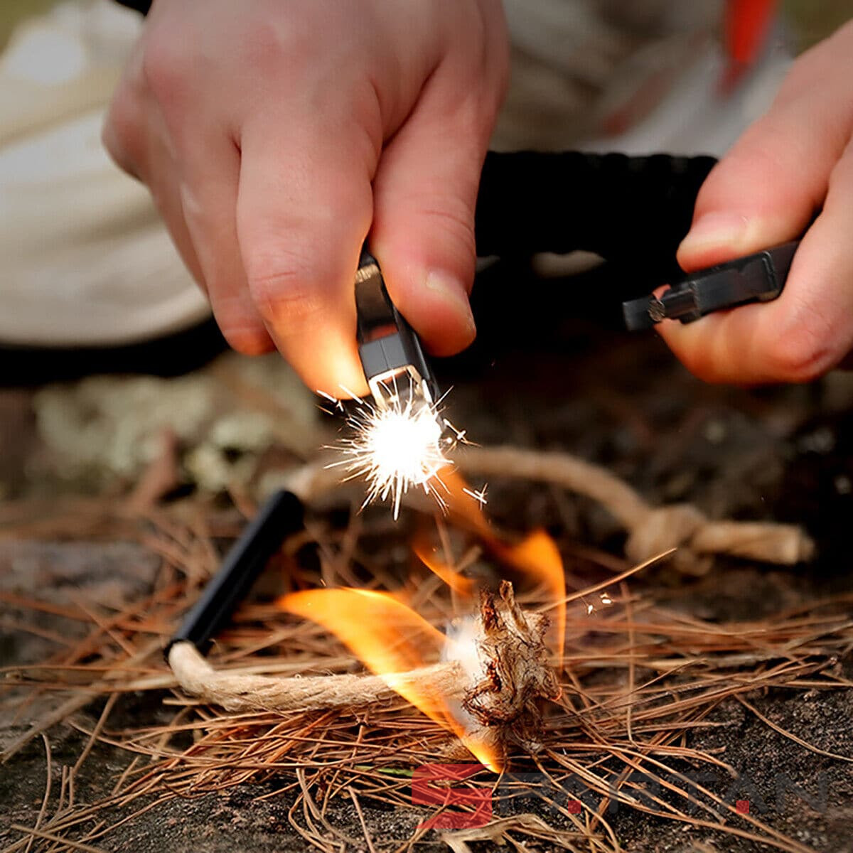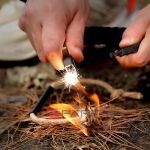 2. Огниво с кресалом. Огниво крайне желательно иметь при себе в походе. Ведь в отличие от спичек, оно не отсыреет, даже если попало в воду. Оно долговечное (в отличие от зажигалки), его ресурс может составлять тысячи применений.  С огнивом Вы сможете развести огонь, даже если все вещи насквозь промокли. Стержень огнива интегрирован в одну половину карабина.