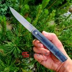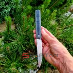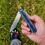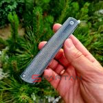 В основе рукояти стальная конструкция закрытая сверху накладками из "джинсовой" микарты. Несмотря на отсутствие гарды, подпальцевых выемок, агрессивной насечки и т. п. элементов - Esquire на удивление уверенно удерживается даже мокрыми руками. Форма рукояти очень эргономичная, ничего не наминает, так что таким ножом приятно резать много и долго.