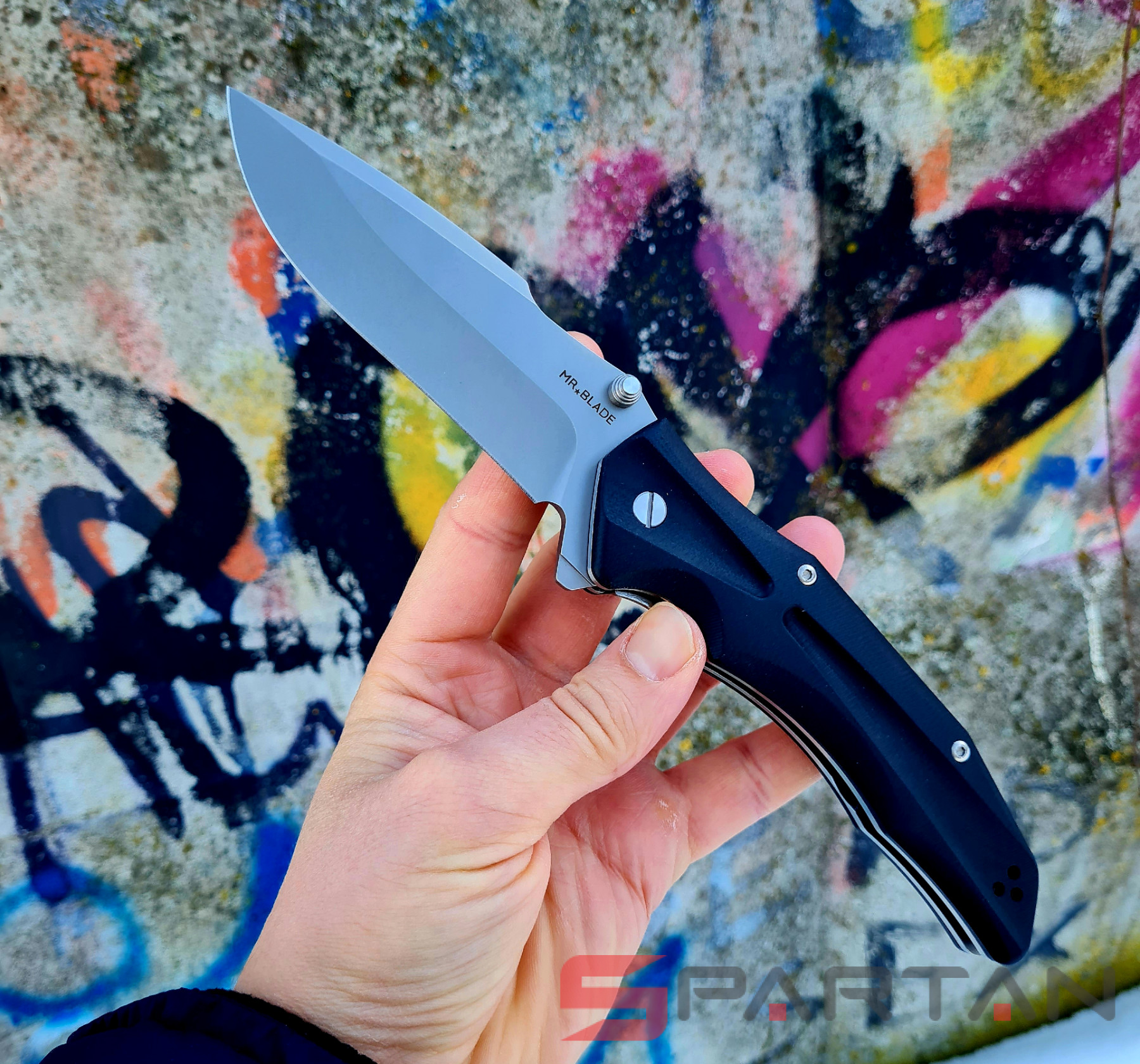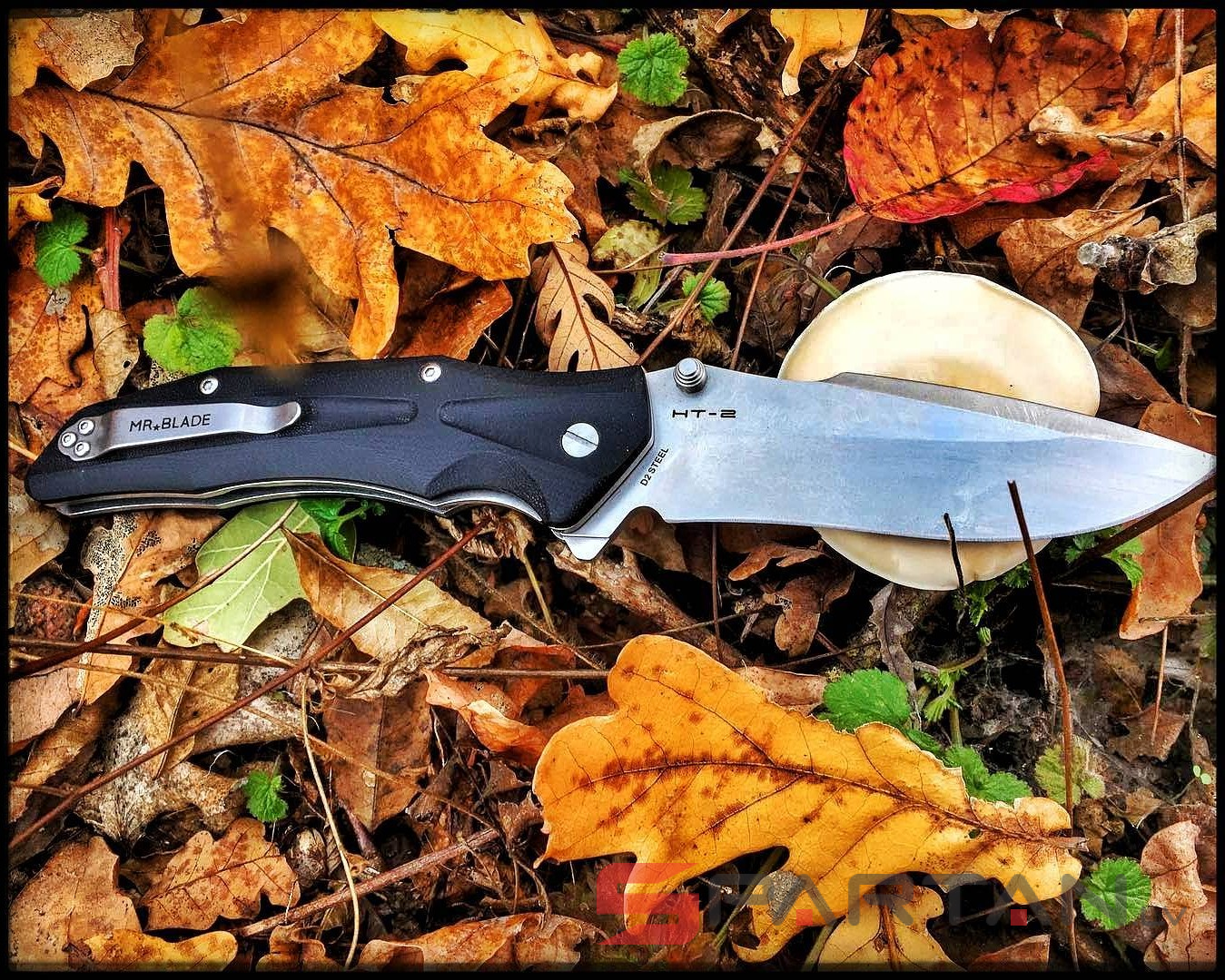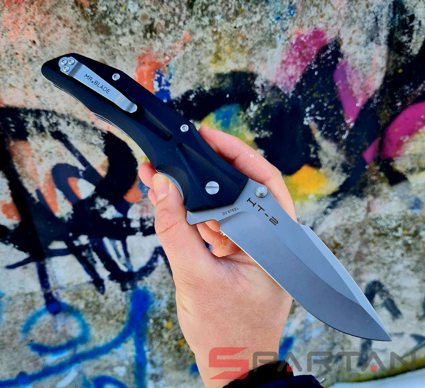 Mr.Blade HT-2 - большой, тяжёлый, надёжный! Нож ладно скроен и крепко сбит. Никаких люфтов, неровностей, и лишних зазоров. Клинок выполнен из американской стали D2, рукоятка из пластика G10. Нож идеально ложится в мужскую руку, им удобно работать как прямым, так и обратным хватом. Открывается тремя способами: подтолкнув плавник-флиппер указательным пальцем; толкнув шпенёк на клинке большим пальцем; просто резким взмахом руки (чисто инерционно). В любом случае нож открывается с сочным оружейным щелчком. Плавность хода клинка безумно крутая - оно и понятно, ведь здесь использованы не шайбы, а подшипники.
