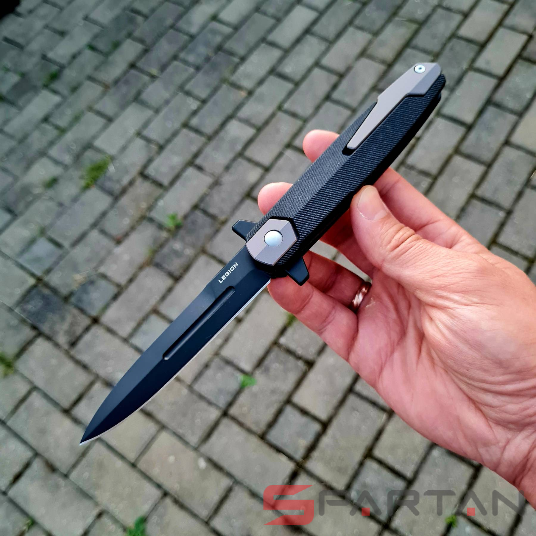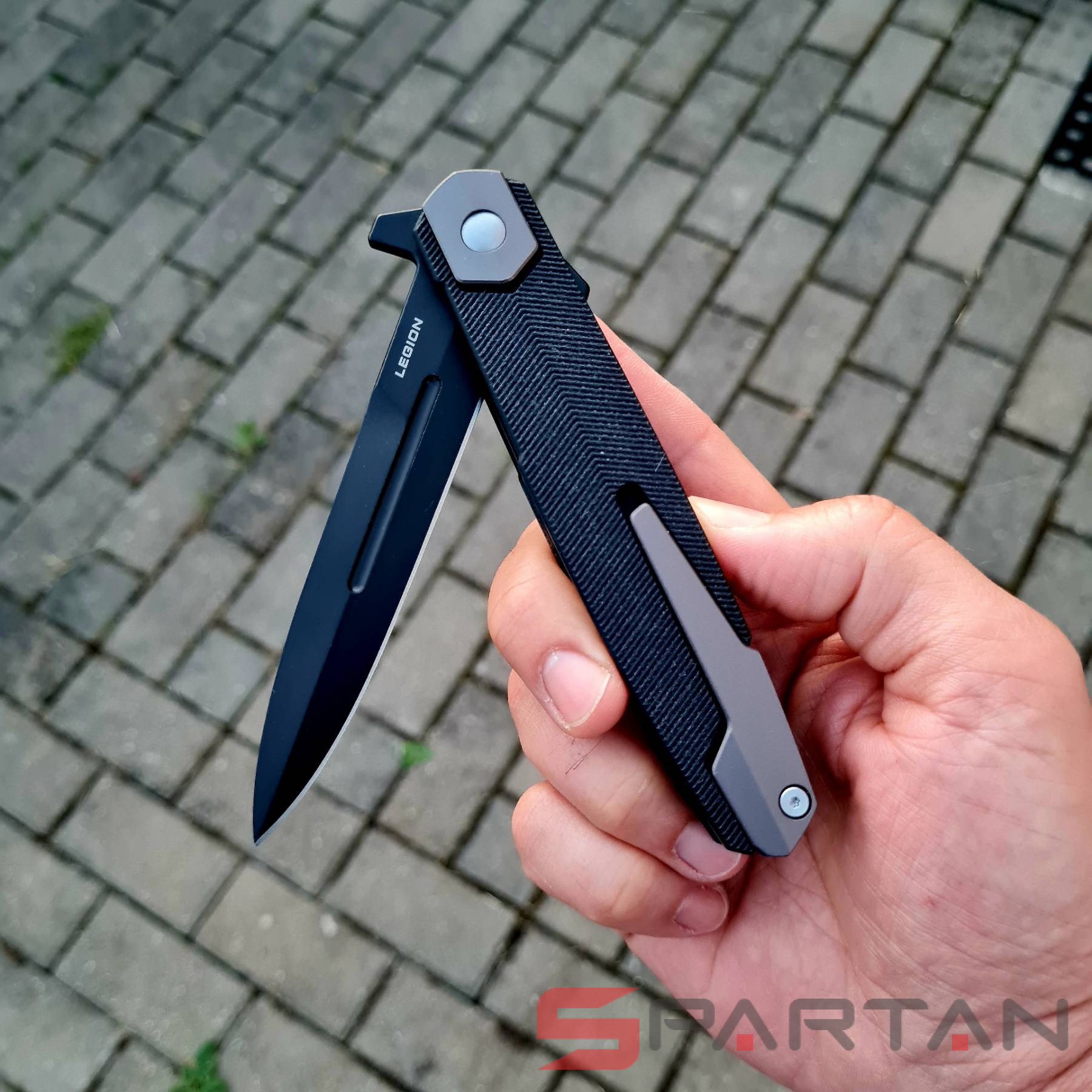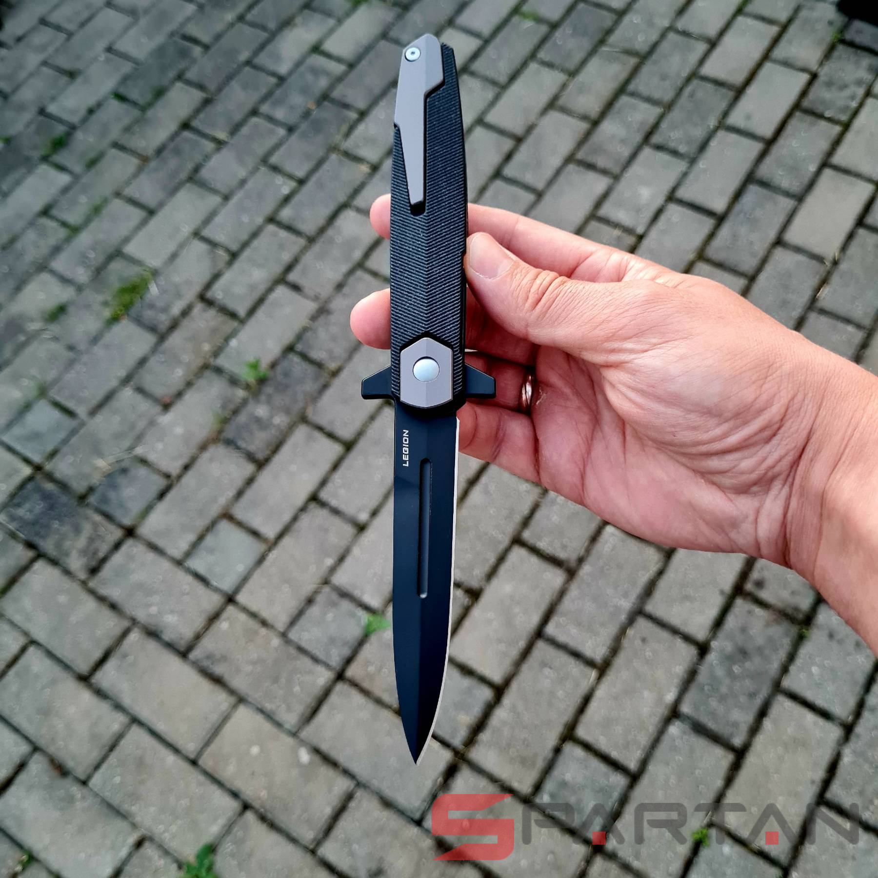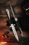 Имя ему - Legion, нож производит впечатление с первого взгляда. Крупный с кинжальным клинком и объемной хорошо лежащей в руке рукоятью, он вызывает ассоциации одновременно с древними мечами и формами космических кораблей из классической фантастики. Клинок выполнен из американской стали D2, накладки на рукояти из рельефной G10, длинная узкая клипса фрезерована из титана. В осевом узле установлены керамические подшипники обеспечивающие мягкий ход клинка и его стремительный выброс даже при легком нажатии на развитый флиппер-гарду. К слову Legion также бодро открывается зацепом об карман, при доставании оттуда ножа. Кинжальная форма клинка делает этот нож идеальным для проникающих действий, хотя с другим задачами он также вполне справится. В очередной раз Mr.Blade смогли создать нож в котором функциональность плотно сплетена со стилем и наделили его бешеной харизмой!