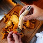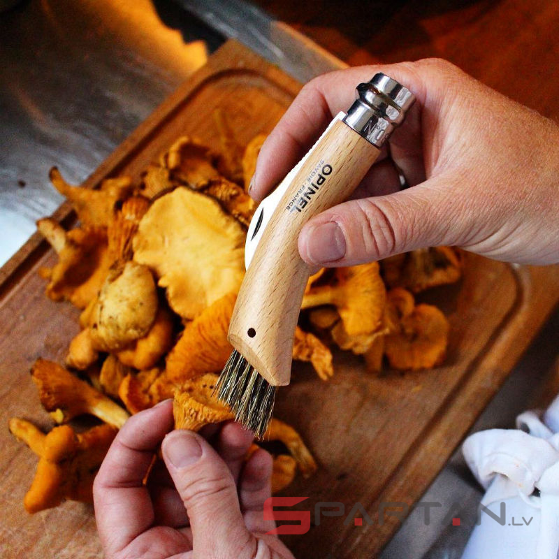 Казалось бы что для похода за грибами не требуется особый нож, но французские ножеделы из OPINEL считают иначе. Складной нож грибника Opinel 8 INOX Mushroom таит в себе несколько интересных усовершенствований. На тыльнике рукояти размещена щеточка для очистки грибов от листьев и иголок. На обух ножа нанесена насечка, которая применяется для чистки грибов в полевых условиях. Вогнутым клинком удобно срезать грибы на толстой или тонкой ножке. Компактные размеры и небольшой вес, позволяют носить нож в кармане, не испытывая дискомфорта. Впрочем при желании можно приобрести фирменный кожаный чехол OPINEL Outdoor L. Сталь клинка нержавеющая, так что опасаться коррозии после прогулок по осеннему лесу, не стоит.