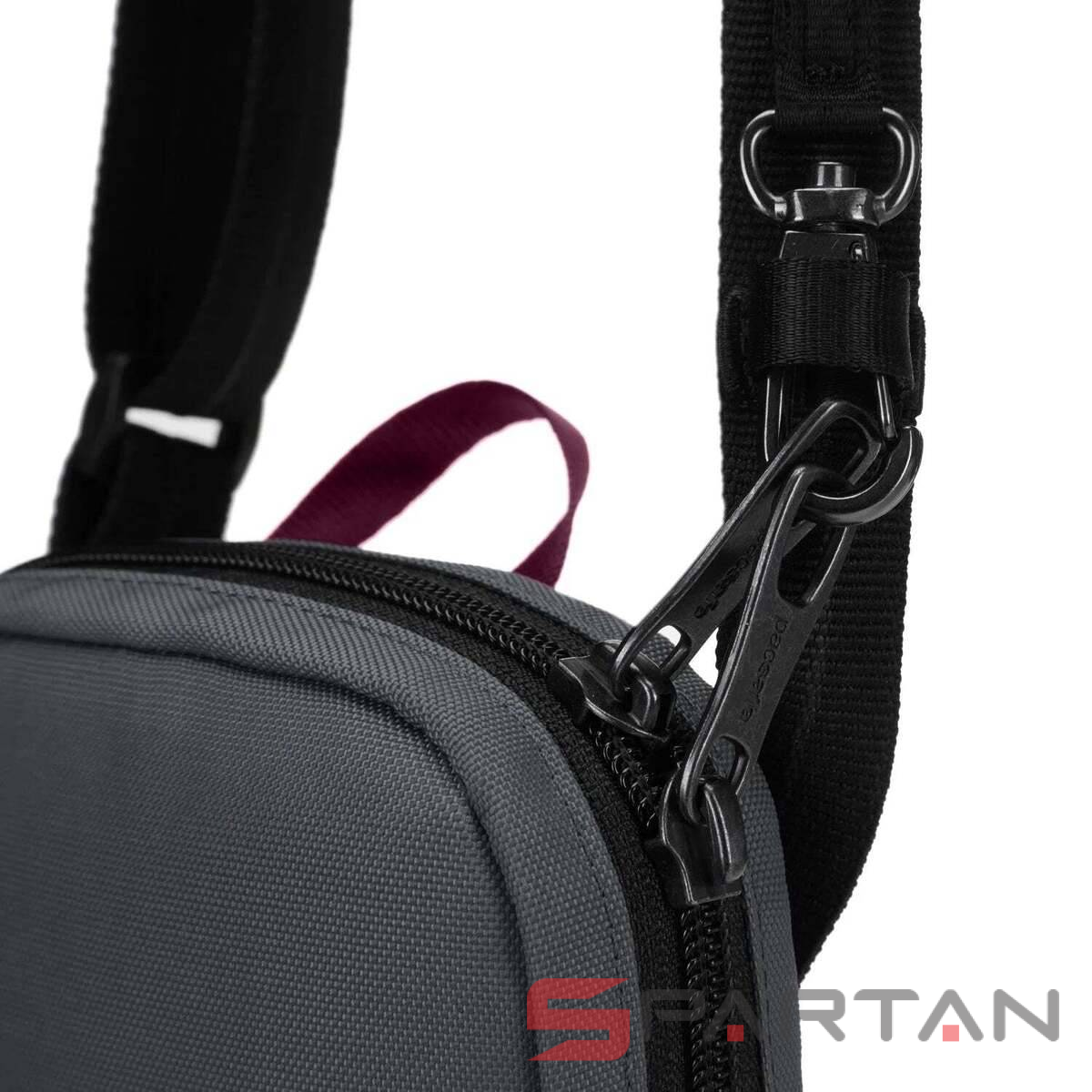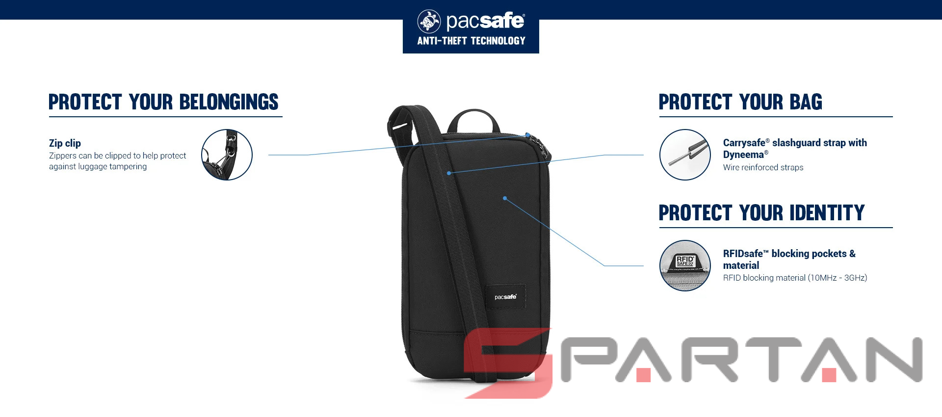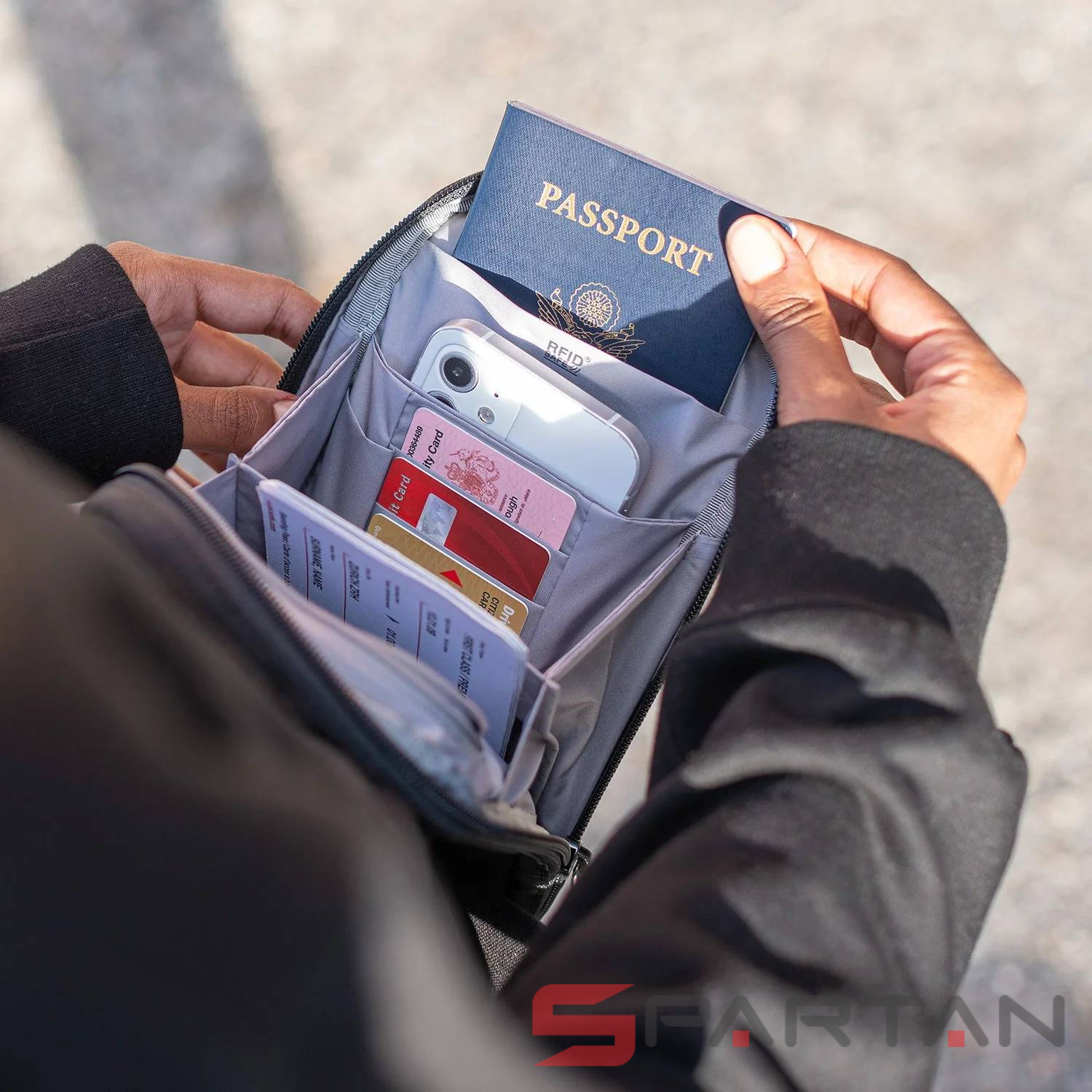 Практичная компактная сумка-кошелек для путешествий, активного отдыха и обычного повседневного использования. Она способна уместить и упорядочить все самые важные и дорогие вещи: документы, кредитные карты, наличные деньги, ключи и т. п. Сумка полностью открывается круговой молнией, открывая доступ ко всему содержимому распределенному перемычками и карманами. Сумку можно носить на шее или через плечо, либо спрятав лямку в специальный карман, разместить в рюкзаке. В плане "брони" в сумке использован материал RFIDsafe (блокировка бесконтактного считывания), в лямку вшита стальная стропа (невозможность срезания), бегунки молний блокируются специальным стальным карабином. При необходимости сумку можно носить даже под верхней одеждой!