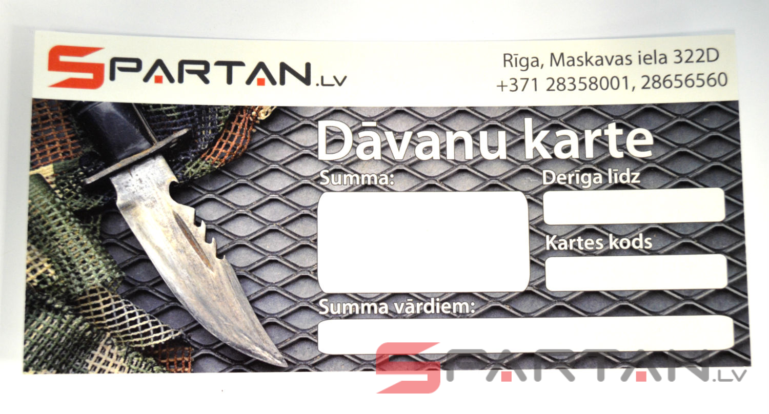 Ломаете голову над подарком мужу/брату/сыну/шефу/другу/знакомому? Безусловно нож, точильная система или просто крутой аксессуар из ассортимента SPARTAN.lv - это отличный подарок. Но как узнать что ЕМУ понравится на 100%? Идеальный вариант – электронная подарочная карта SPARTAN.lv! Мы предлагаем подарочные карты с гибким номиналом от 20 до 500 EUR. Срок годности карты 6 месяцев. Если стоимость выбранного товара превышает номинал карты, возможна доплата наличными. Электронная подарочная карта активна сразу после оплаты, вы получите код на e-mail, можете его дарить кому захотите. Напишите код подарочной карты на этикетке носков, на открытке, на совместном фото - даже на торте! Совсем нет времени? Отправьте код по смс!