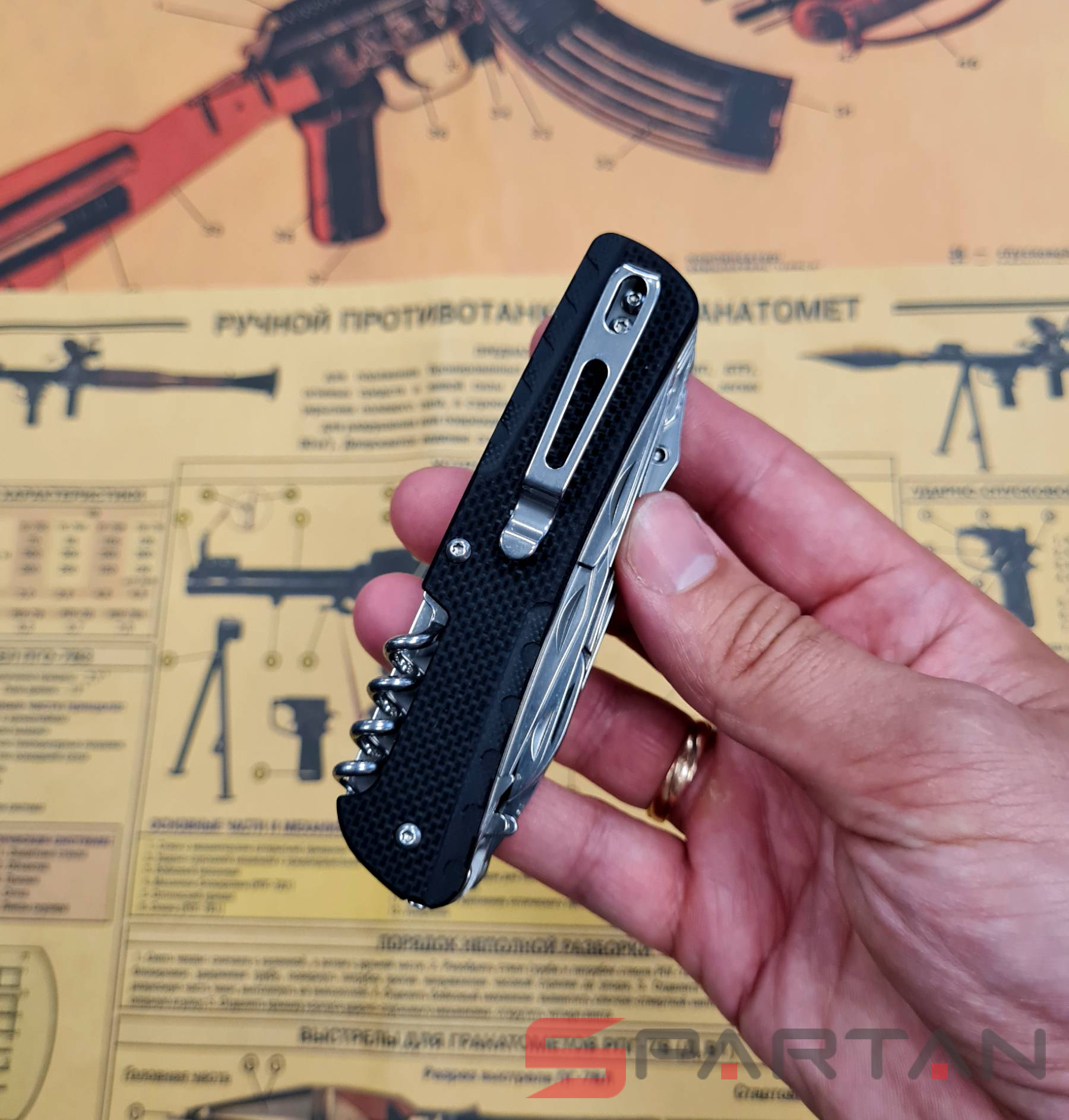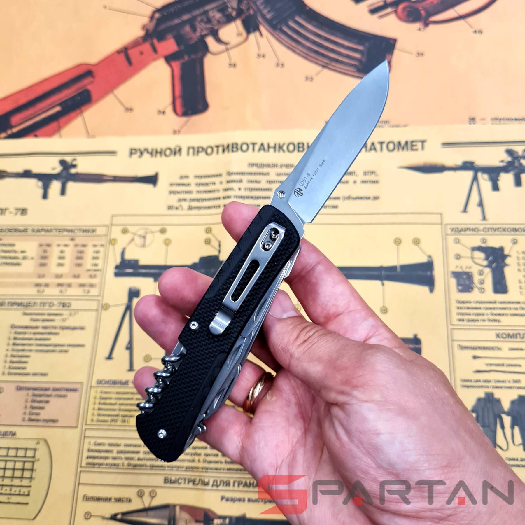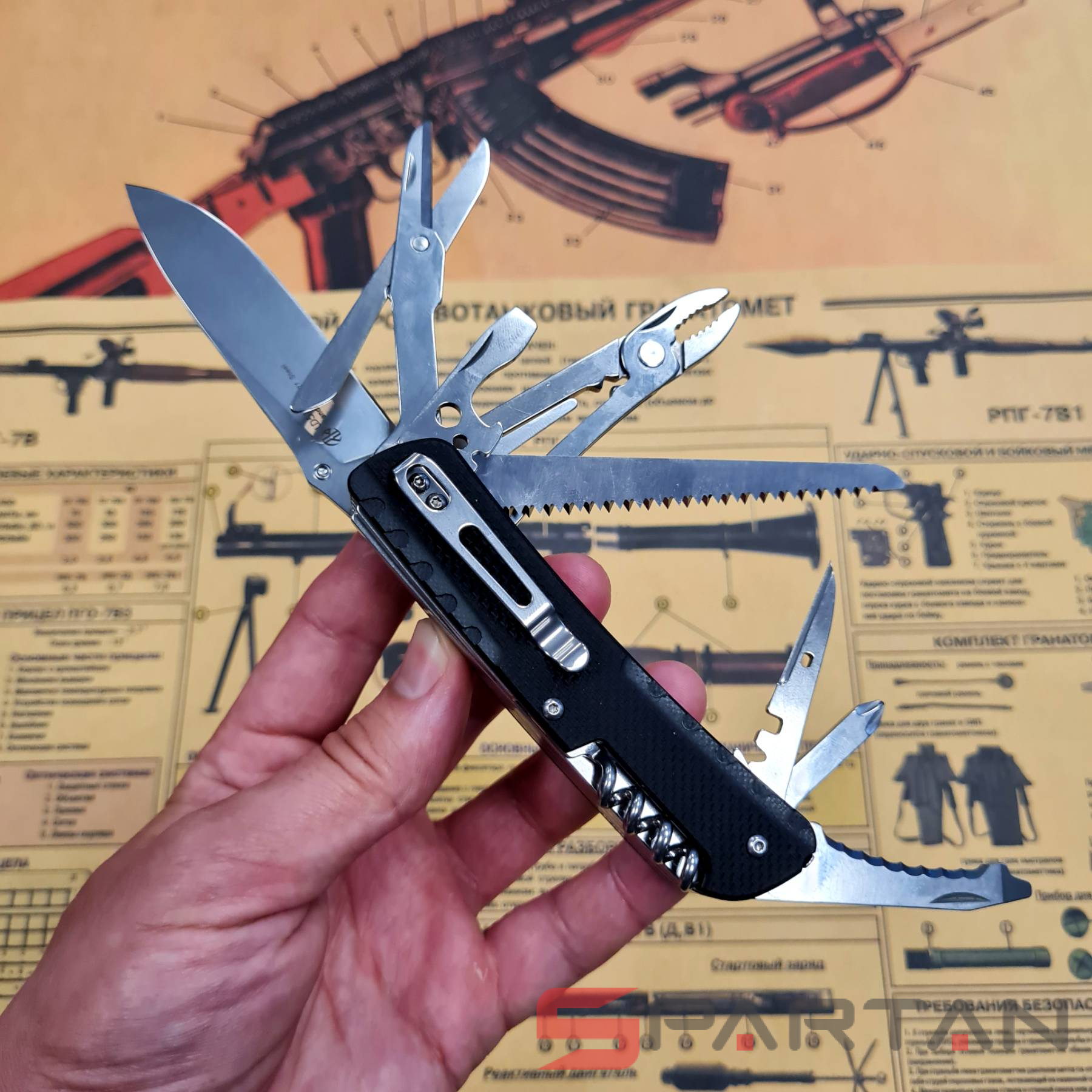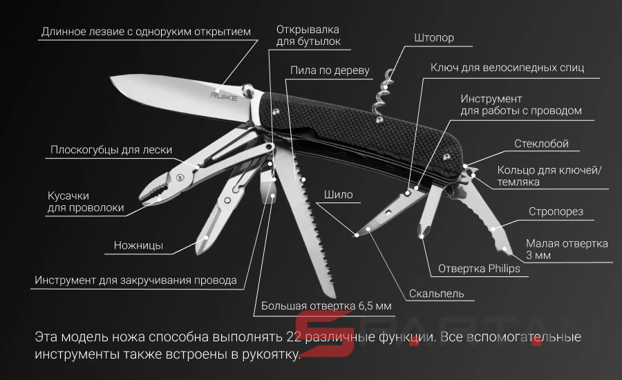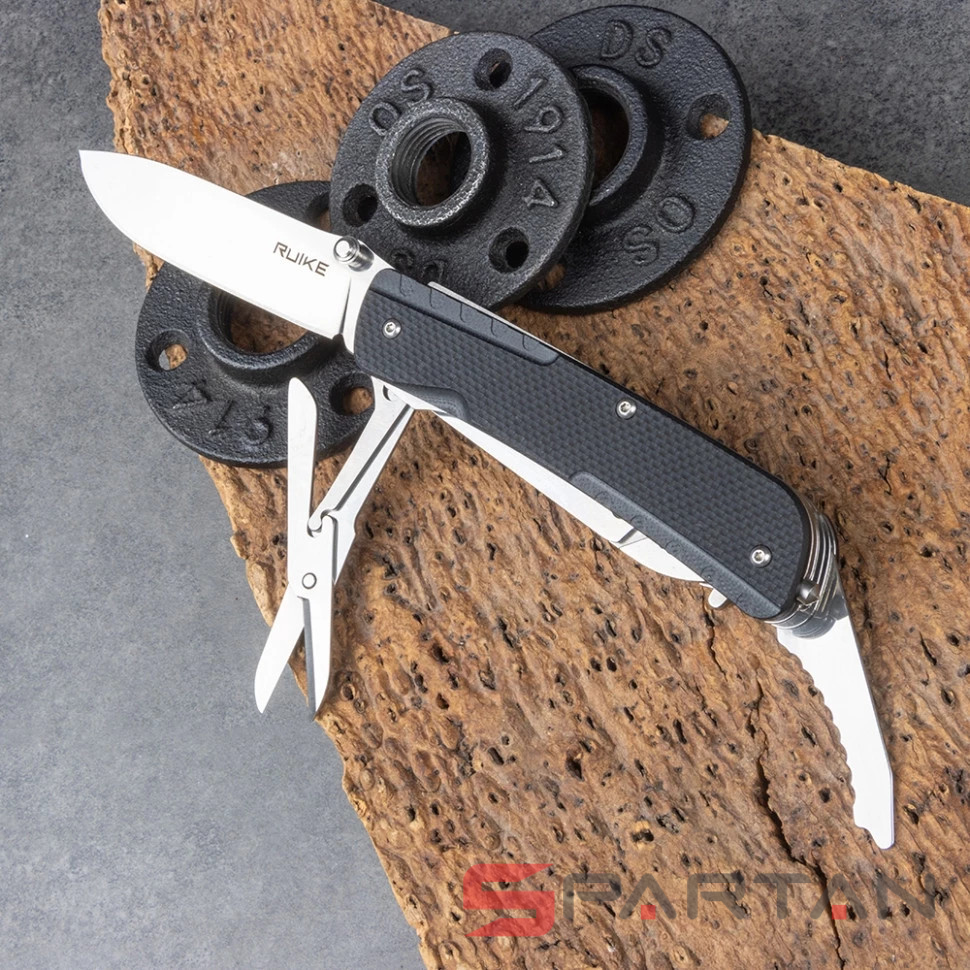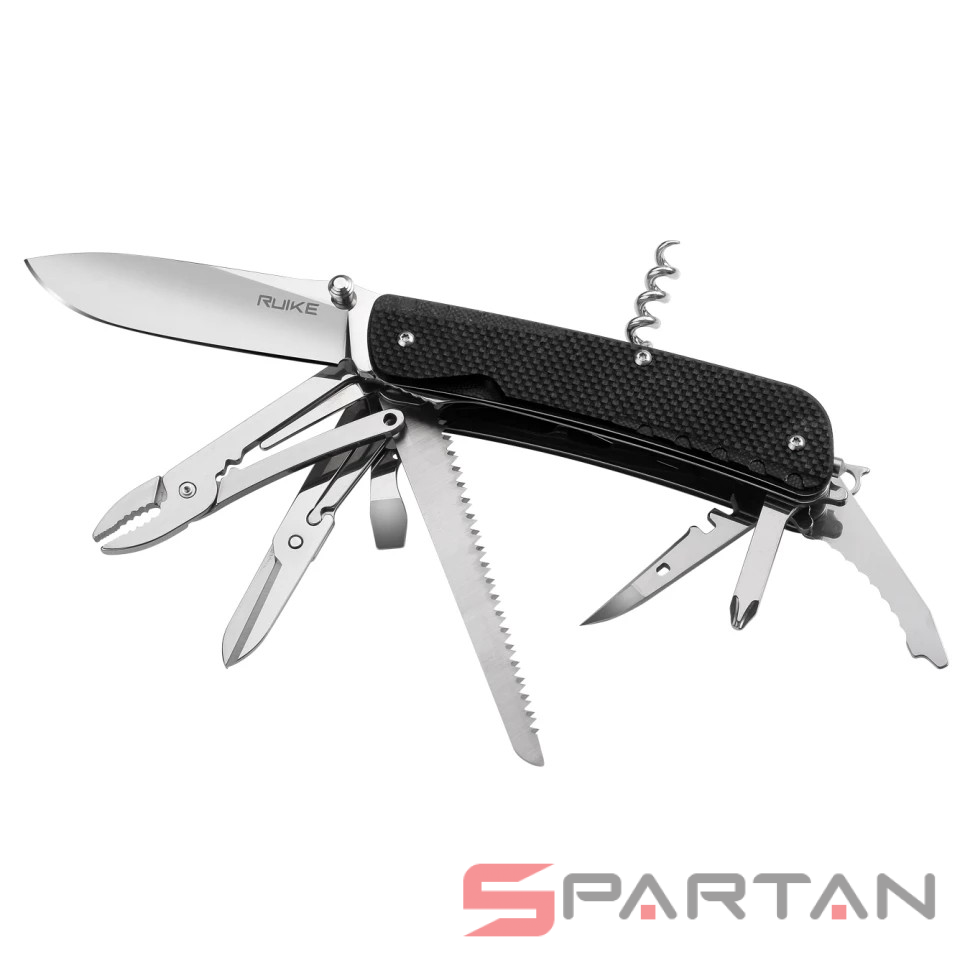 Старшая модель многопредментного ножа от RUIKE с максимальным набором инструментов - 23 штуки. Подобные ножи также называют офицерскими и "законодателем мод" в этой нише конечно является швейцарская компания Victorinox которая когда-то и выпустила первый многопредметный нож. Однако RUIKE LD51-B есть что противопоставить: шпенёк на клинке, то есть его можно открывать ОДНОЙ рукой; лучше сталь на клинке (Sandvick 12C27); наличие штатной клипсы для ношения на кармане; полноценный пинцет; стеклобой. На удивление при таком количестве инструментов внутри, RUIKE LD51-B остался достаточно компактным и не слишком тяжёлым (262 g). Туристы, милитаристы, рыбаки, охотники и просто любители активного отдыха определённо оценят этого "монстрика". Повесил на карман или бросил в сумку и полный набор полезных инструментов всегда под рукой.