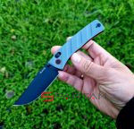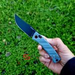 Широкий клинок выполнен в форме Drop Point с прямыми спусками практически от обуха. Половину длины клинка занимает фальш-лезвие которое образует острый кончик, при этом не ослабляя его. На обухе присутствует небольшая площадка с насечками для упора большим пальцем при силовом резе. По совокупности геометрии клинка и стали это универсальный нож который умеет хорошо резать, но при этом обладает достаточным запасом прочности.