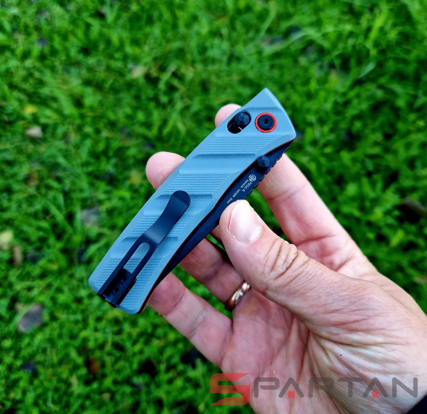 Клипса сьёмная переставляемая, отличается глубокой посадкой на карман. Как такового отверстия для темляка здесь не предусмотрено, но если присмотреться можно заметить потайной штифт. Кстати рукоять имеет открытую конструкцию, так что если в походе нож упадёт в песок или грязь, его легко можно промыть без разбора.