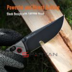 Учитывая приличную коррозионную стоикость стали Sandvik 14C28N, черное PVD-покрытие в данном случае выполняет чисто эстетическую функцию, плюс убирает предательские блики и позволяет избежать отпечатков пальцев на клинке. Фактически это вакуумное напыление, которое формируется при относительно невысоких температурах (400-600°C). Процесс включает в себя испарение металла реагирующего, например, с азотом. В результате на поверхности режущего инструмента образуется твёрдое нитридное покрытие. PVD-покрытие чрезвычайно плотно и равномерно прилегает к основе, не содержит микротрещин, является защитным слоем устойчивым к истиранию, царапинам, ударам и механическим воздействиям.