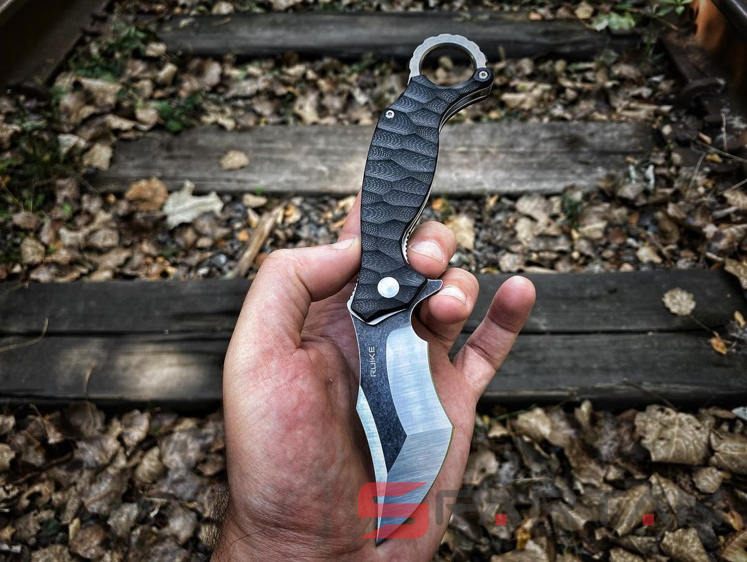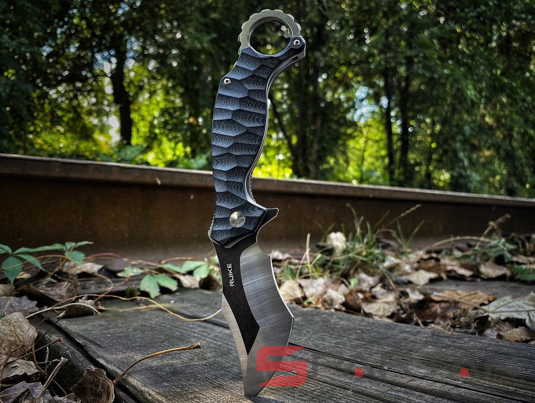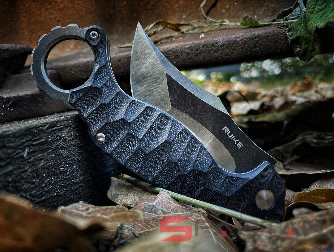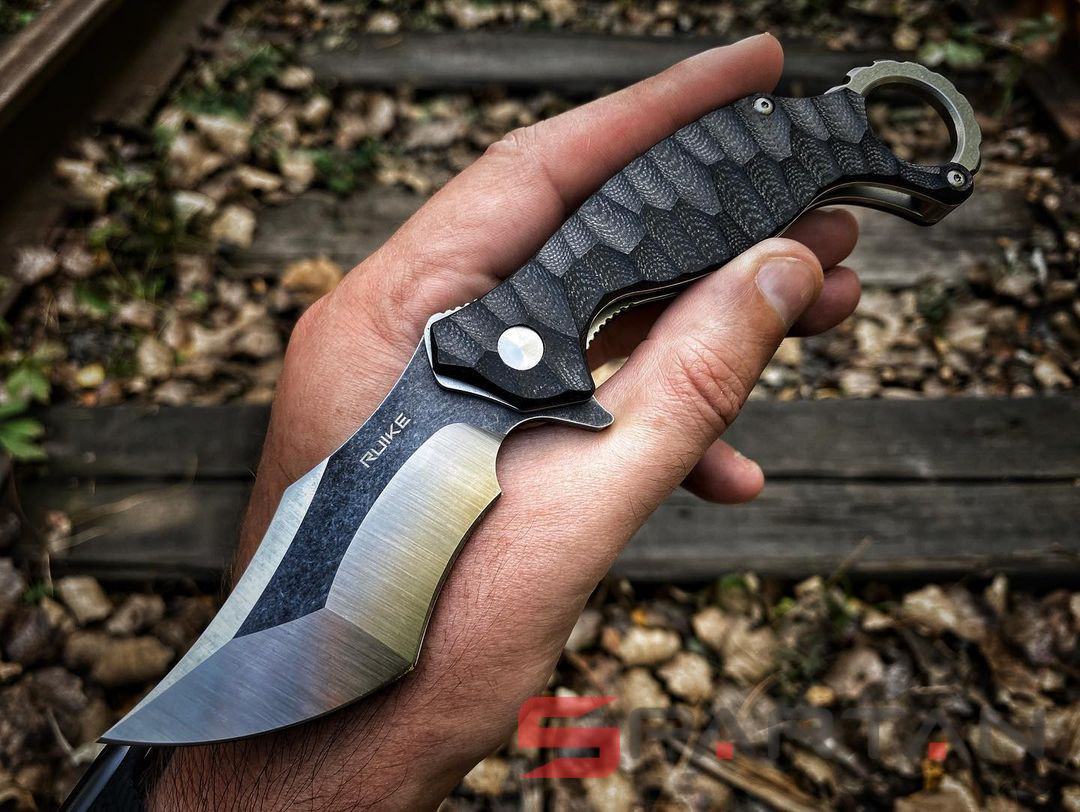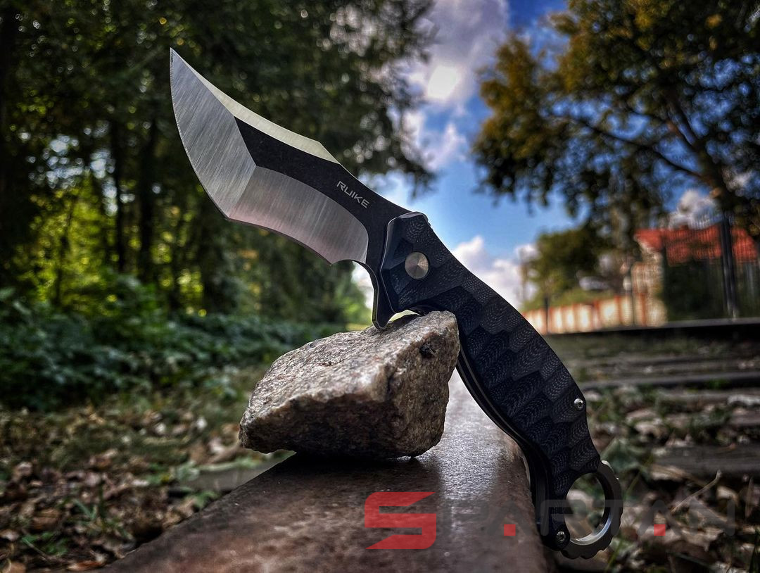 Достаточно компактный, но очень злюче выглядящий карманный керамбит. Чисто внешне RUIKE P881 напоминает "дикого кота" от Boker (Wildcat), но при ближайшем рассмотрении RUIKE P881 более агрессивен и необычен. Широченный клинок с двумя режущими кромками своими изгибами напоминает коготь какой-то птицы. Обработка плашек G10 на рукояти оформлена в "каменном" стиле. Клипса глубокой посадки позволяет утопить нож на кармане так, что торчит только кольцо, которое покрыто крупным рифлением. Открывается клинок при помощи плавника-флиппера - нужно подтолкнуть его указательным пальцем и он мгновенно откроется с сочным щелчком. Благодаря подшипникам создается ощущение что применён доводчик клинка, настолько он резкий. По размерам RUIKE P881 отлично подходит для стандартной мужской руки, при различных хватах рукояти всегда хватает.