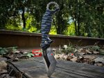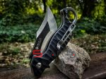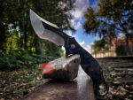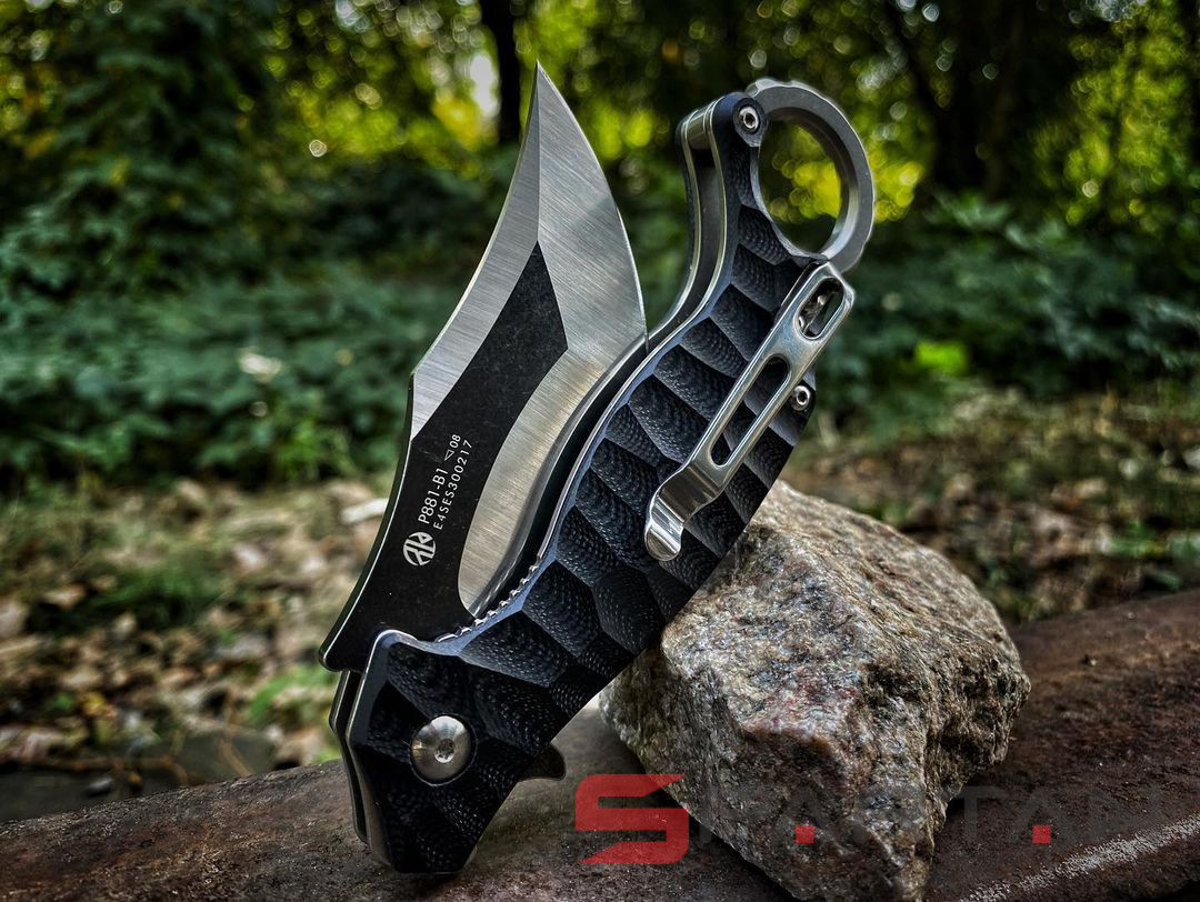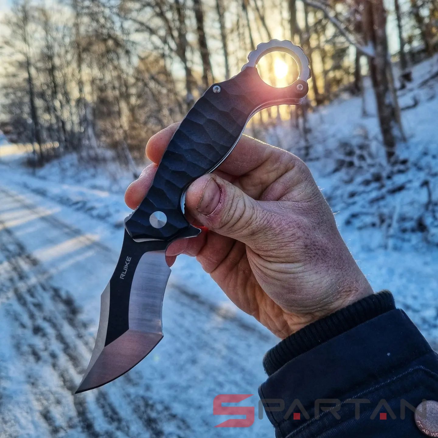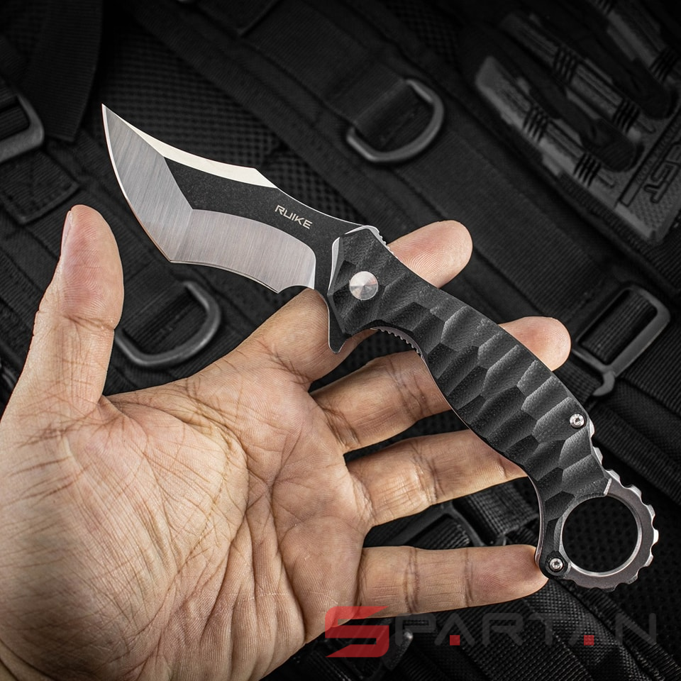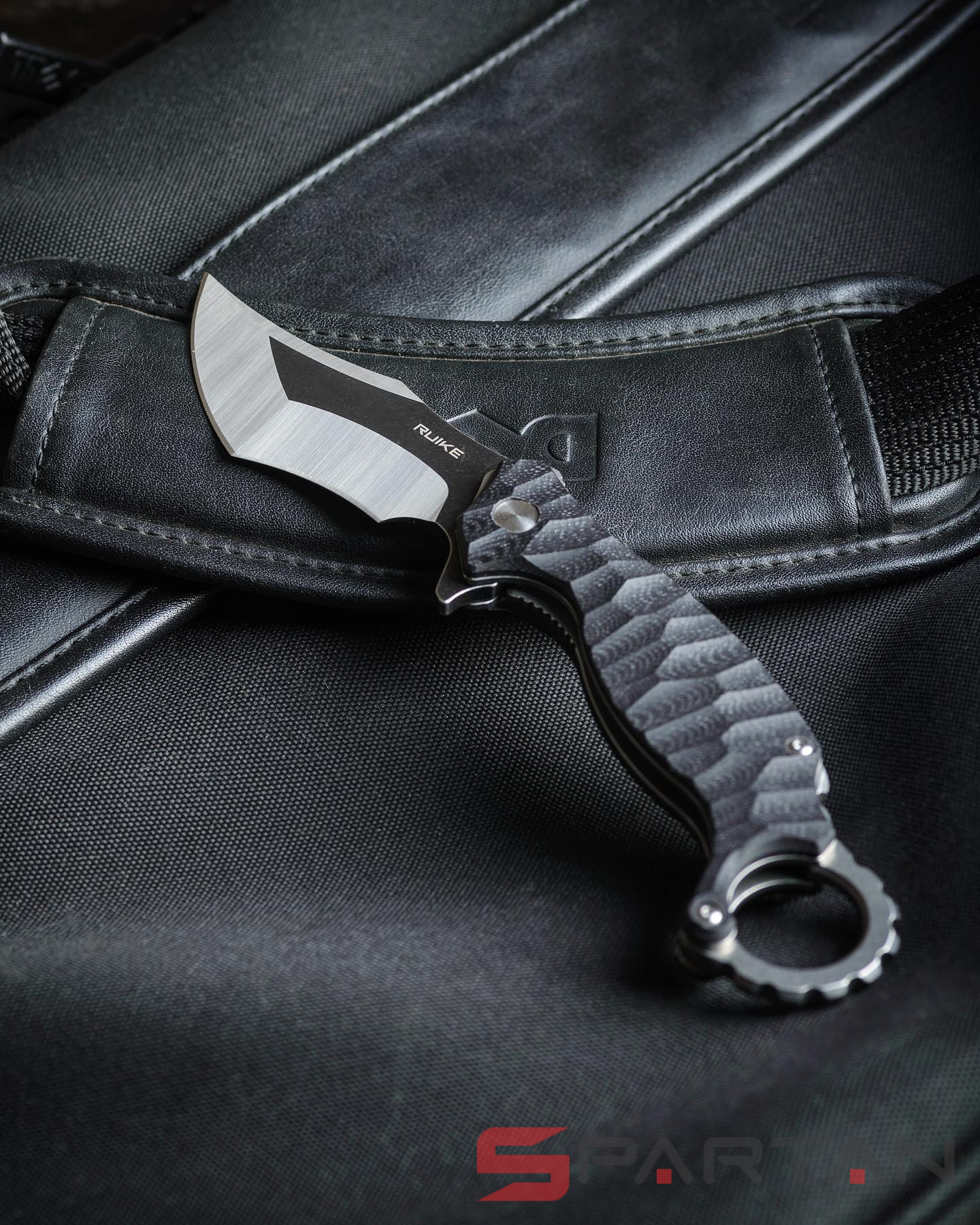Достаточно компактный, но очень злюче выглядящий карманный керамбит. Чисто внешне RUIKE P881 напоминает "дикого кота" от Boker (Wildcat), но при ближайшем рассмотрении RUIKE P881 более агрессивен и необычен. Широченный клинок с двумя режущими кромками своими изгибами напоминает коготь какой-то птицы. Обработка плашек G10 на рукояти оформлена в "каменном" стиле. Клипса глубокой посадки позволяет утопить нож на кармане так, что торчит только кольцо, которое покрыто крупным рифлением. Открывается клинок при помощи плавника-флиппера - нужно подтолкнуть его указательным пальцем и он мгновенно откроется с сочным щелчком. Благодаря подшипникам создается ощущение что применён доводчик клинка, настолько он резкий. По размерам RUIKE P881 отлично подходит для стандартной мужской руки, при различных хватах рукояти всегда хватает.