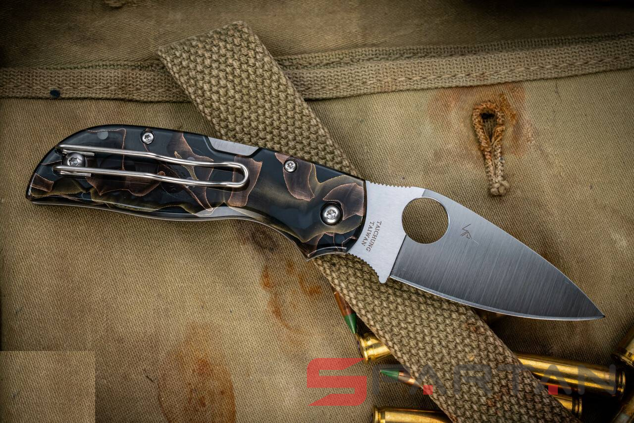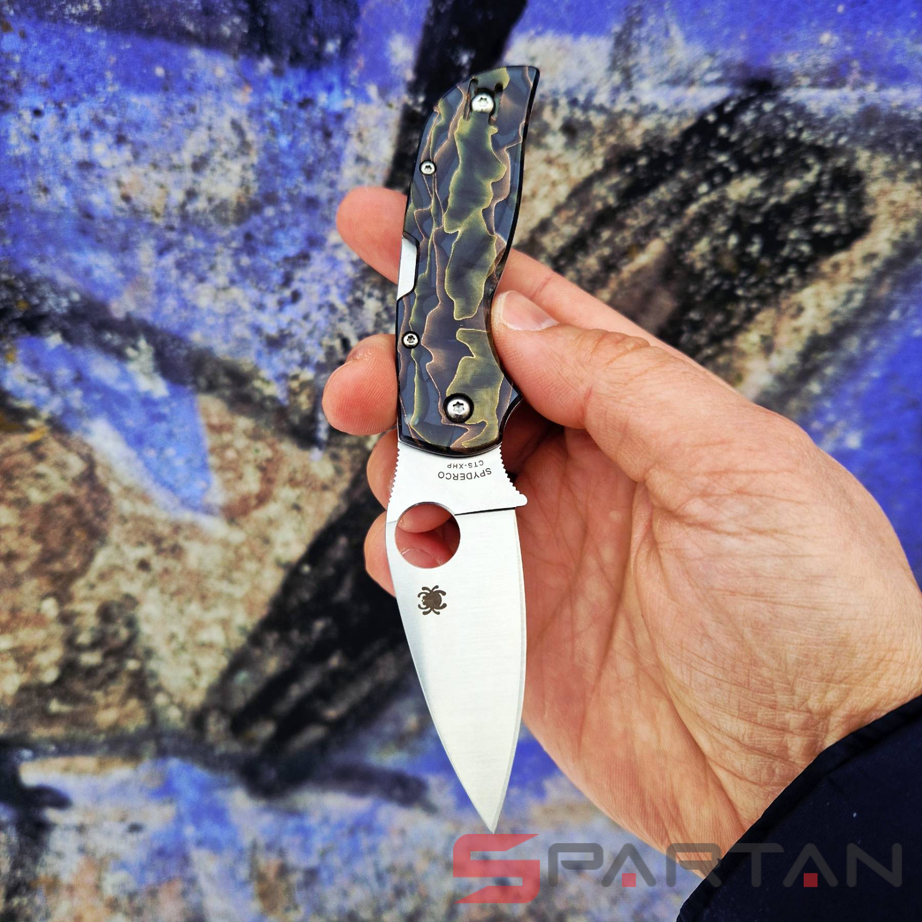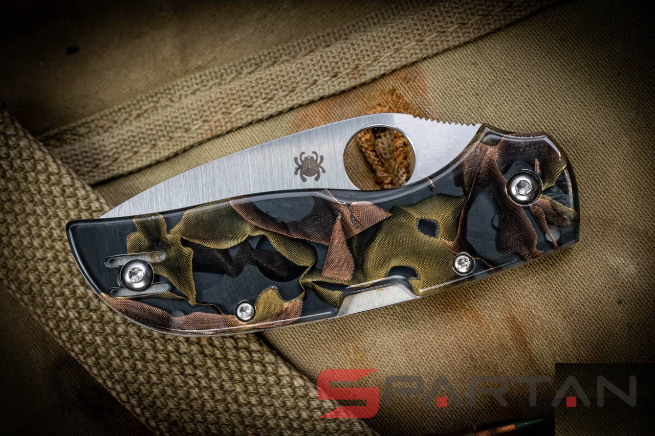Главная особенность Spyderco Chaparral это конечно накладки из композитного материала Raffir Noble. Это прозрачный полимер с инкрустацией латунной сетки, создающей эффект глубины и объёма. Рукоять играет на свету и выглядит как дизайнерский аксессуар, оставаясь при этом прочной и устойчивой к влаге. Каждый нож имеет индивидуальный рисунок - двух абсолютно одинаковых экземпляров не существует.