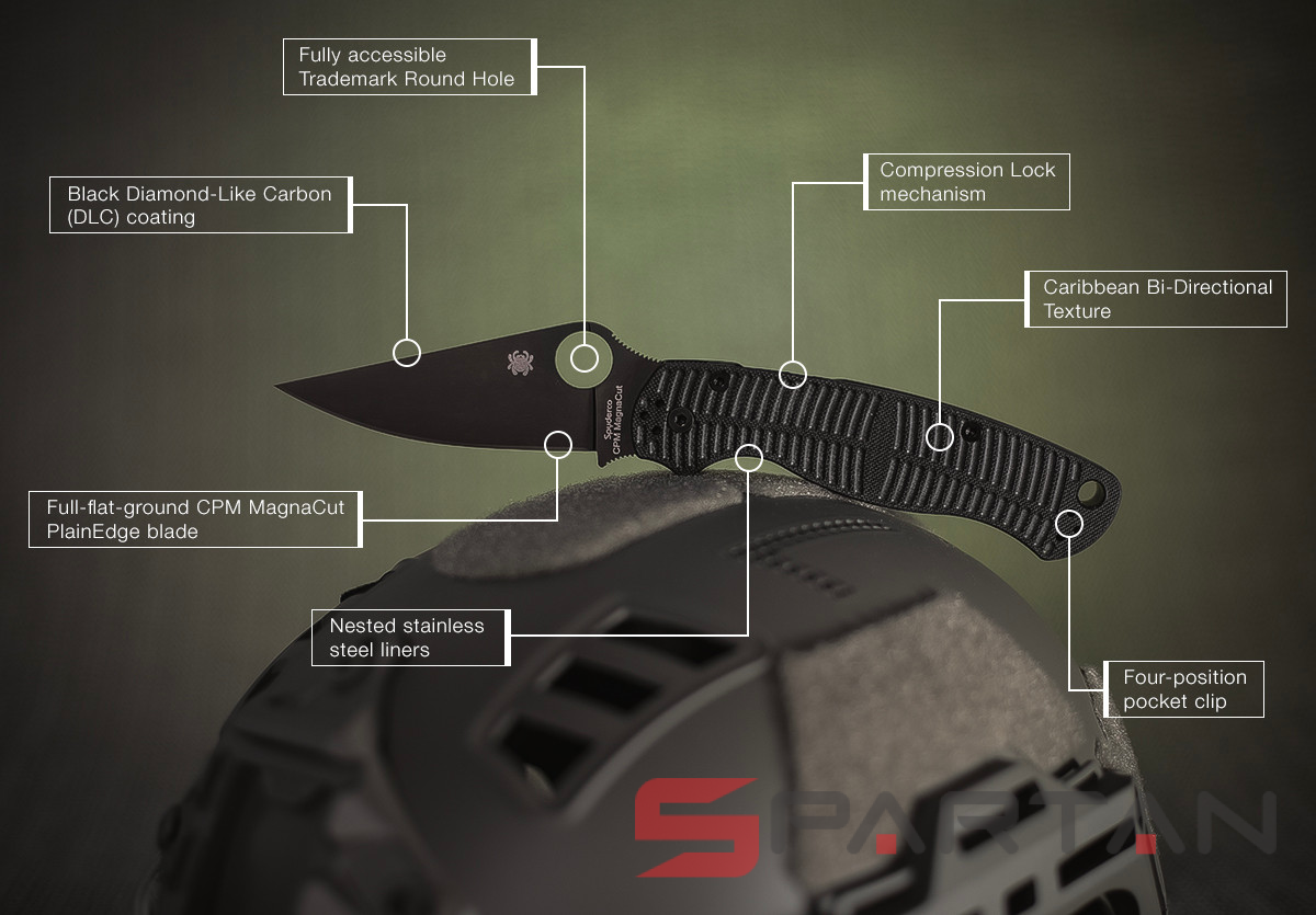 Отдельно стоит упомянуть чёрное DLC-покрытие (Diamond-Like Coating) клинка. Это алмазоподобное углеродное покрытие состоящее из атомов углерода с алмазными и графитоподобрыми связями. В первую очередь такое покрытие повышает уровень износостойкости металла и увеличивает защиту от коррозии. Ну и как приятное дополнение чёрный DLC позволяет избежать лишних следов использования и гасит блики.