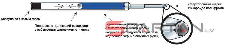 Пишущий шарик стержня выполнен из карбида вольфрама и очень точно установлен в наконечнике стержня, чтобы избежать протекания. Чернила тиксотропны — твердые в обычном состоянии, они разжижаются при письме. Сами чернила находятся в специальном картридже под давлением сжатого азота, который отделен от чернил скользящим поплавком.