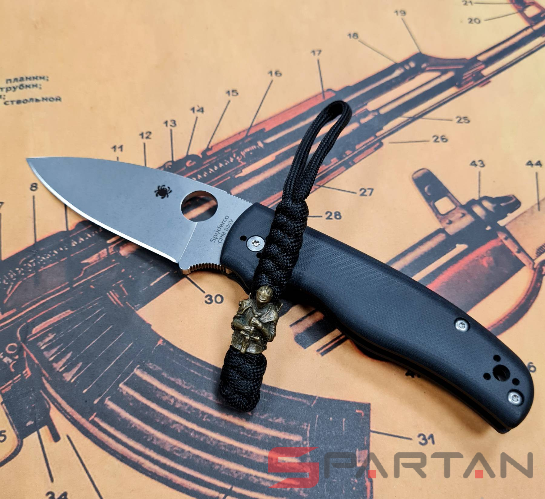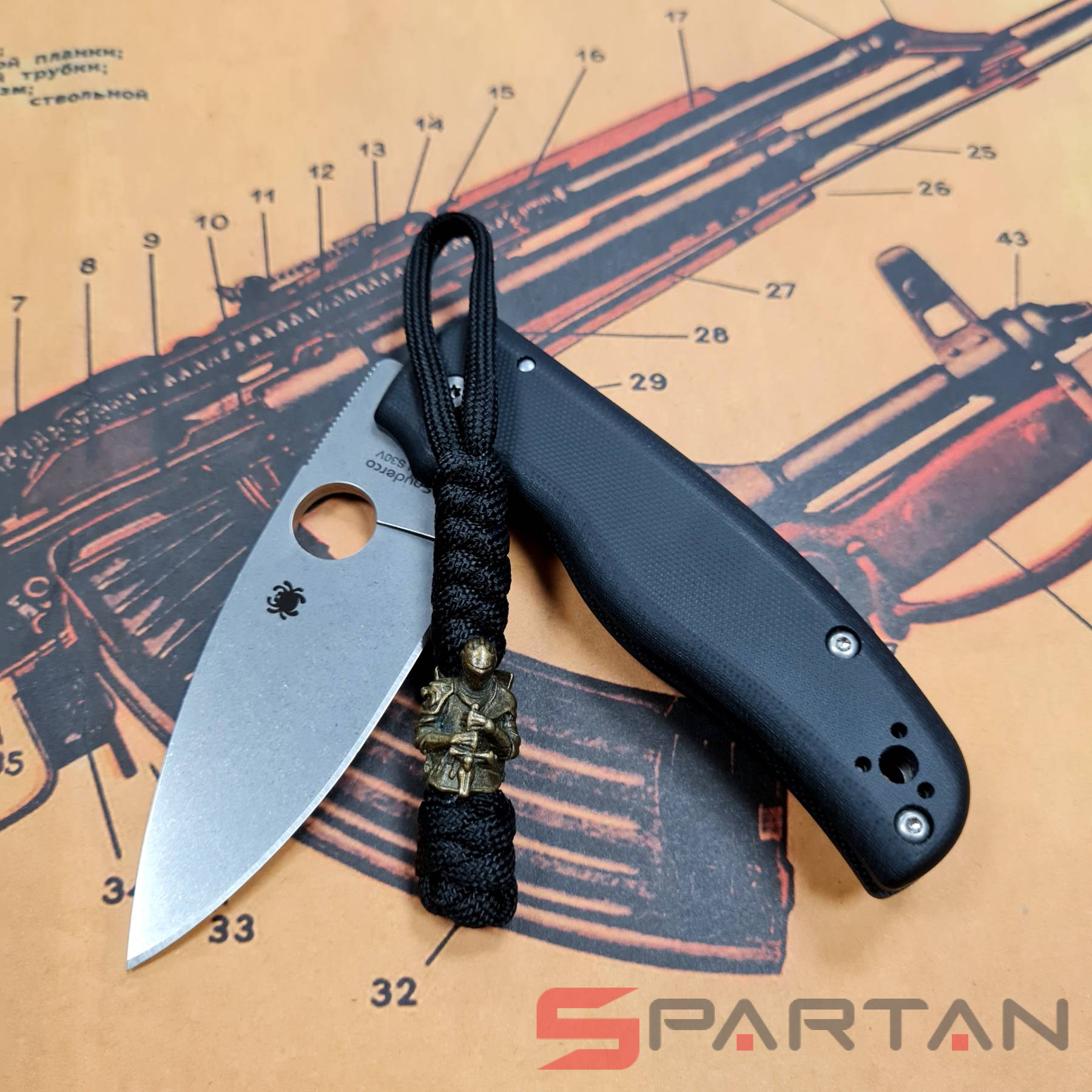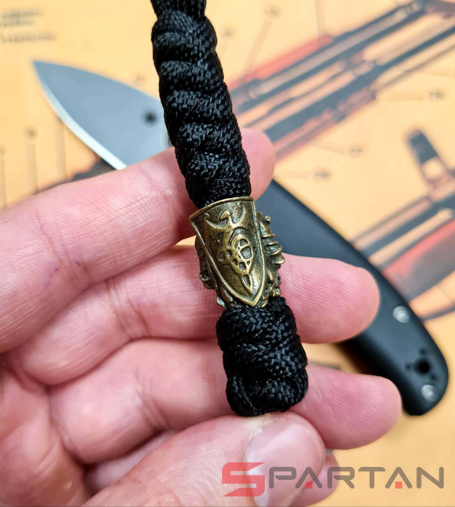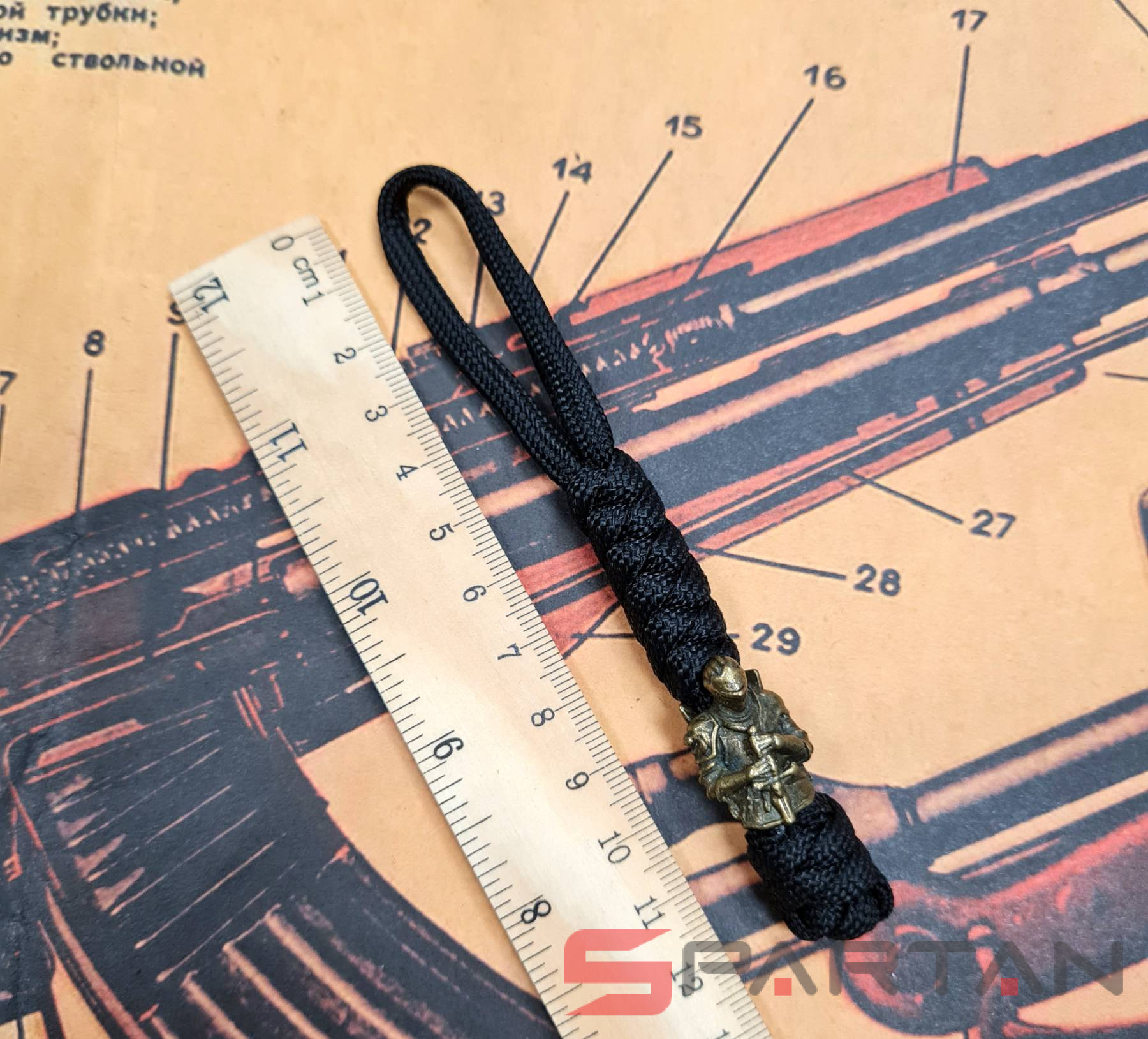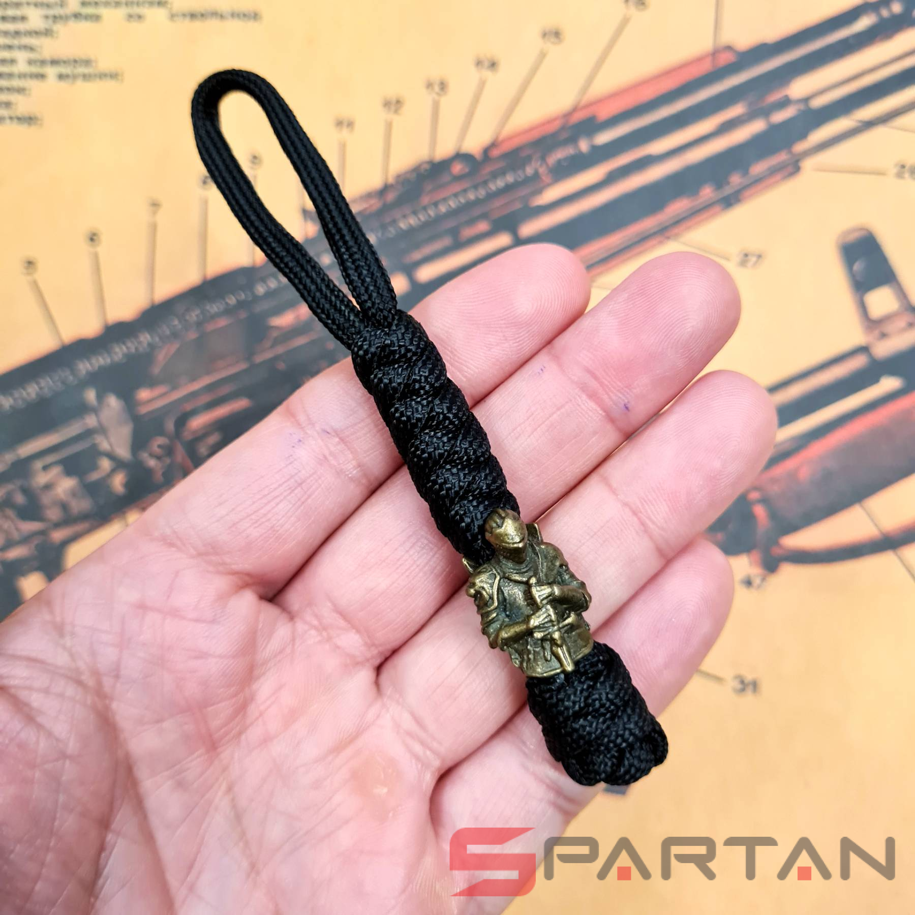 Стильный и оригинальный темляк из паракорда. Бусина из латуни в виде рыцаря со щитом на спине. Предназначен для подвеса на нож, для более удобного и быстрого его извлечения из кармана или ножен. Кроме того, увеличивает надёжность удержания ножа в руке. Стильный аксессуар также частенько используют в качестве брелка для ключей, сумки, фонаря. Полностью ручная работа, существует в единственном экземпляре. Модная тема среди любителей EDC-ножеманов.