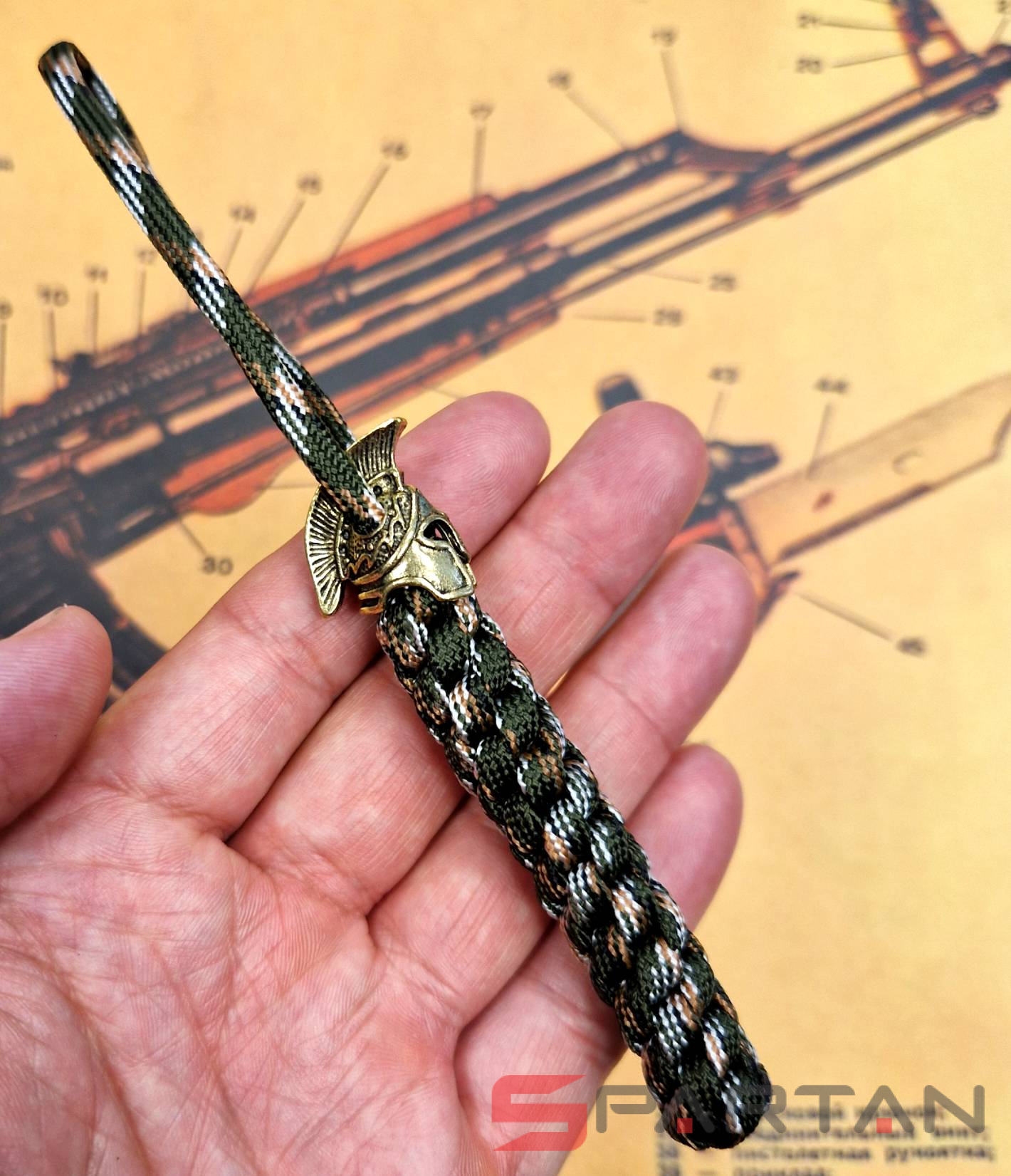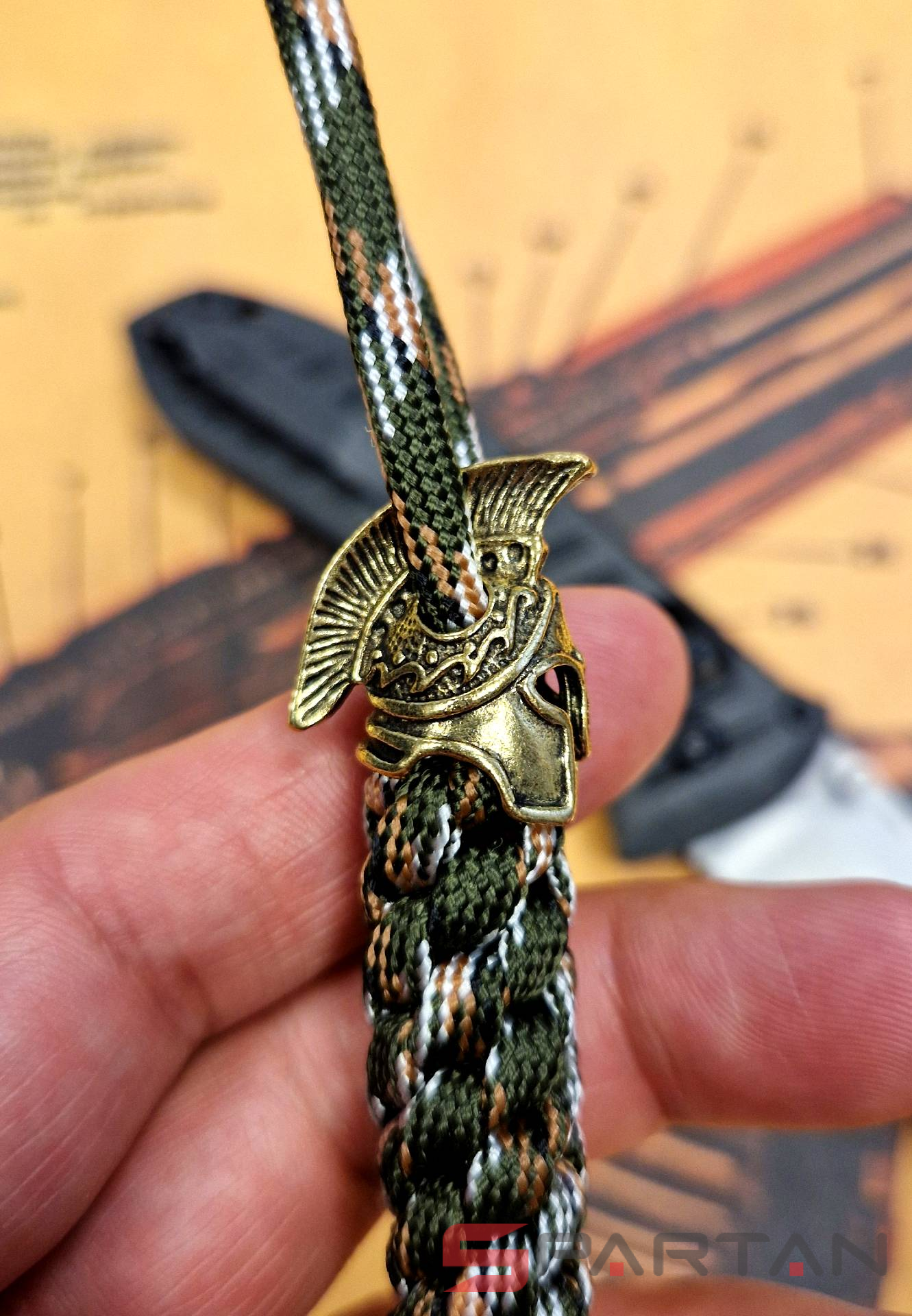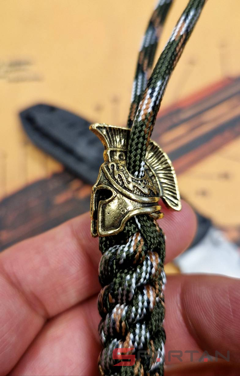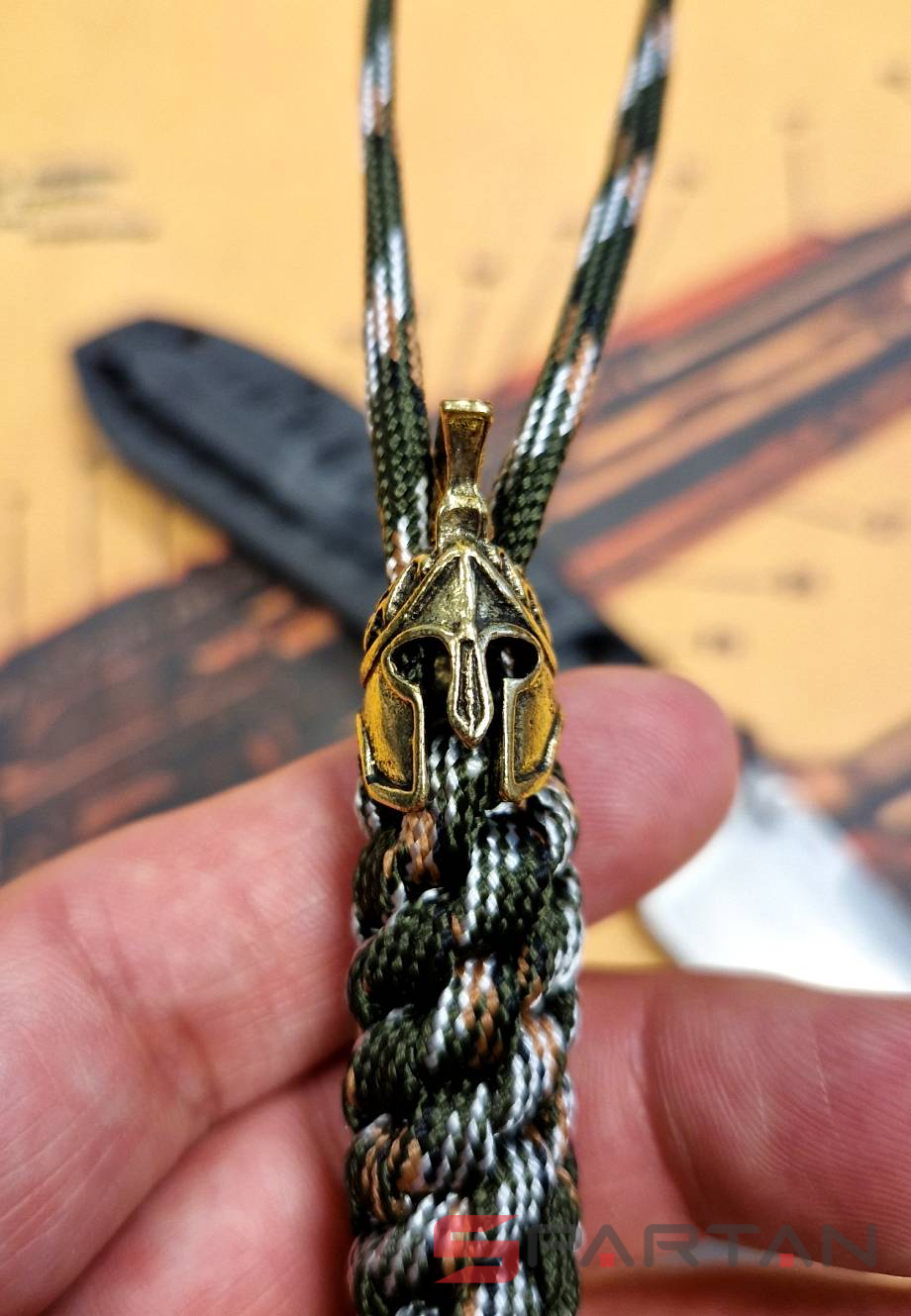 Стильный и оригинальный темляк из паракорда. Бусина из латуни в виде боевого шлема спартанцев. Предназначен для подвеса на нож, для более удобного и быстрого его извлечения из кармана или ножен. Кроме того, увеличивает надёжность удержания ножа в руке. Стильный аксессуар также частенько используют в качестве брелка для ключей, сумки, фонаря. Полностью ручная работа, существует в единственном экземпляре. Модная тема среди любителей EDC-ножеманов.
